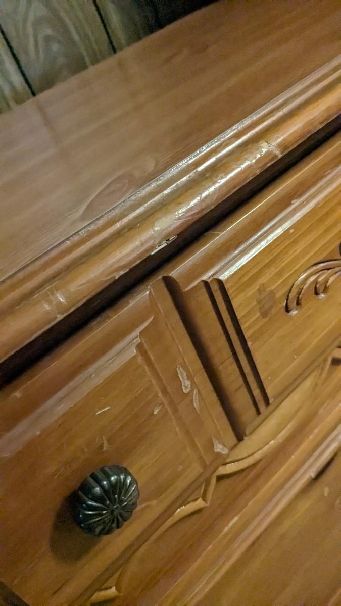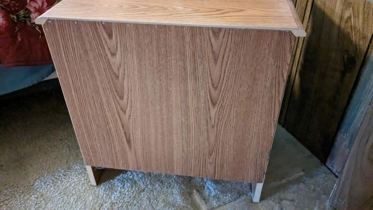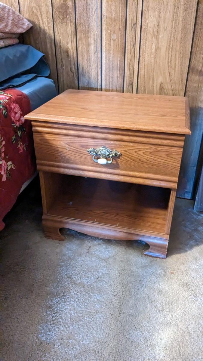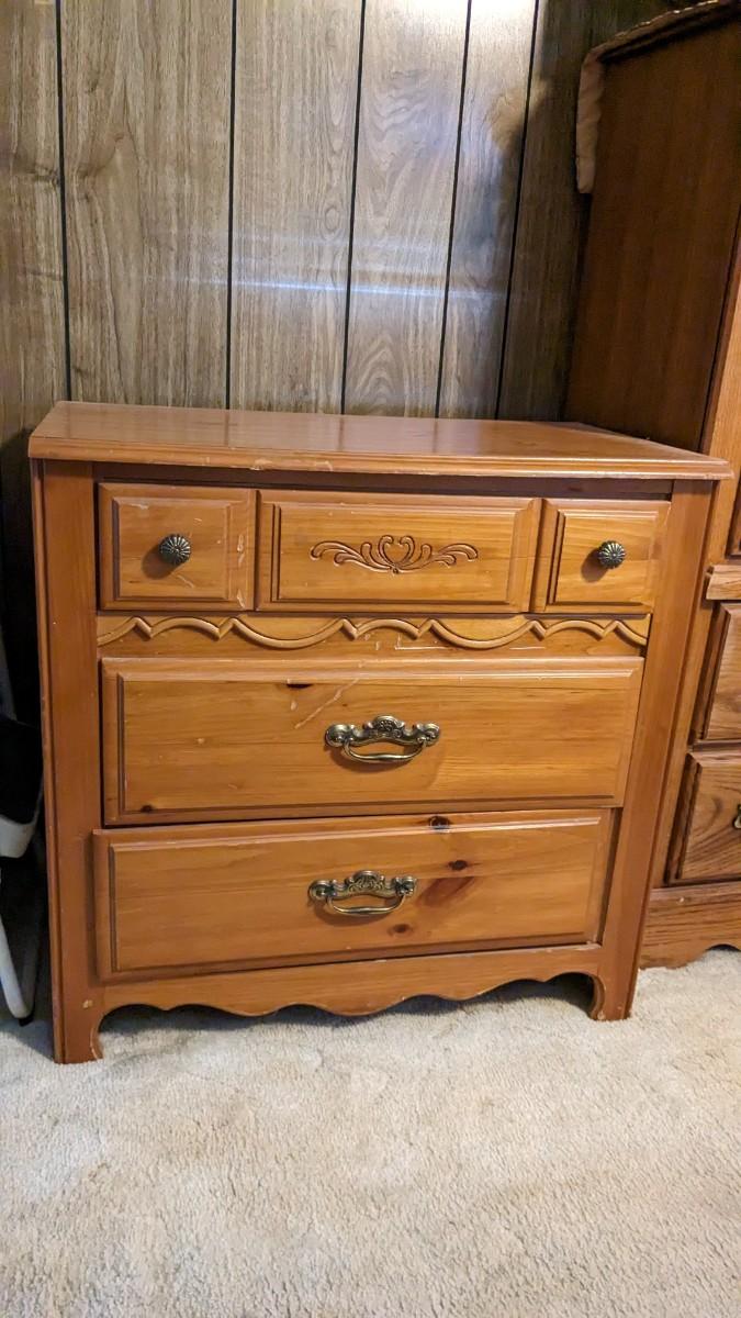 2 pieces, 3 drawer piece is 30"x18"x29.75" by Lea Furniture. The other is a small 20 5/8"x15.75"x21" unmarked piece. Both in great shape with a ton of life and use left!