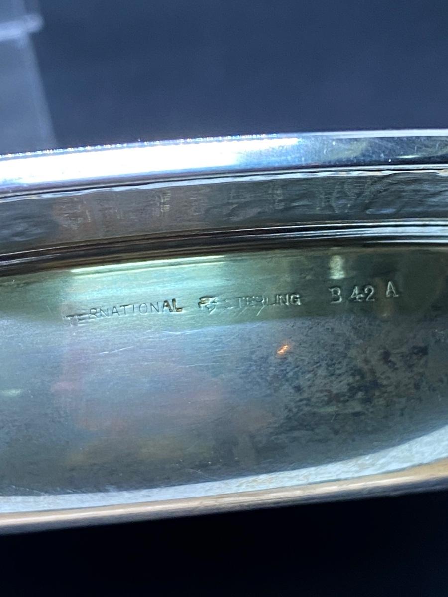 Small sterling silver handled bon bon basket. Beautifully designed edge. Handle folds down. Made by International Sterling, marked along the side. About 6" diameter.