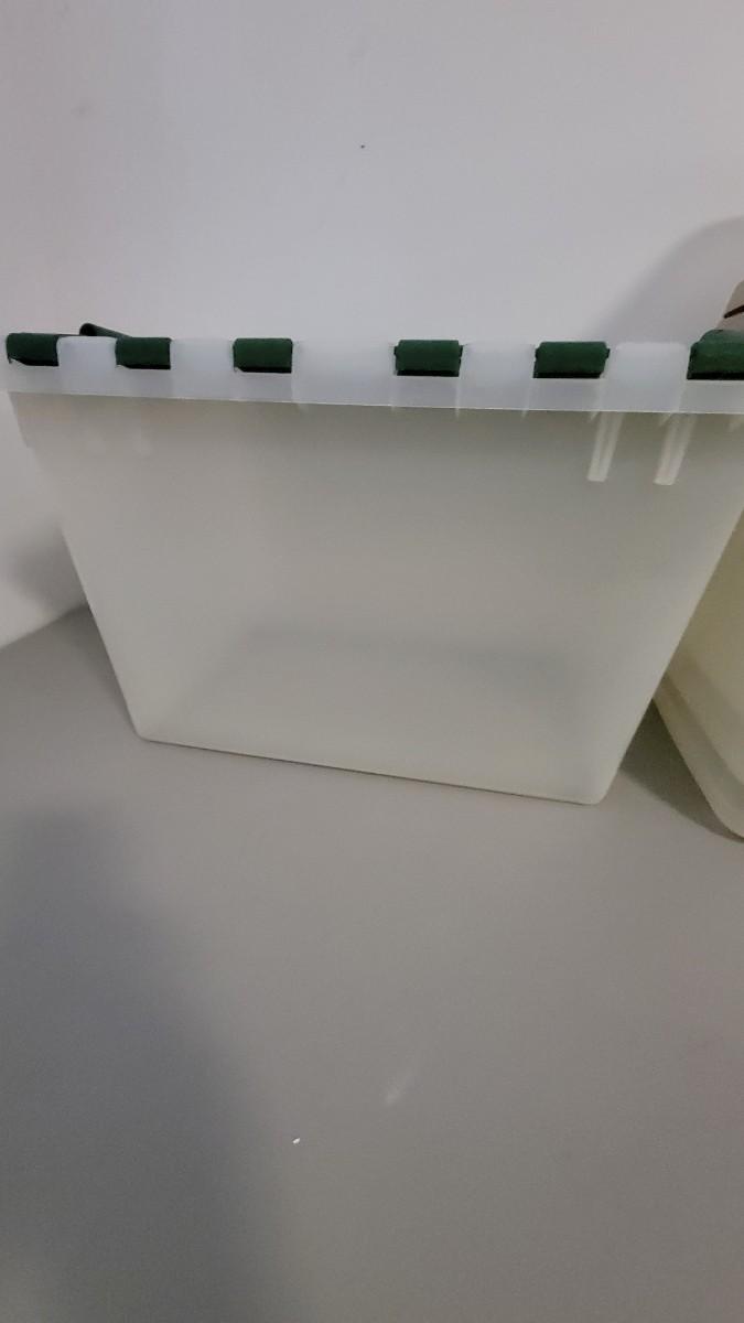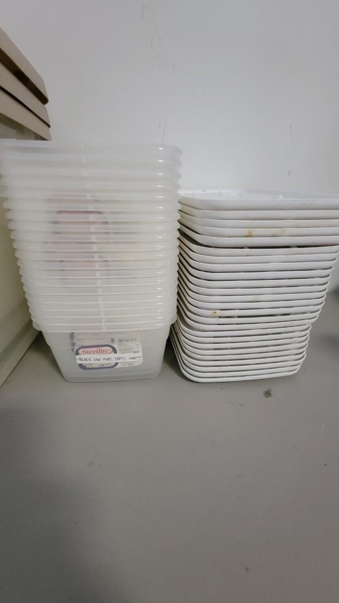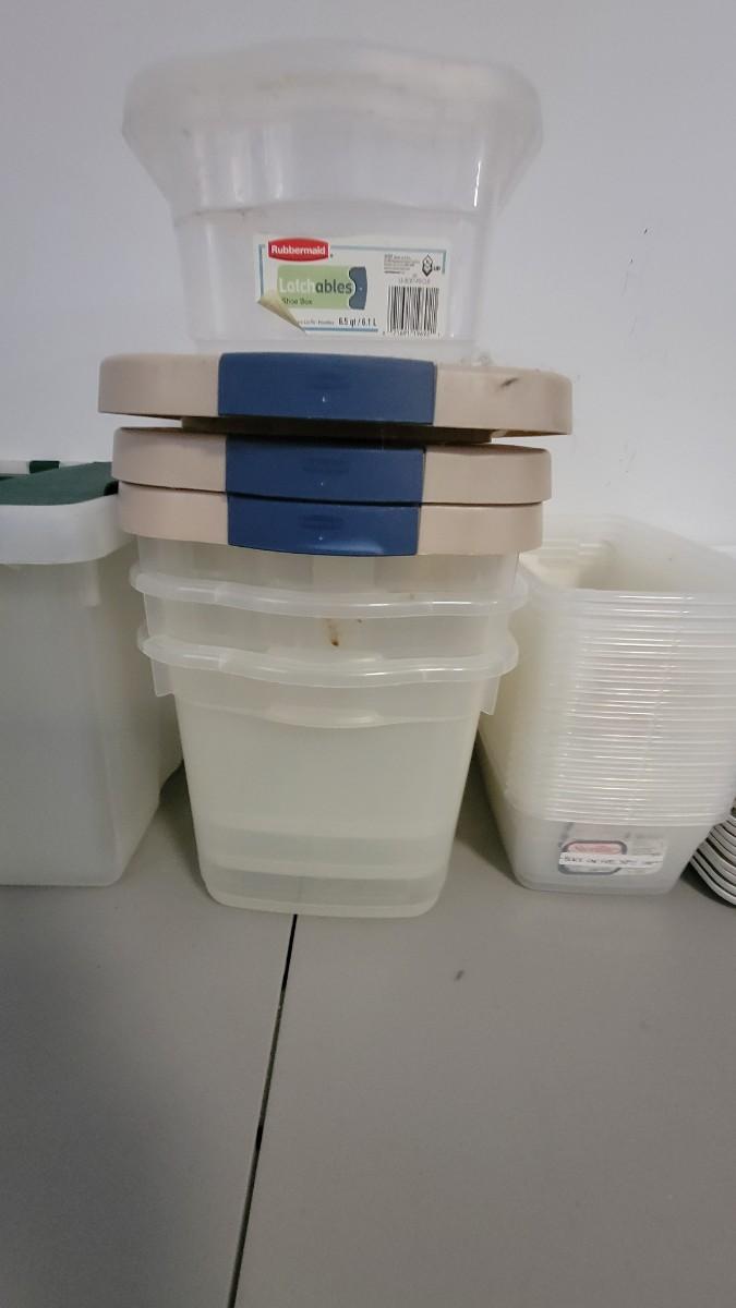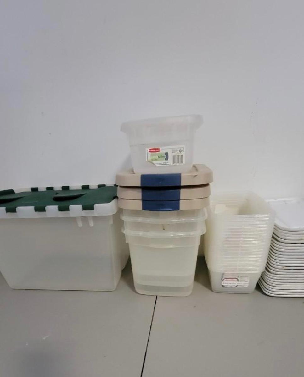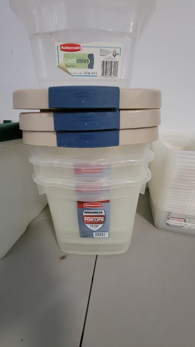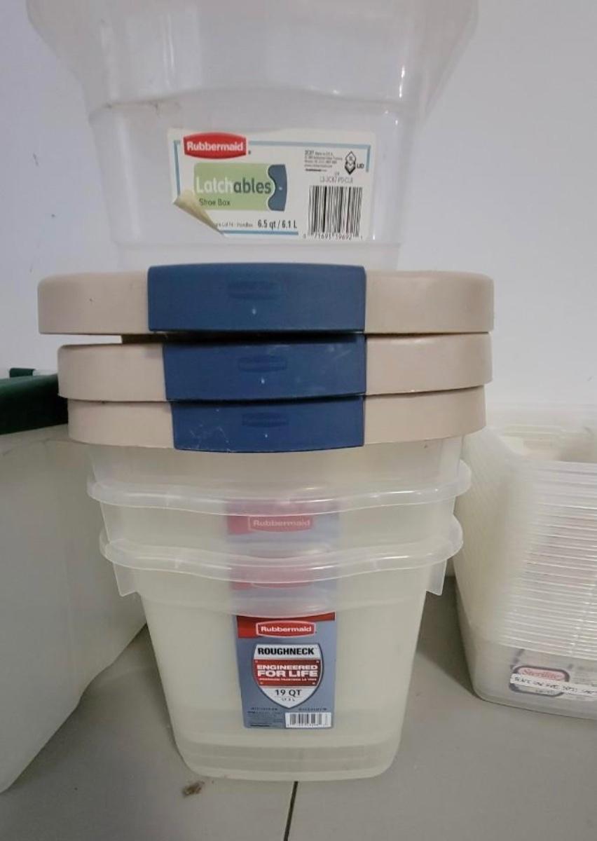An assortment of smaller storage bins. The largest bin measures approximately 22" x 16" x 14". 3 Rubbermaid containers 19 qt and 21 shoe box containers with lids. Local pickup only