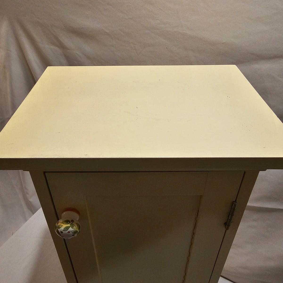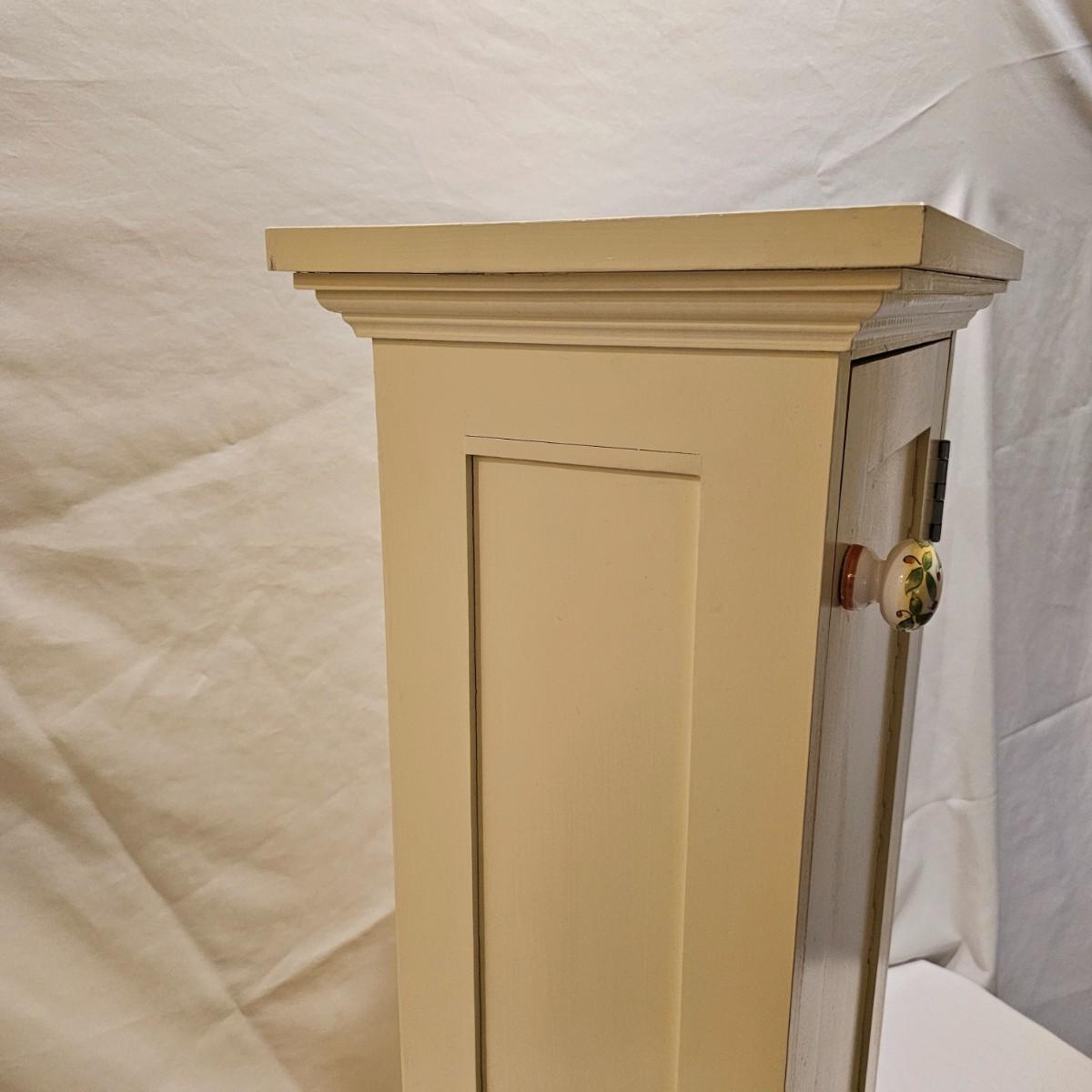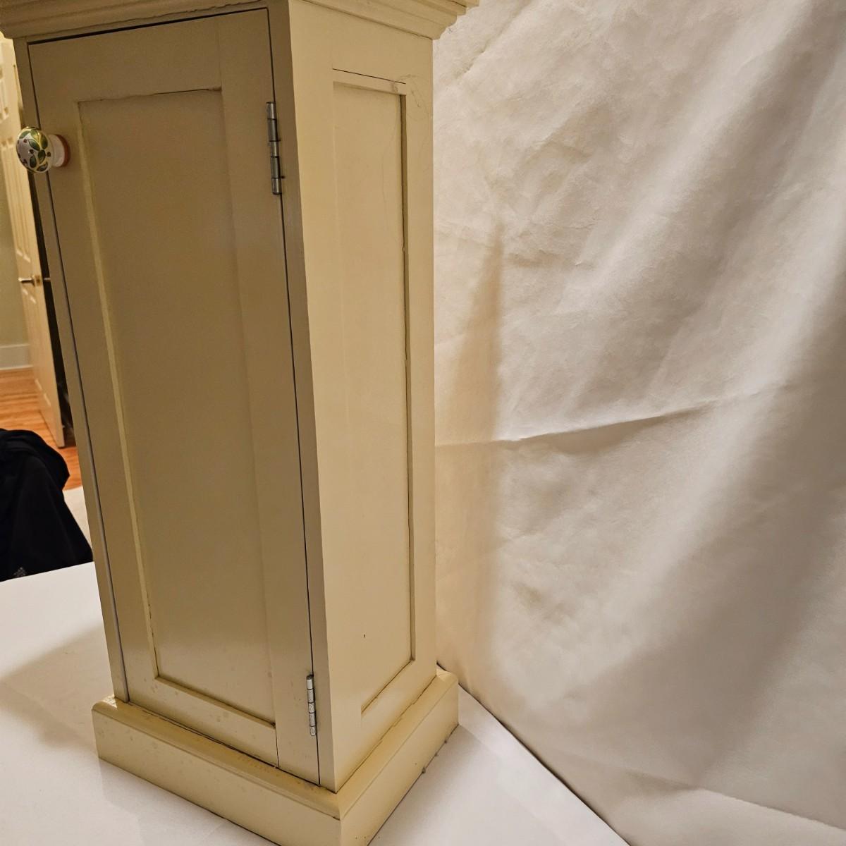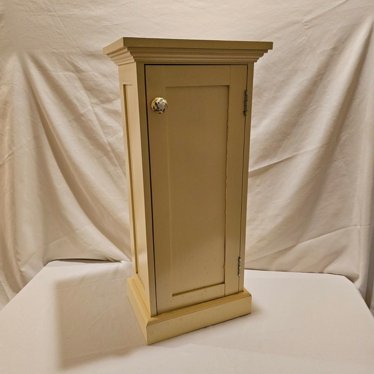 A small wooden storage cabinet painted pastel yellow. Ceramic painted knob on door opens to reveal space for two shelves, included. Two additional support pegs needed. Cabinet measures 15" x 11" x 32"H. See photos for details. Local pickup only.