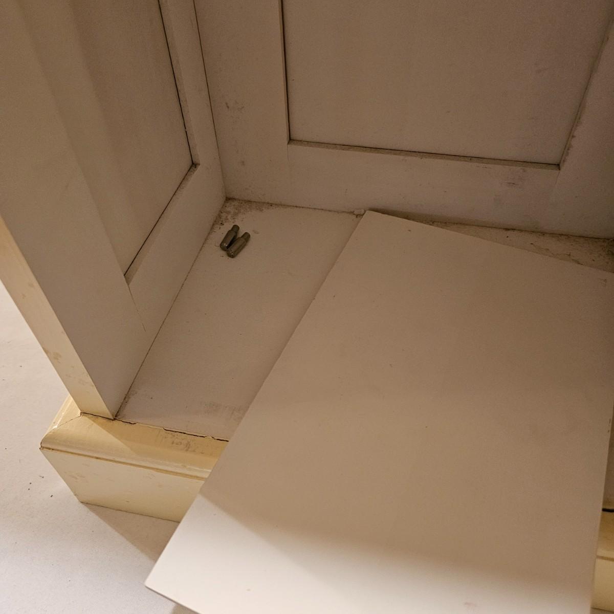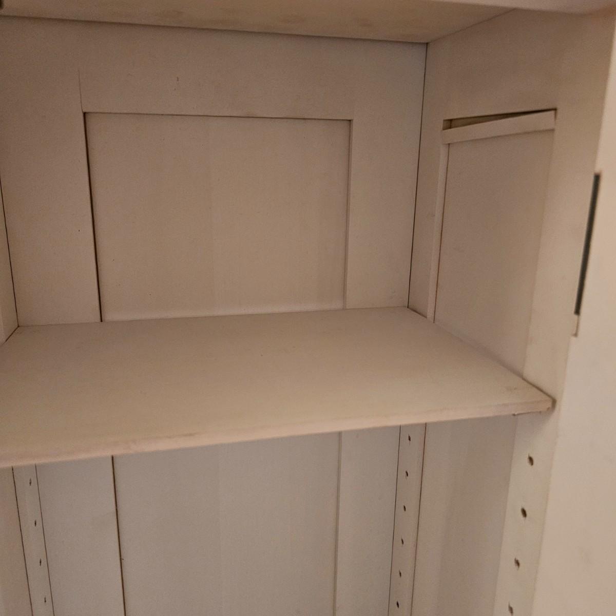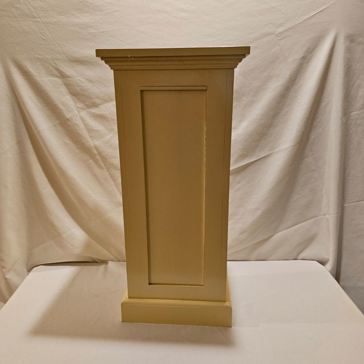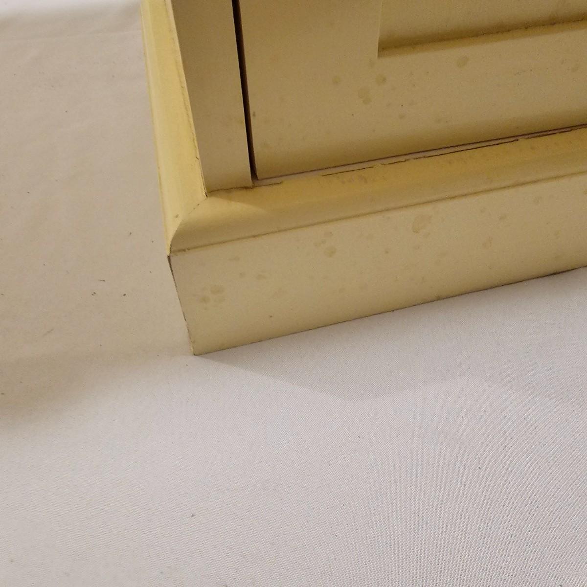 A small wooden storage cabinet painted pastel yellow. Ceramic painted knob on door opens to reveal space for two shelves, included. Two additional support pegs needed. Cabinet measures 15" x 11" x 32"H. See photos for details. Local pickup only.