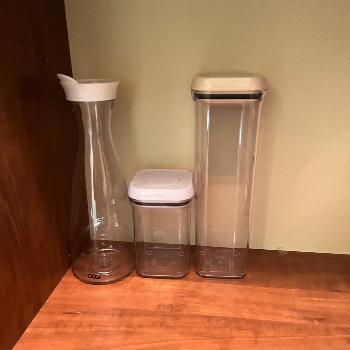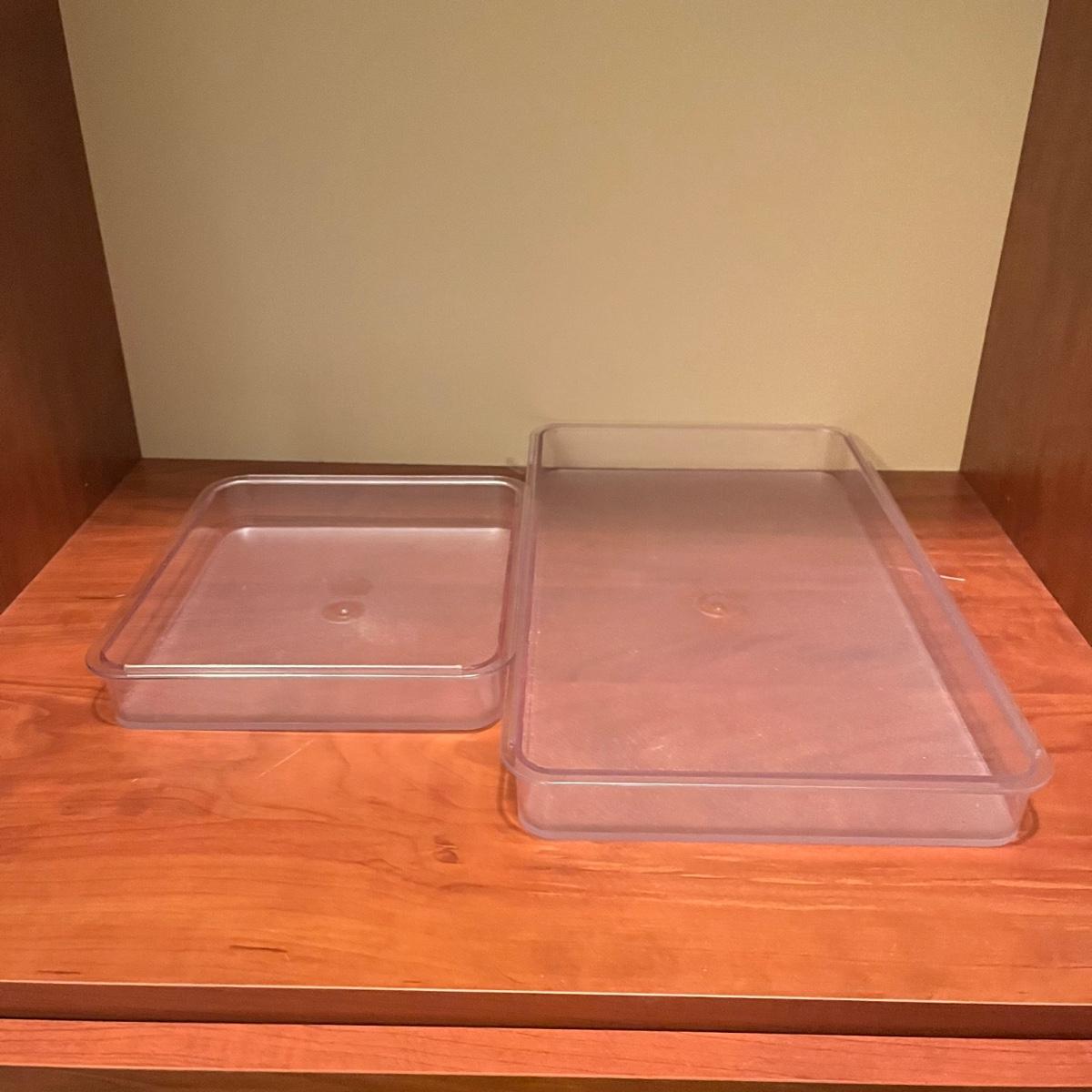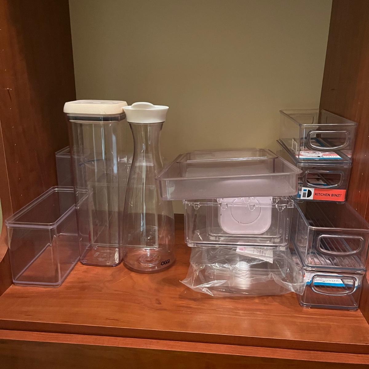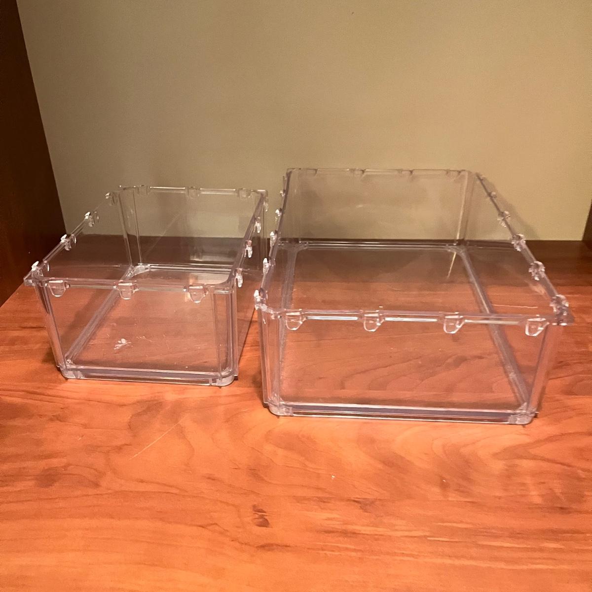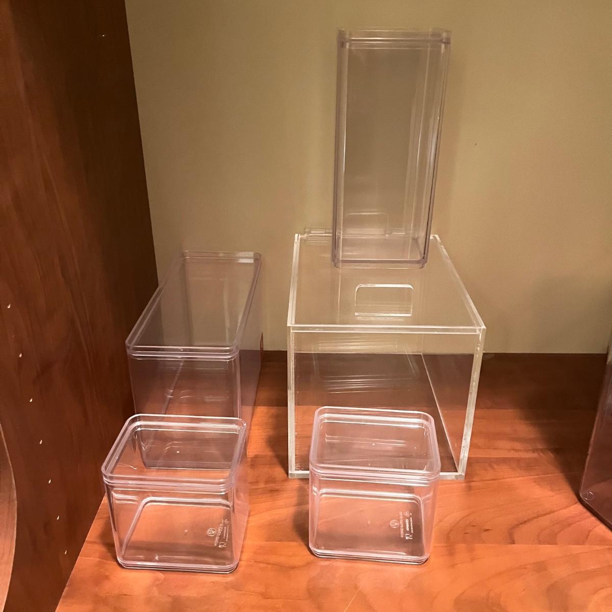 Lot includes a variety of storage containers in an assortment of sizes and shapes. Also includes acrylic box that measures 6” x 9” x 6”H.