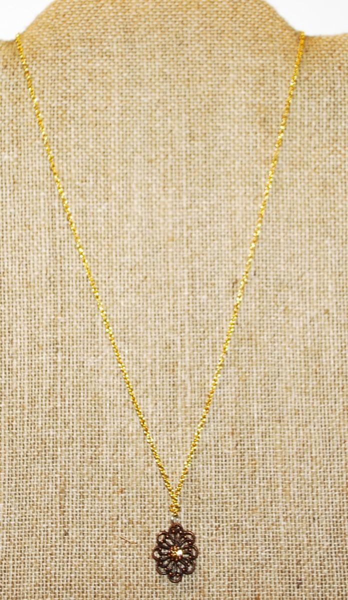 Small Swirled Brown PENDANT (¾" x ½") with Brown/Amber Center Stone on a Gold Tone Necklace Chain 18" L