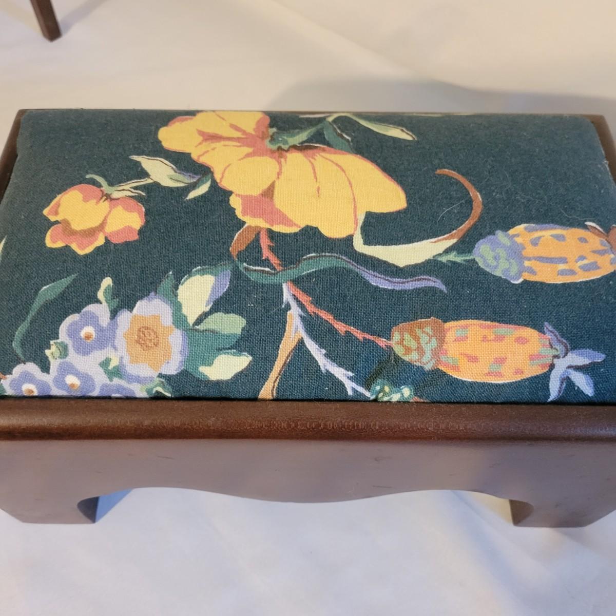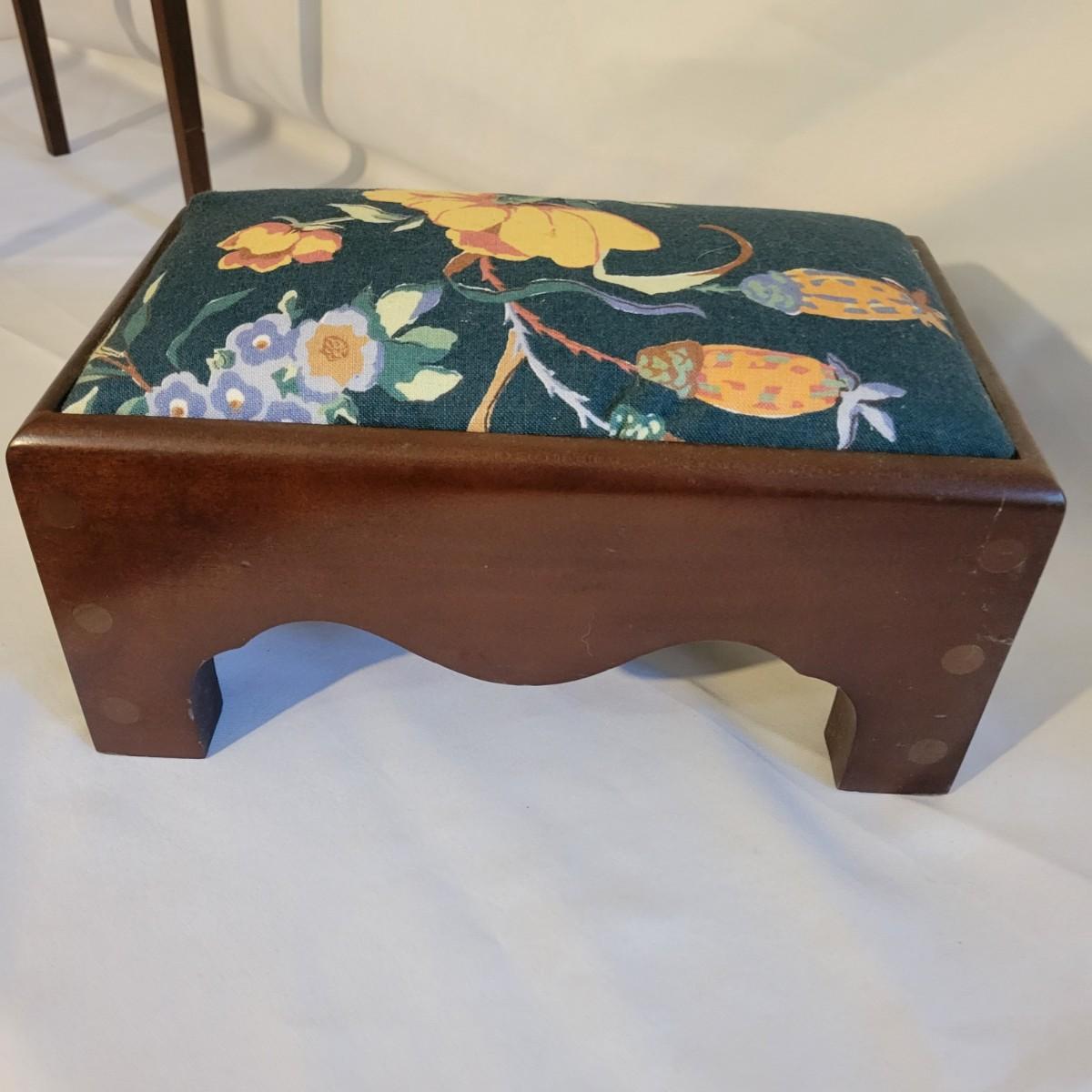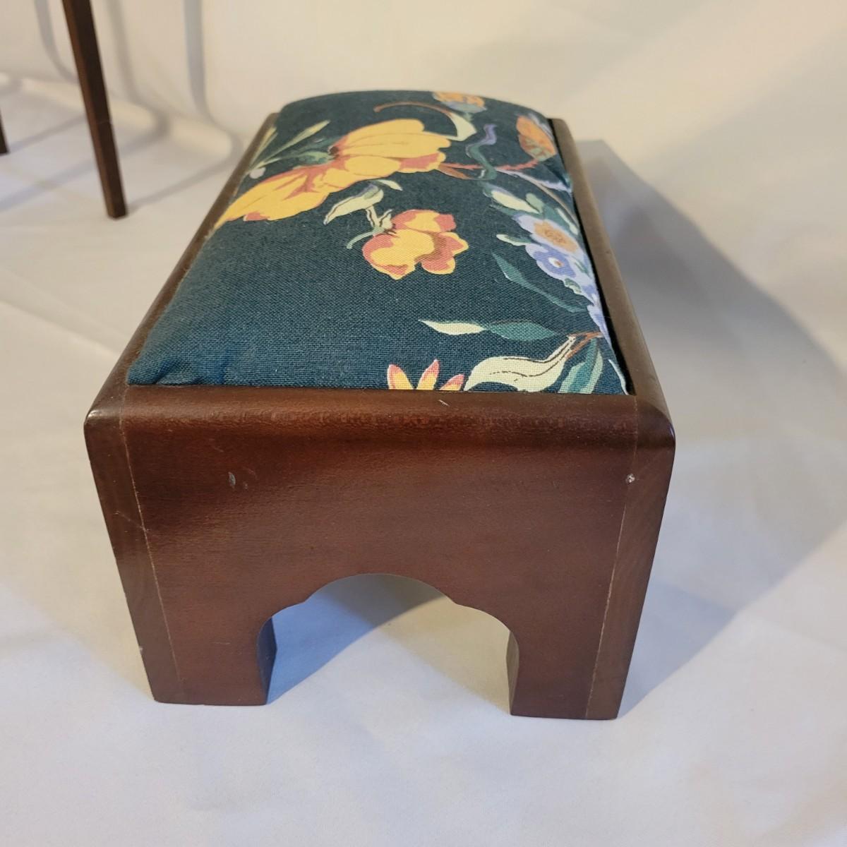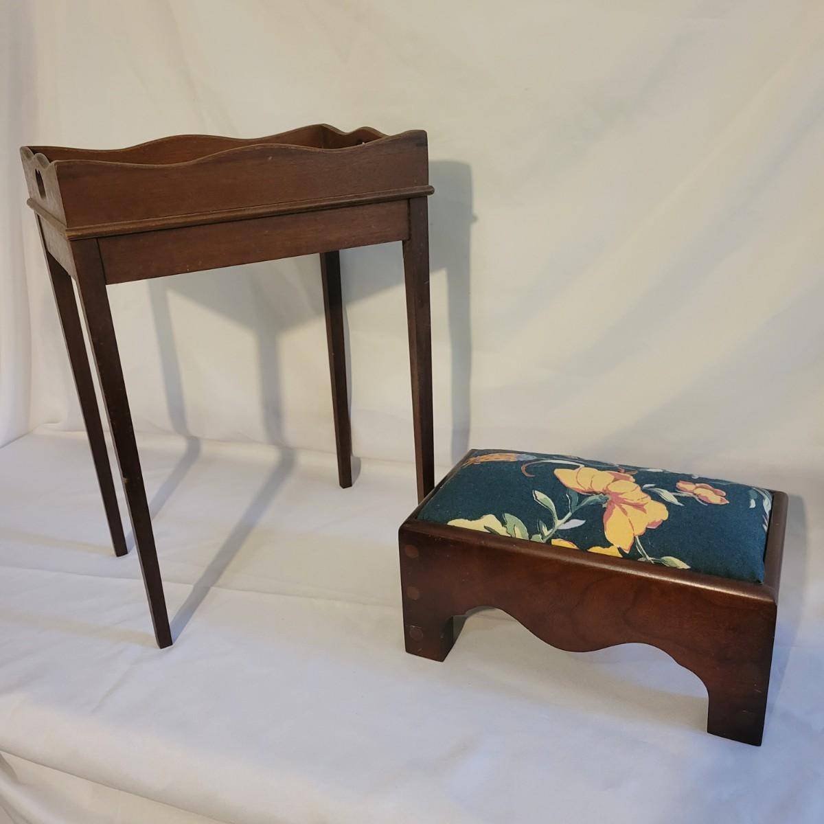 A small table and footstool in good condition with no notable damage. Small footstool is upholstered, has a dark stain and is made of wood. Table is wooden and measures approximately 13" x 9.5" x 18" Local pickup only