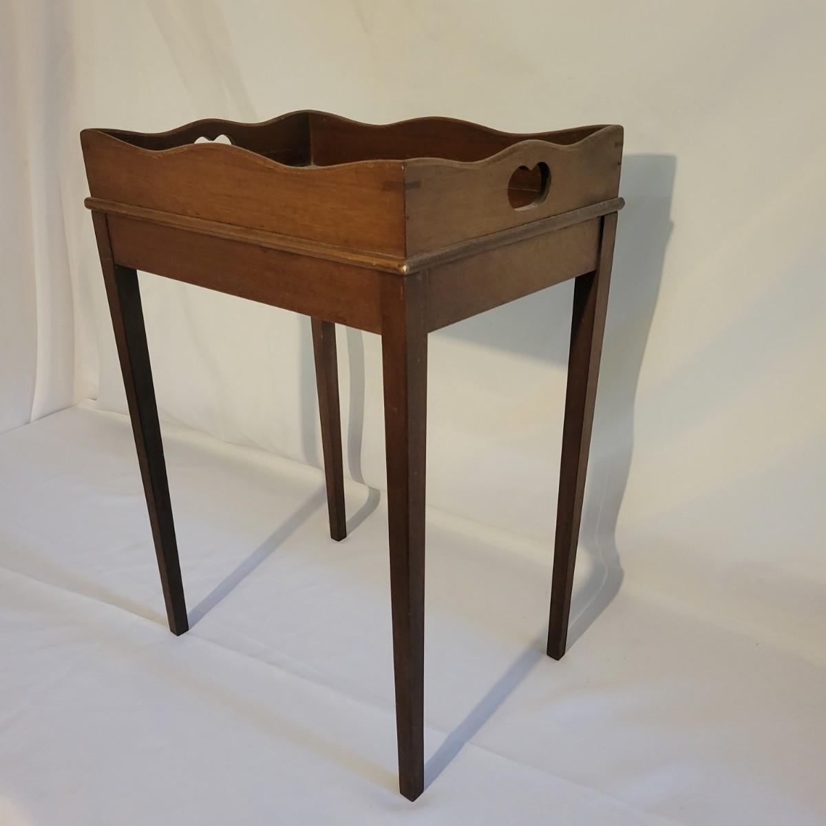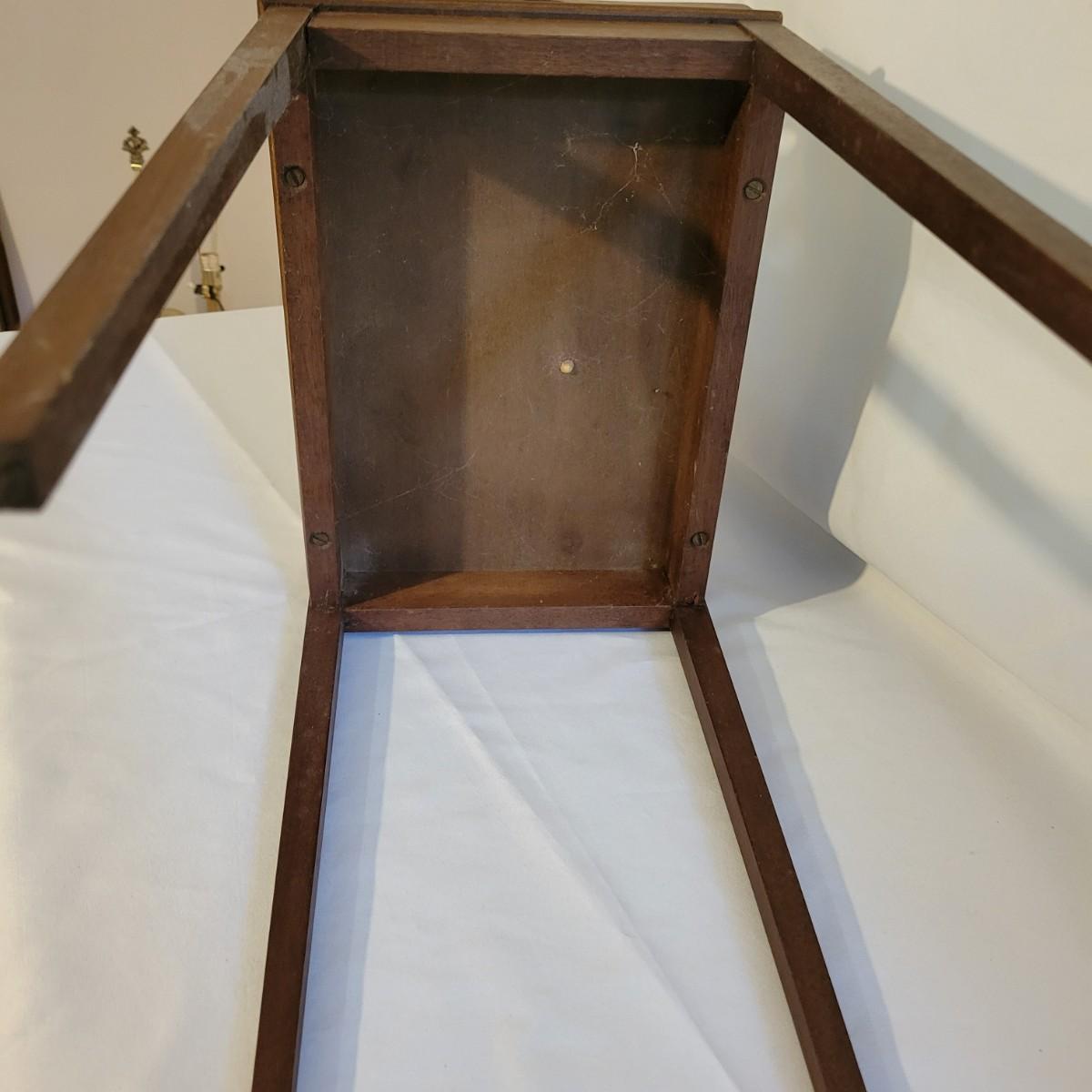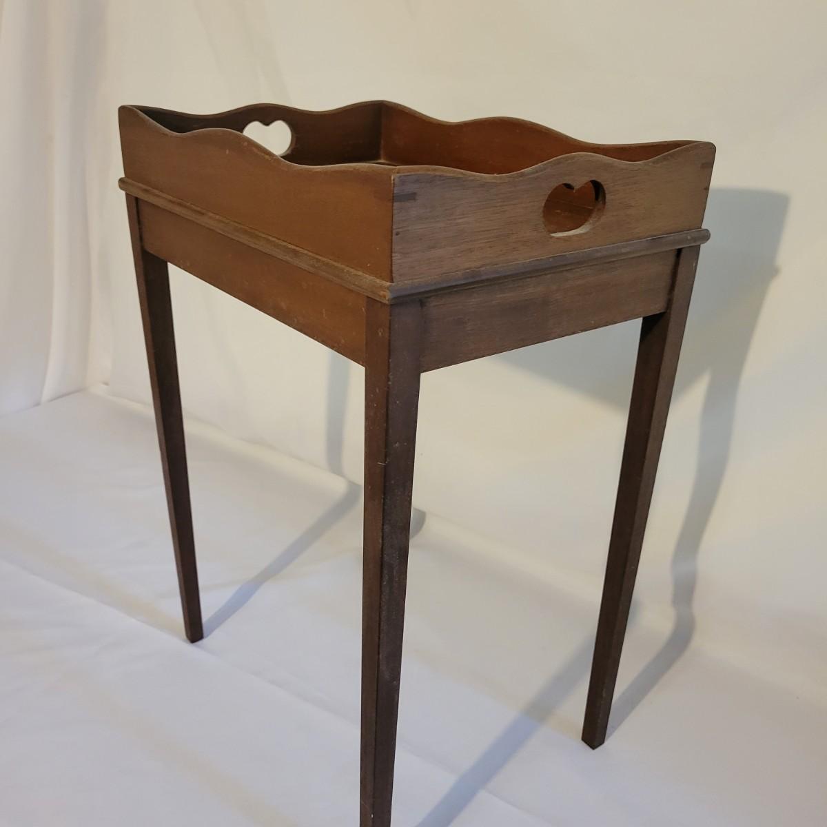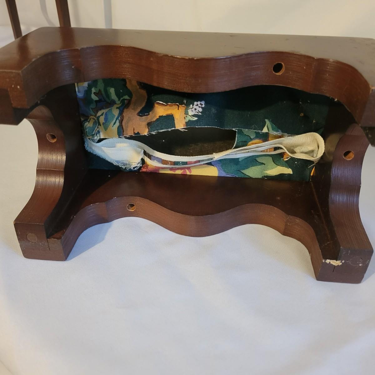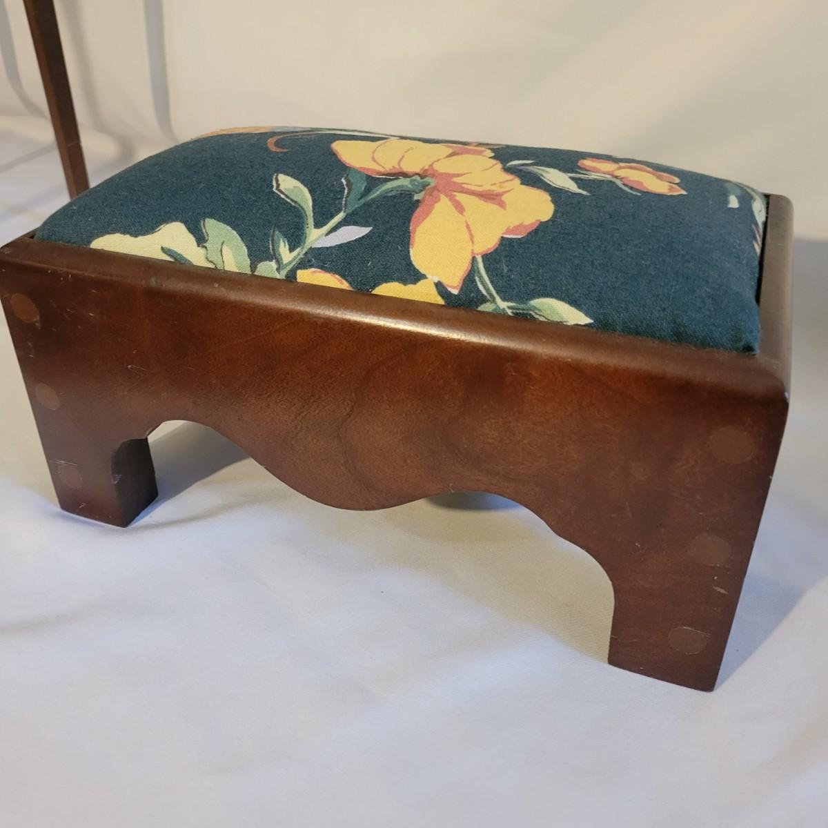 A small table and footstool in good condition with no notable damage. Small footstool is upholstered, has a dark stain and is made of wood. Table is wooden and measures approximately 13" x 9.5" x 18" Local pickup only