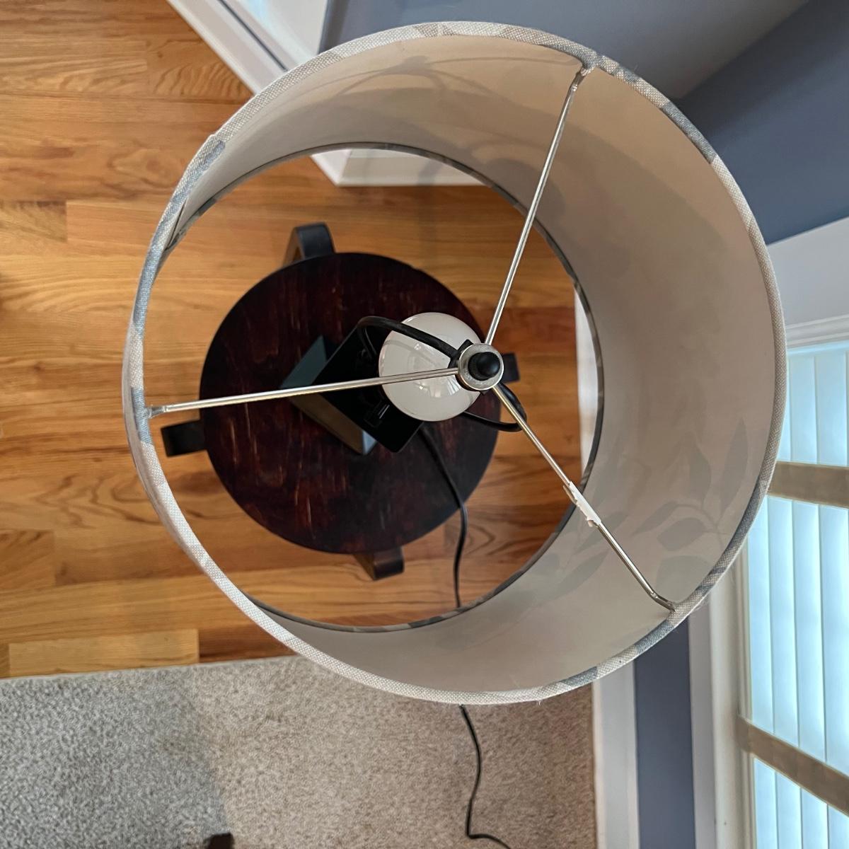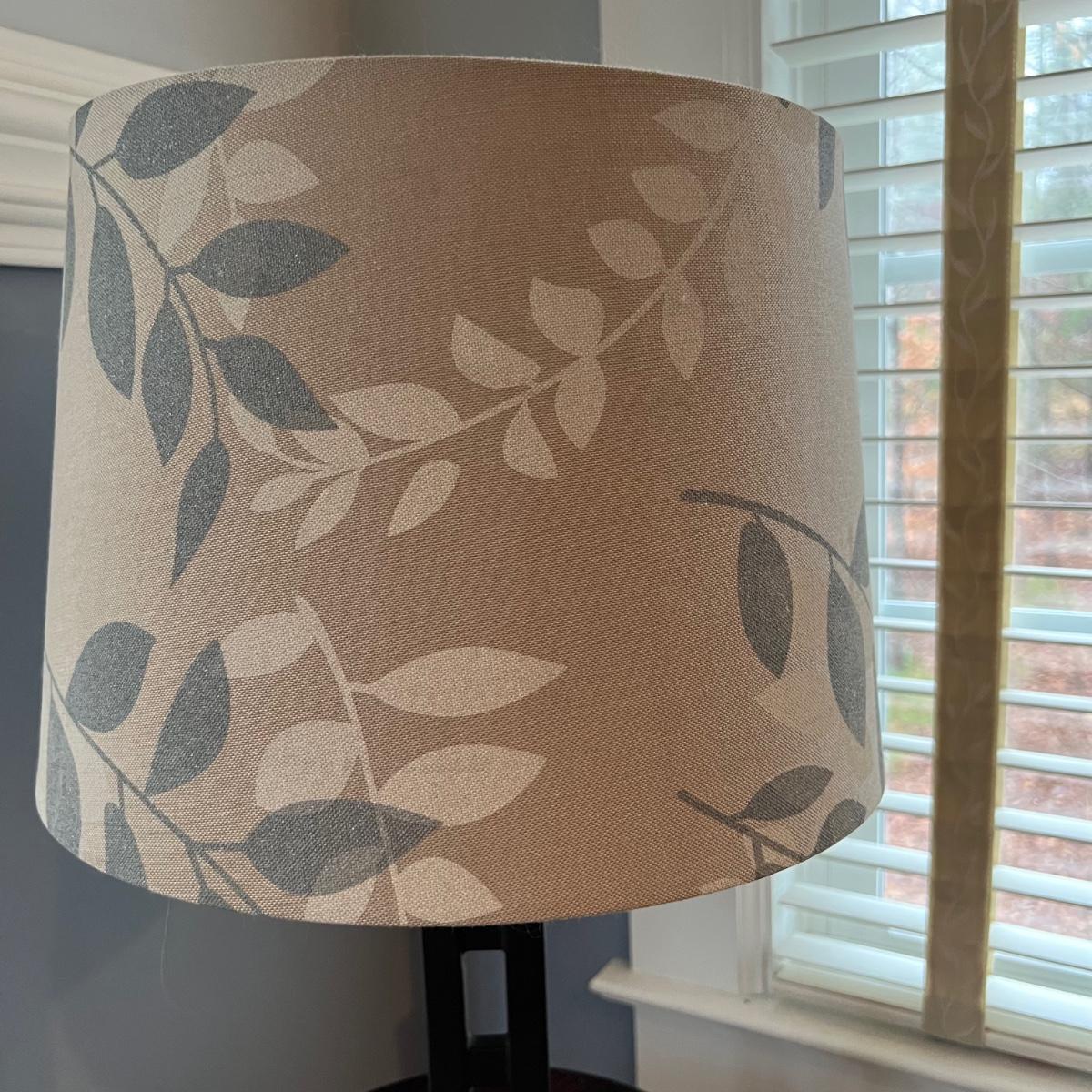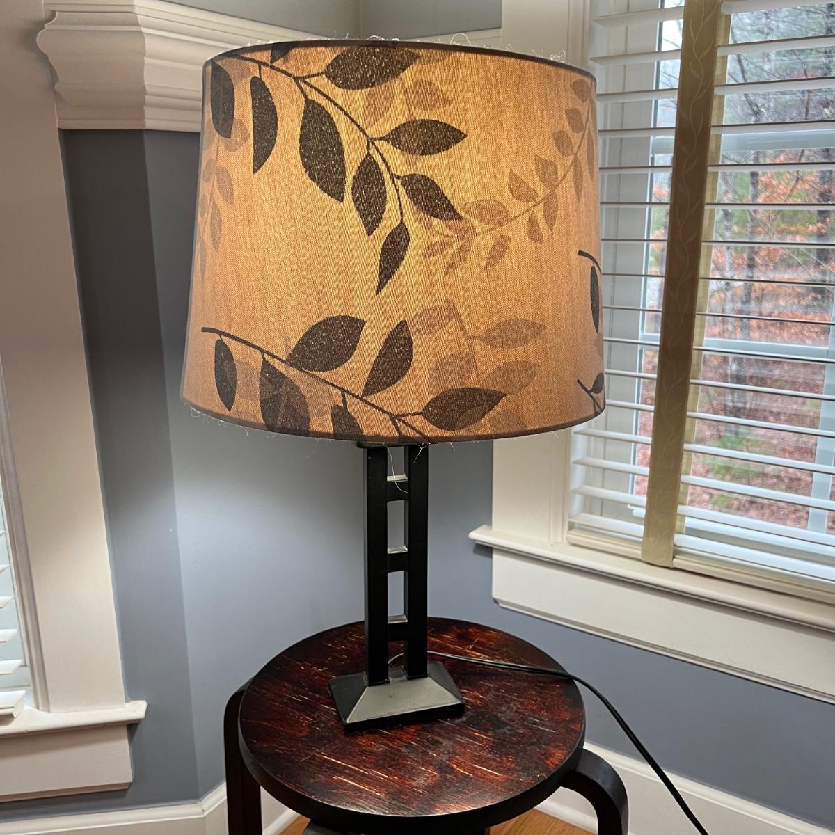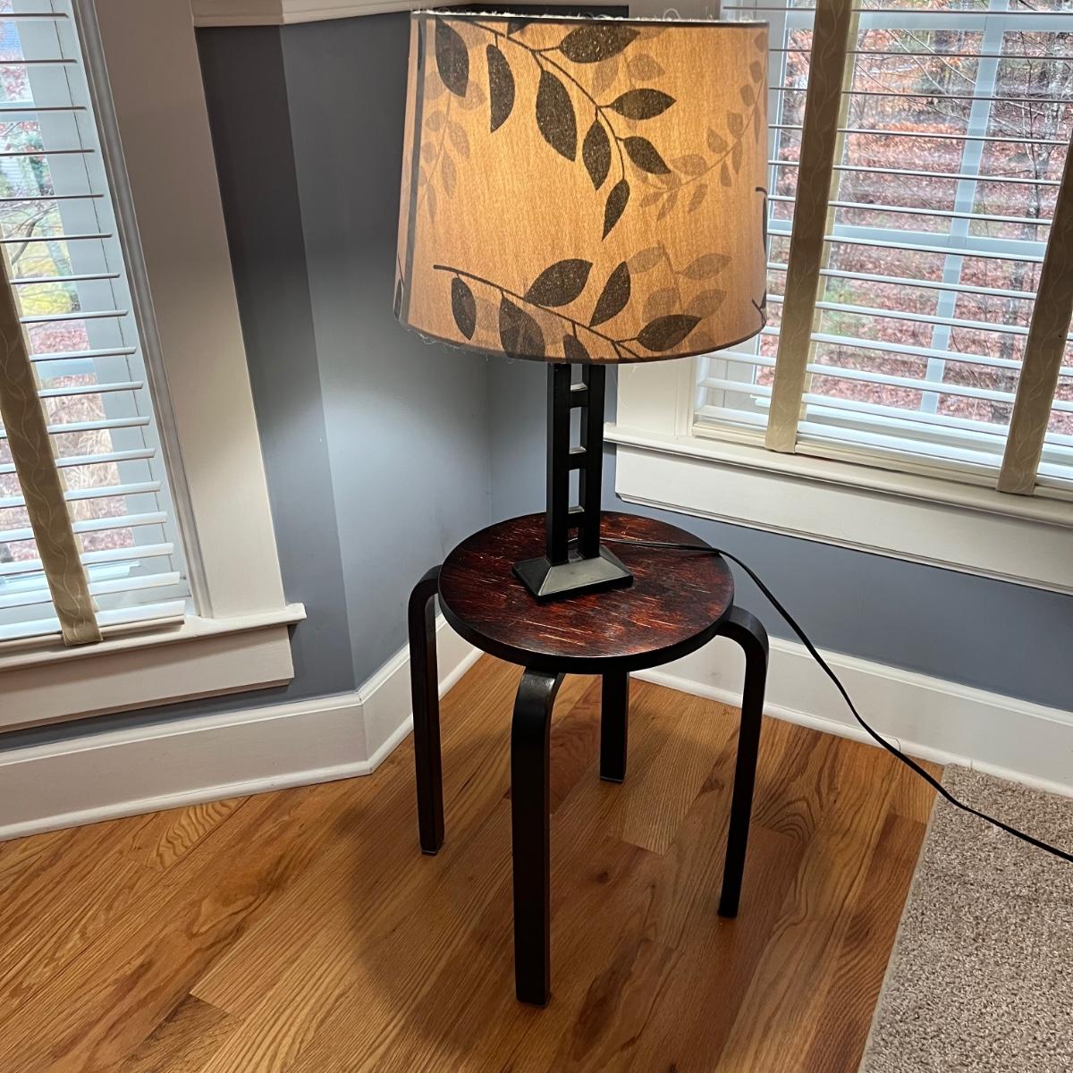 Small wooden darkly stained round table and black lamp with oatmeal linen-like shade with tree branch images. Table is 17.75”H x 13”D. Minor blemishes on table as shown in photograph. Black metal lamp is 22”H and the shade is 12”D x 10”H. Shipping available. Shipping can be costly. We suggest calling our local UPS with dimensions and getting an estimate before bidding: (828) 252-6930.