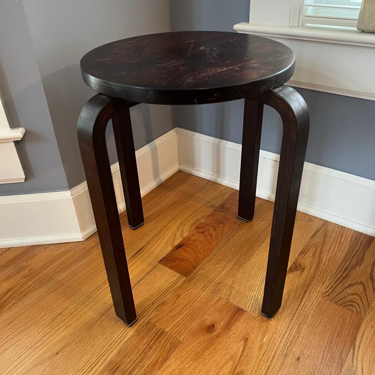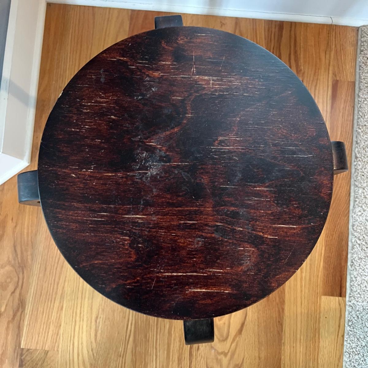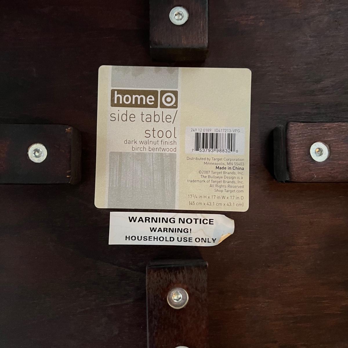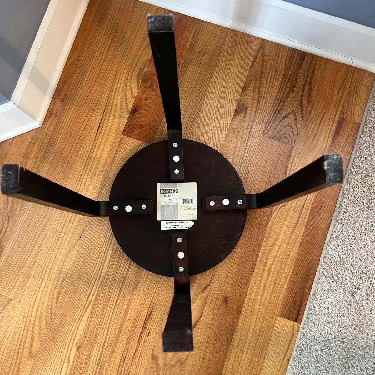 Small wooden darkly stained round table and black lamp with oatmeal linen-like shade with tree branch images. Table is 17.75”H x 13”D. Minor blemishes on table as shown in photograph. Black metal lamp is 22”H and the shade is 12”D x 10”H. Shipping available. Shipping can be costly. We suggest calling our local UPS with dimensions and getting an estimate before bidding: (828) 252-6930.