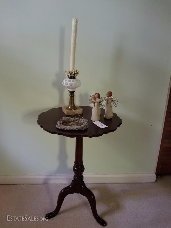 Small Wood Table with Contents: 3 Angels small beaded purse, and marble and brass candle stand
