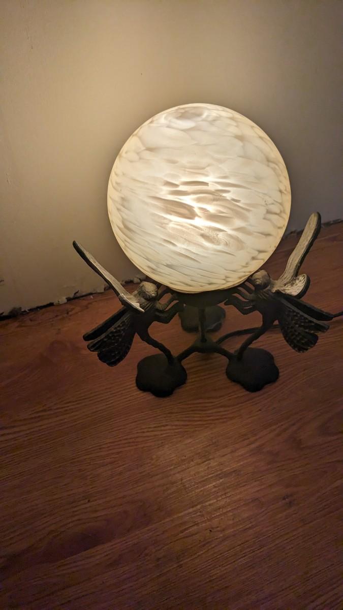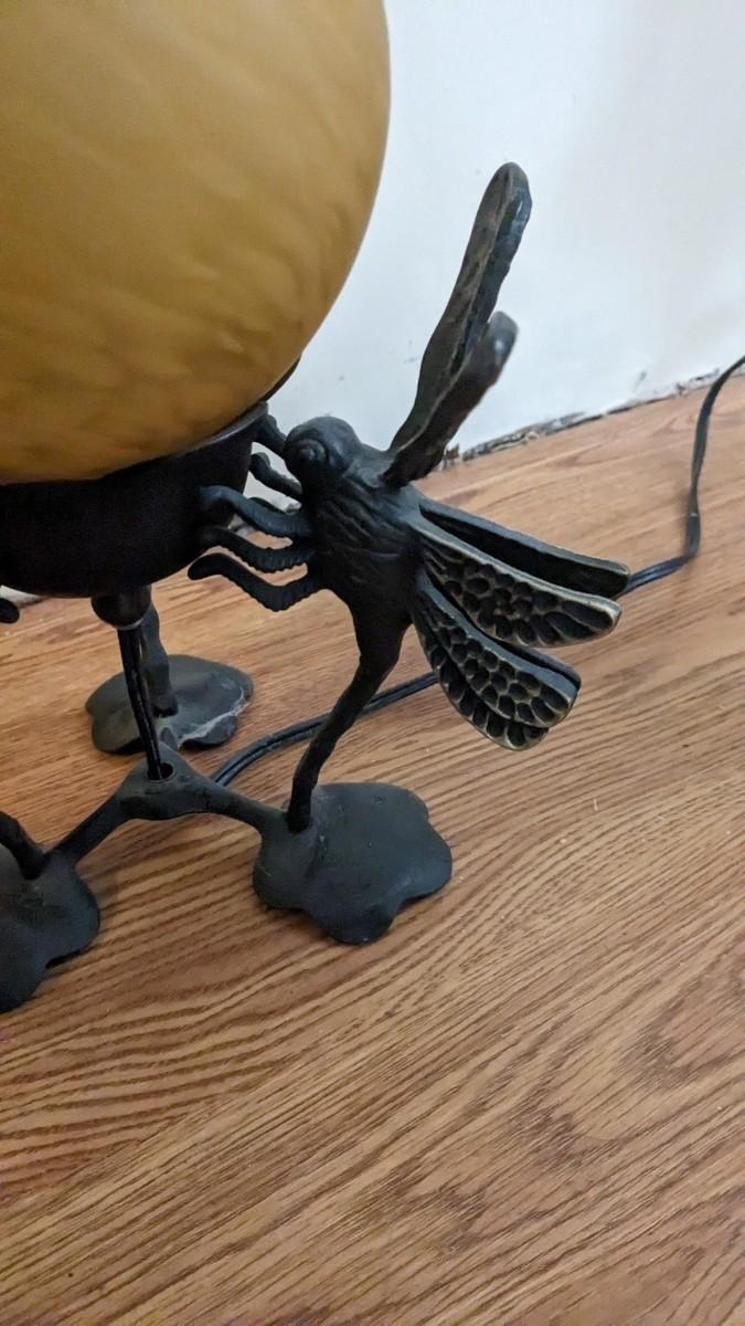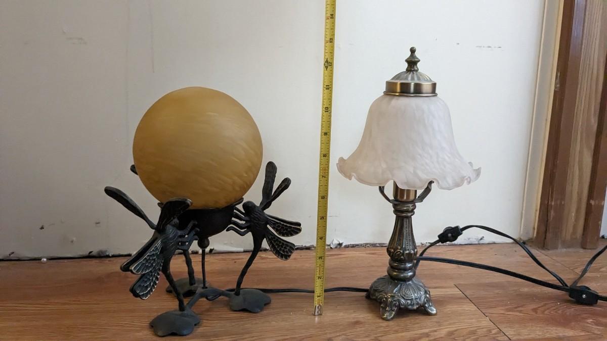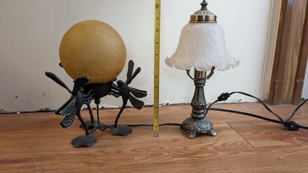 2ea, one a beautiful dragonfly piece and the other a quintessential bell shade piece. Both functional and in great condition with very lovely art glass style shades. Specialty shipping will apply, inquire for more details. bdrm1