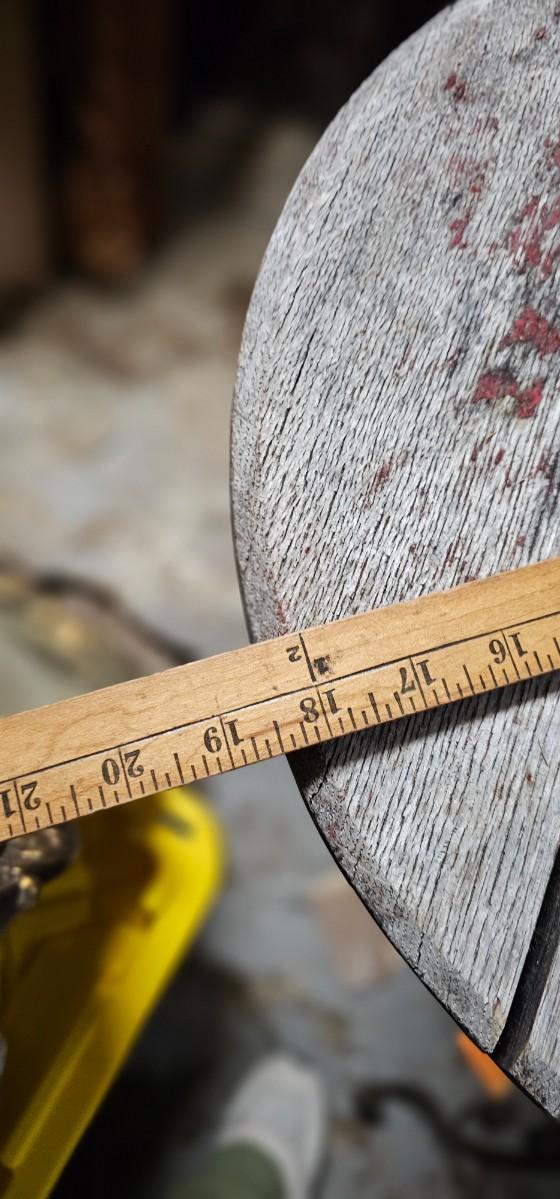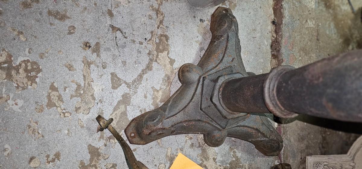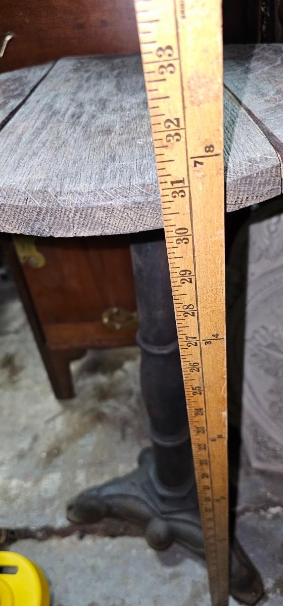 Small table on heavy cast iron pedestal. The pedestal has holes on it, so you can bolt it to a floor.