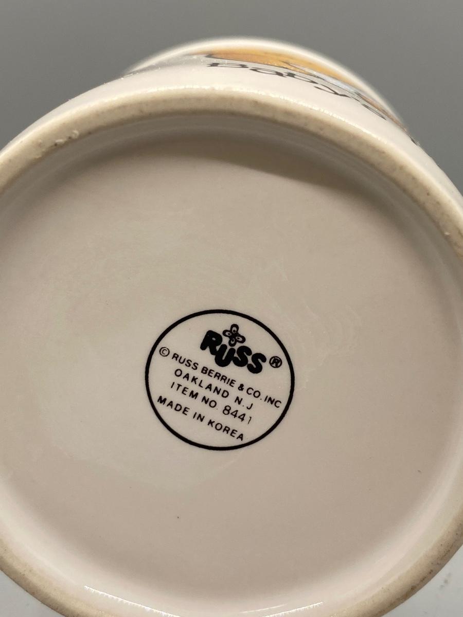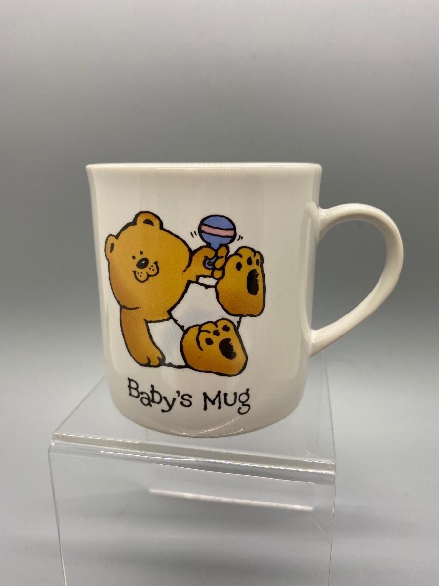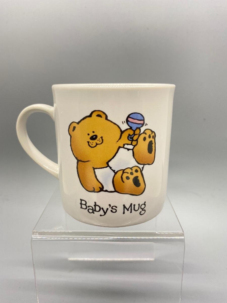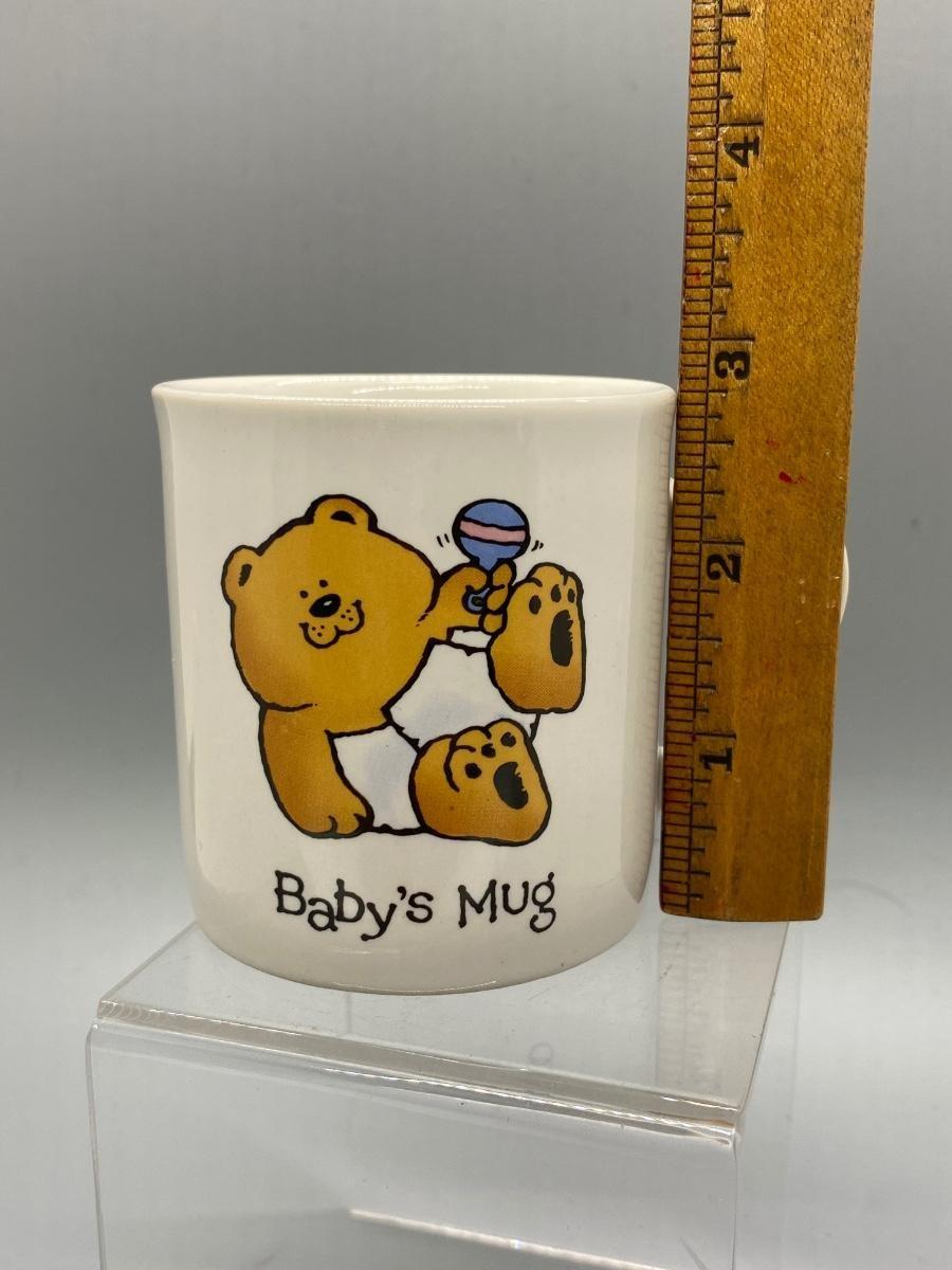 Small mug from Russ. Porcelain cup has a diaper wearing bear with rattle and the word's Baby's Mug underneath. Same image on both sides. Good condition.