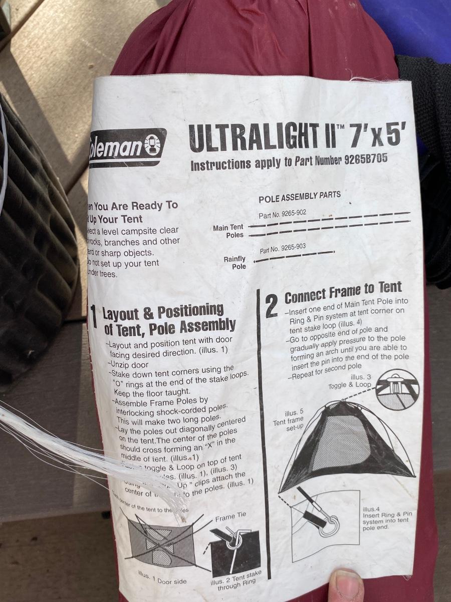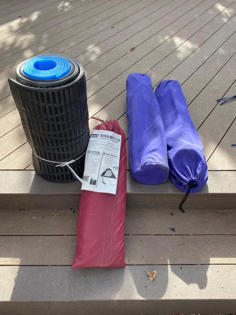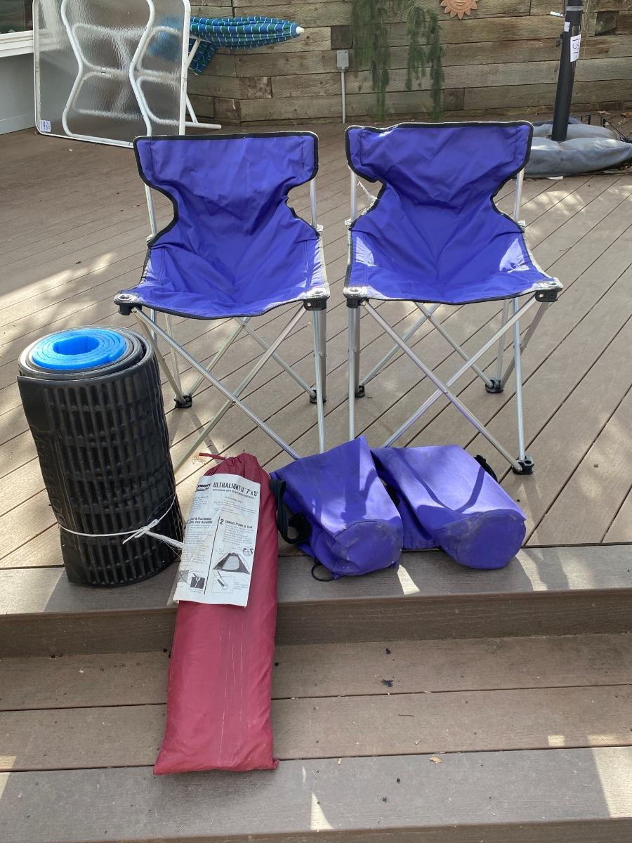SMALL TENT, TRAVEL FOLDING CHAIRS, RIDGE REST SLEEP MATS