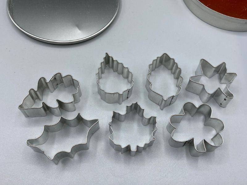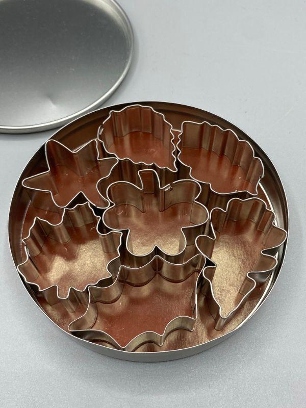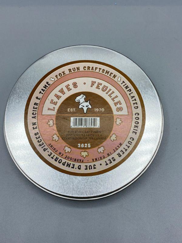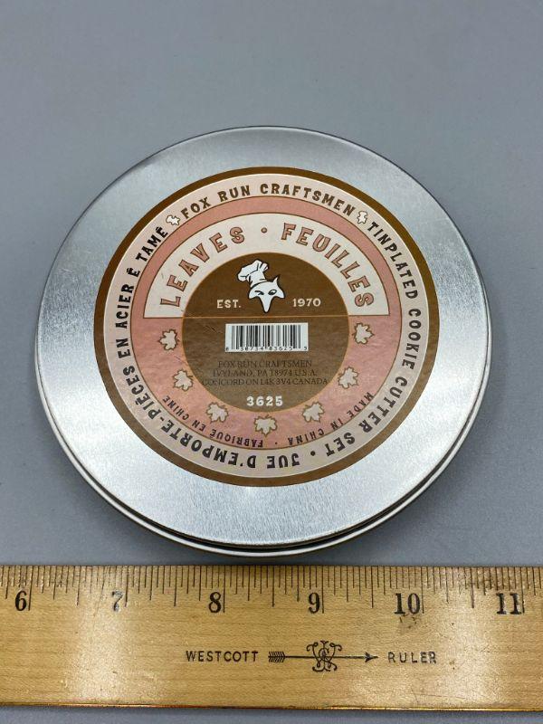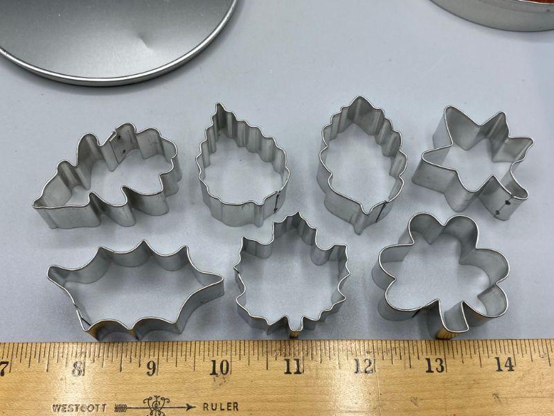Small tin of cookie cutters by Fox Run Craftsmen. Set of 7 different leaf shapes. Small, under 2" size. Great for cookies, fondant, or clay. Good condition