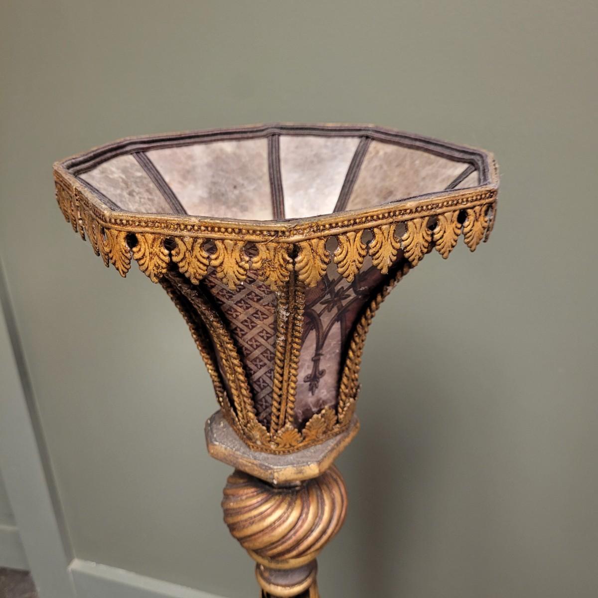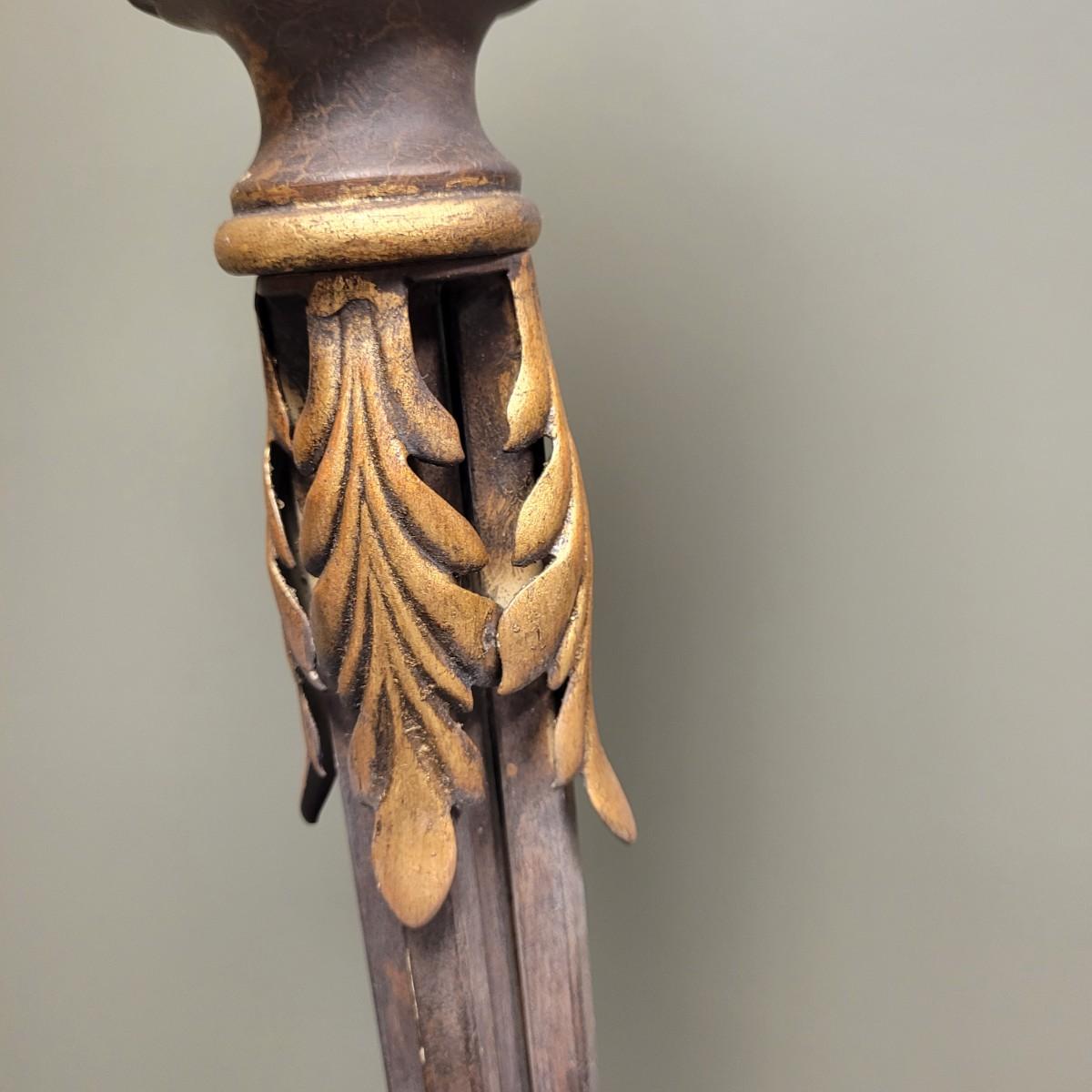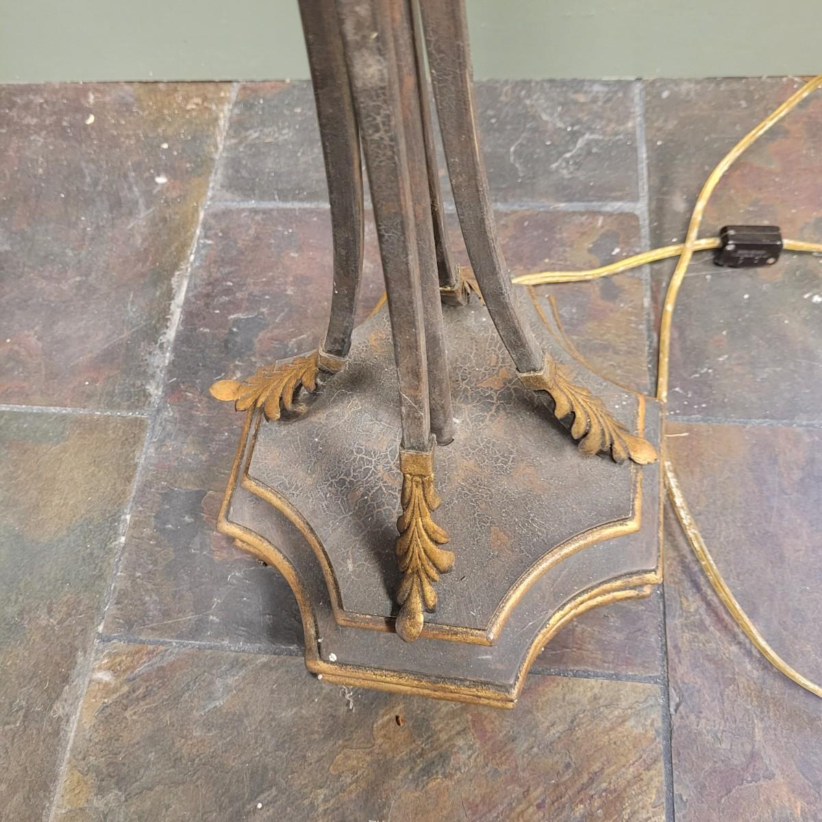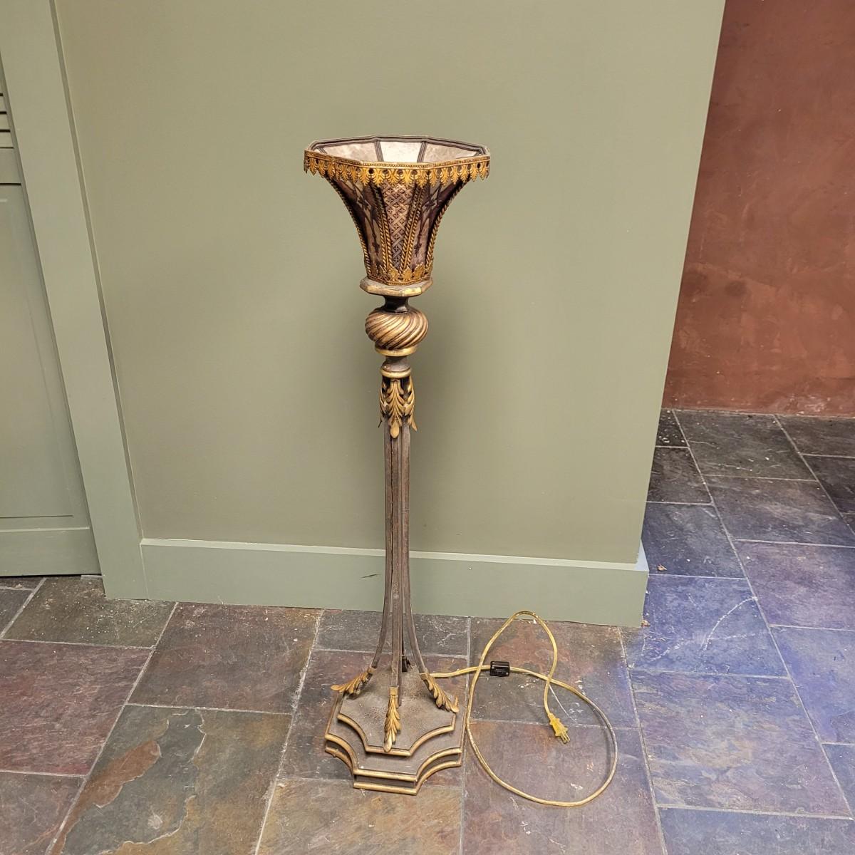 Small Torchière style floor lamp has metal engraved edging and a color scheme of gold and burgundy. No light bulb available for testing. Measures approximately 8"D x 39"H. Shipping available. Shipping can be costly. We suggest contacting our preferred local shipping provider, Postage Express, with dimensions and getting an estimate before bidding: (828) 670-5501or postageexpress@yahoo.com.
