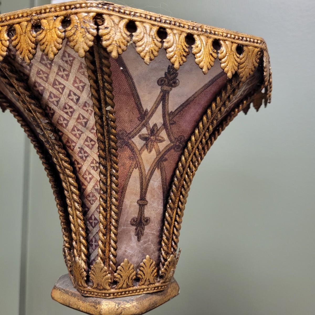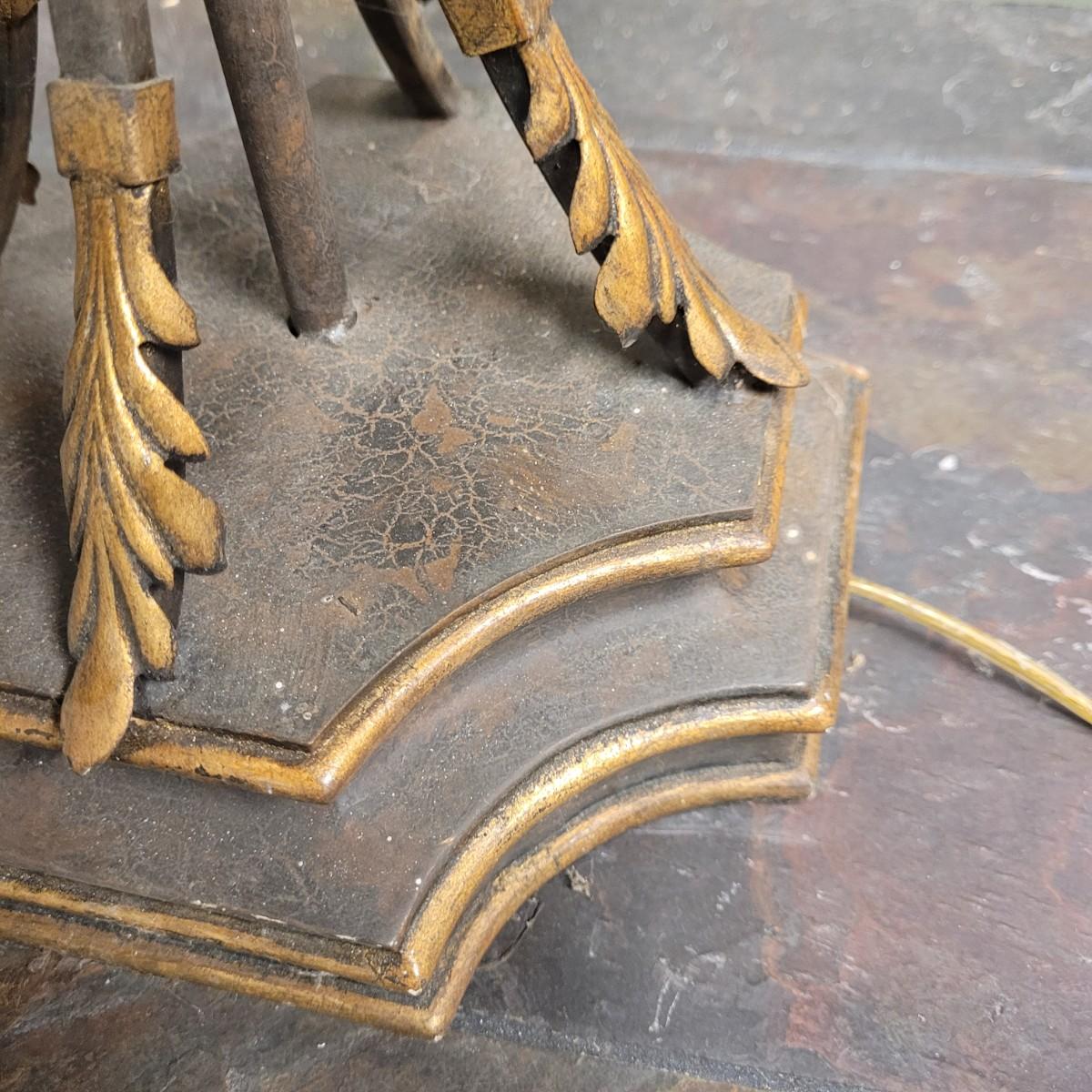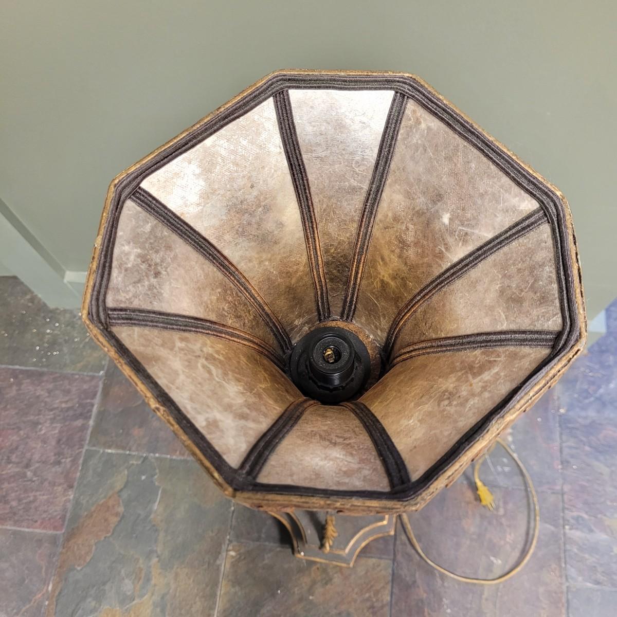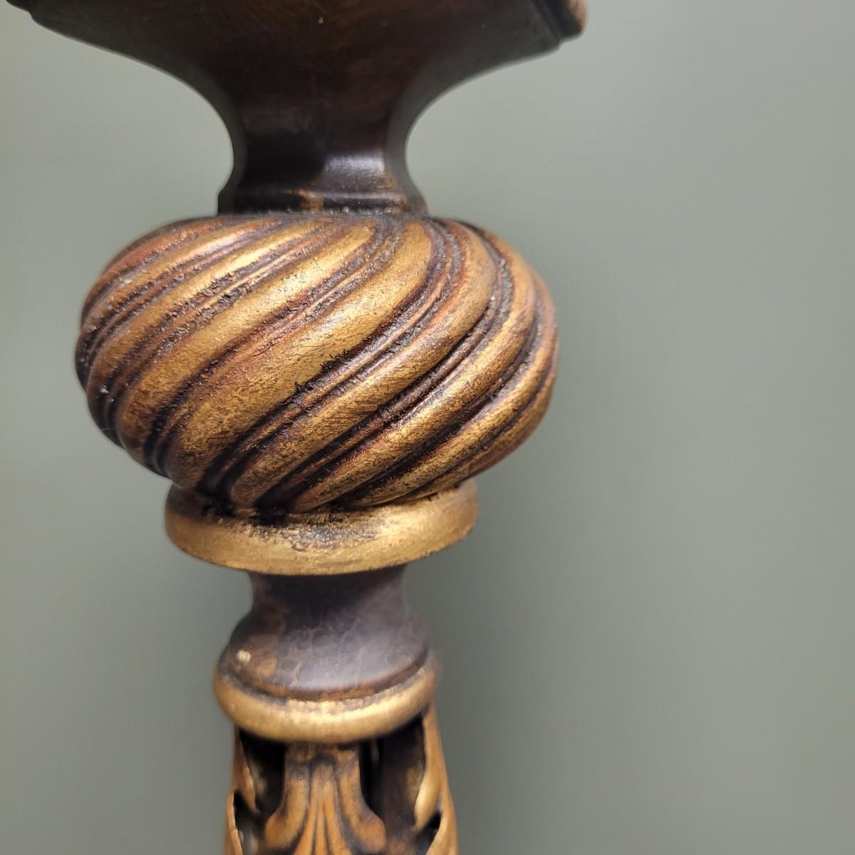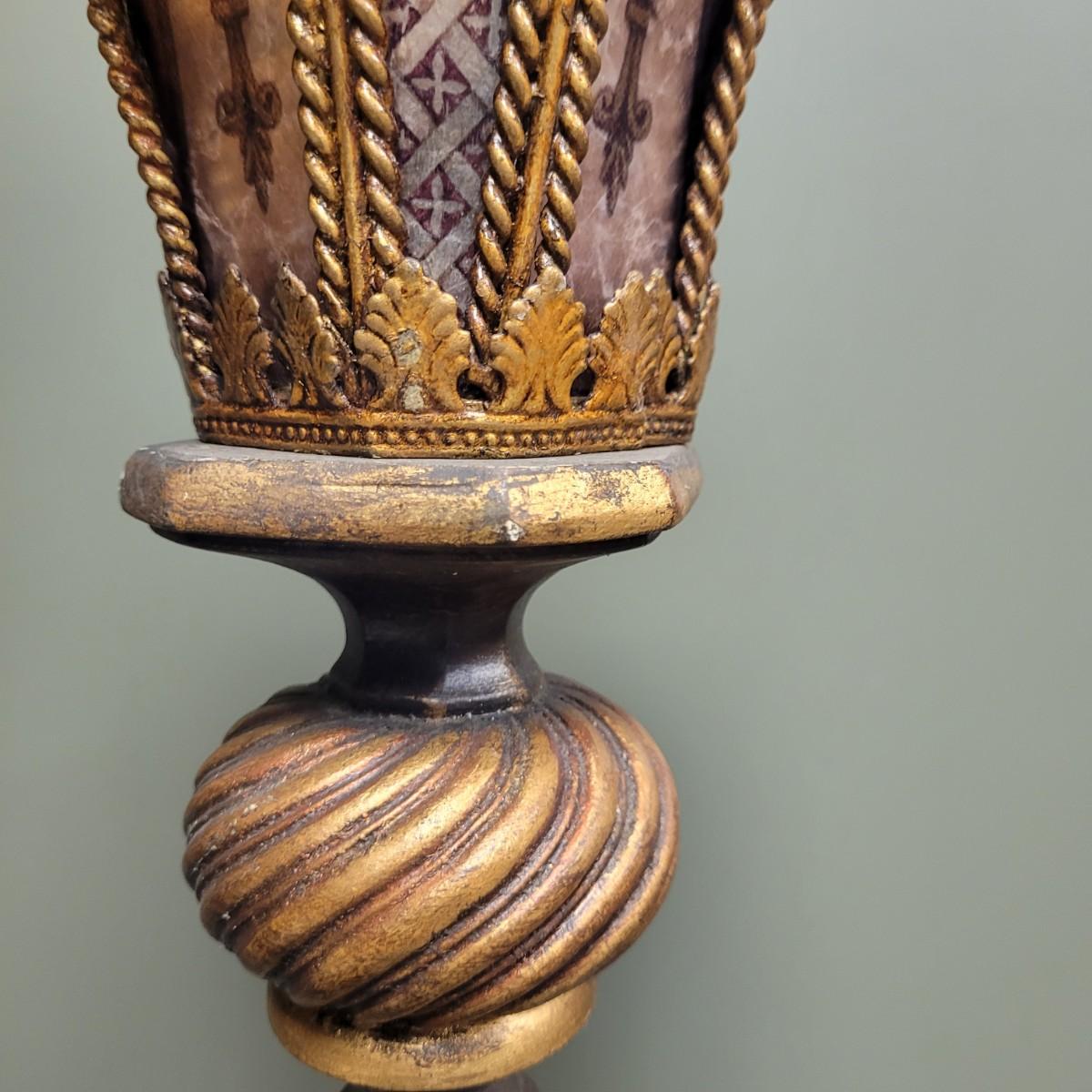 Small Torchière style floor lamp has metal engraved edging and a color scheme of gold and burgundy. No light bulb available for testing. Measures approximately 8"D x 39"H. Shipping available. Shipping can be costly. We suggest contacting our preferred local shipping provider, Postage Express, with dimensions and getting an estimate before bidding: (828) 670-5501or postageexpress@yahoo.com.