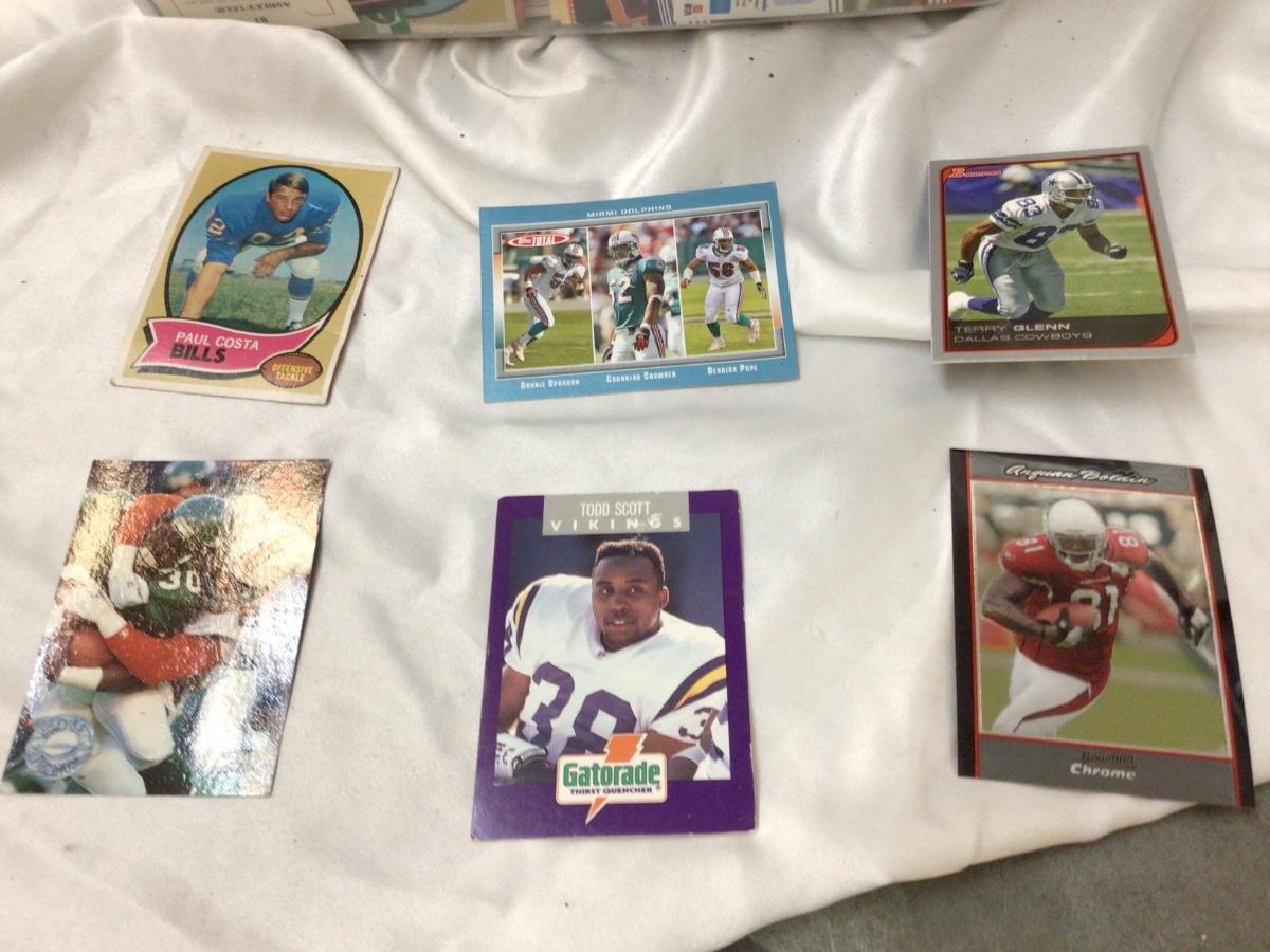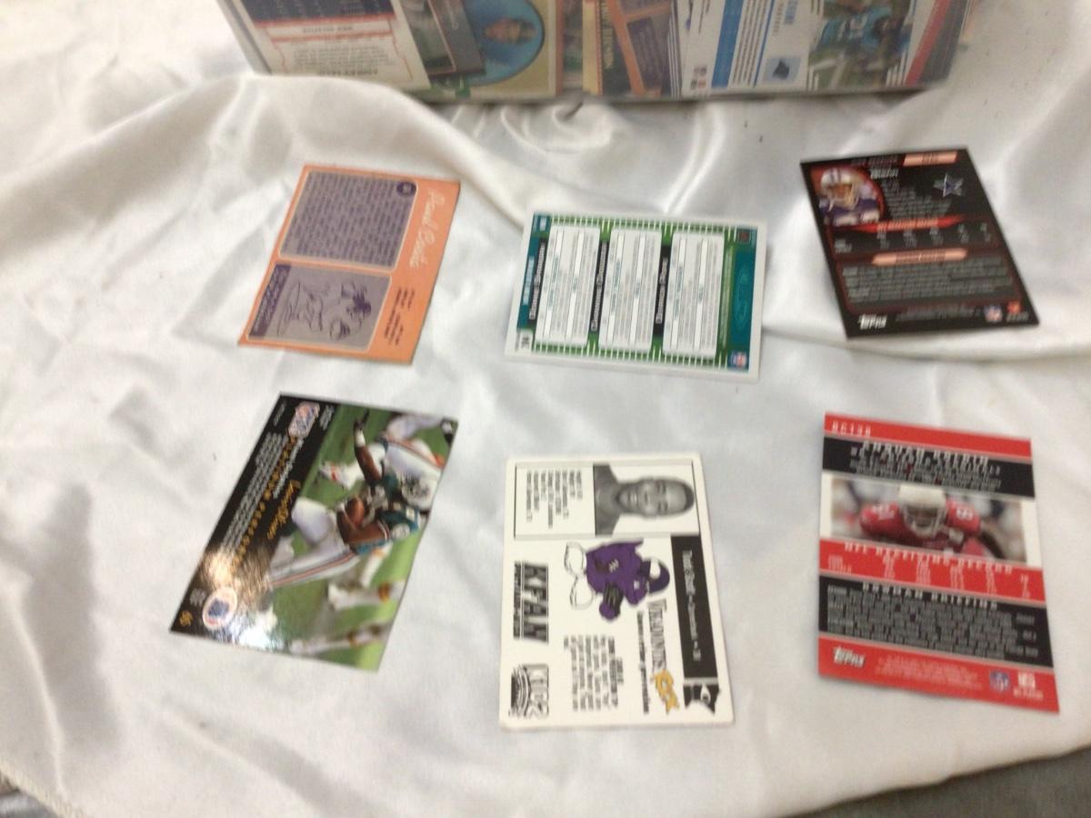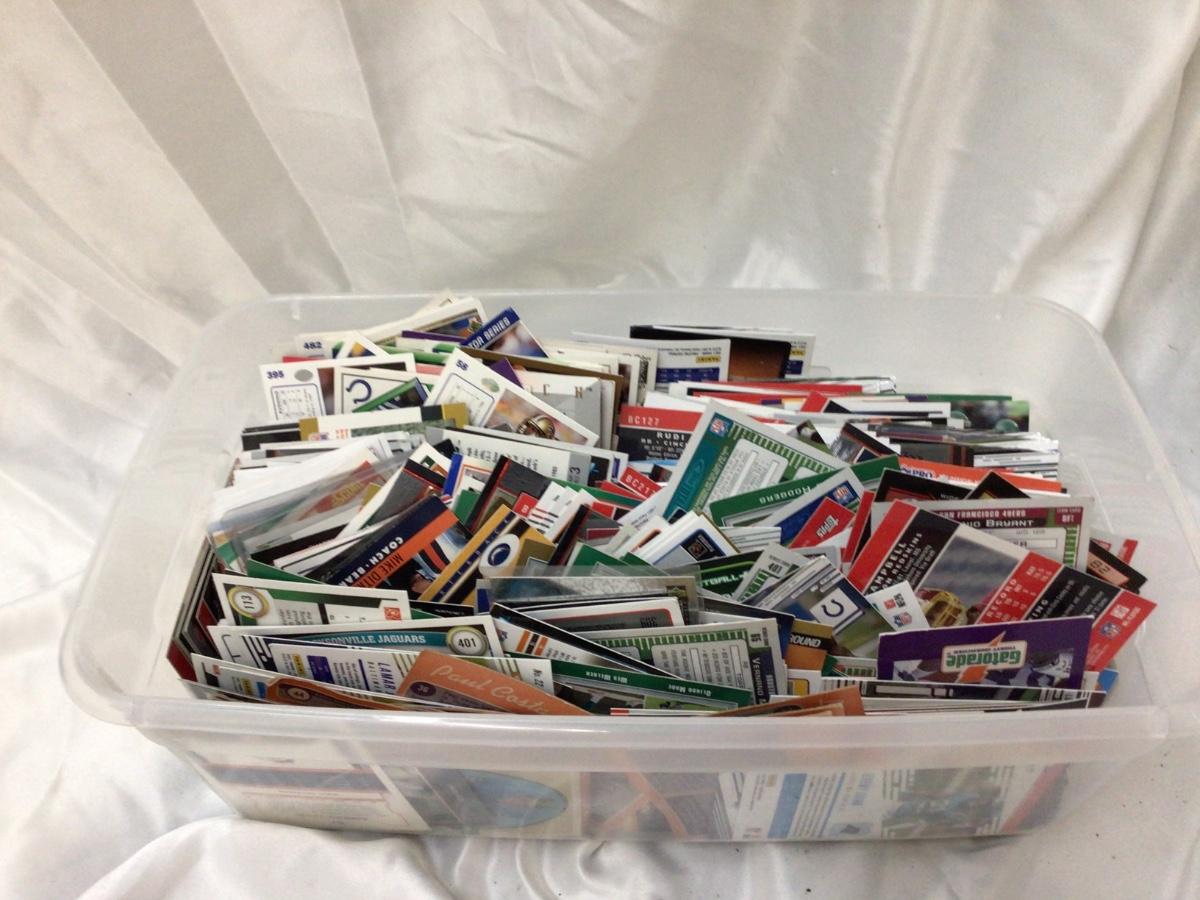 You get a great small tote of football cards. There are various years and teams. Great mystery lot never know what card could be in there.