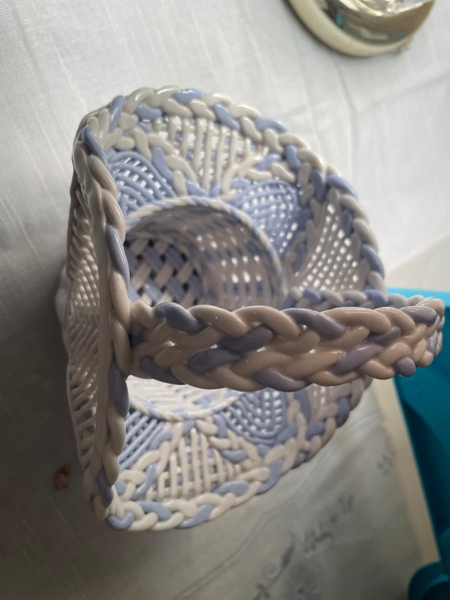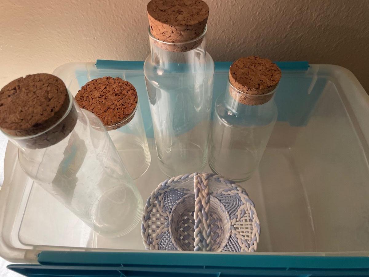 Small tote with glass bottles and blue ceramic basket