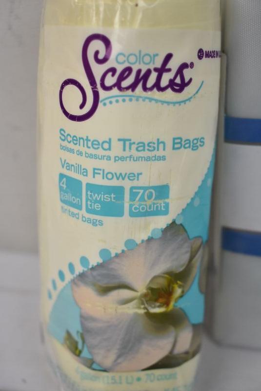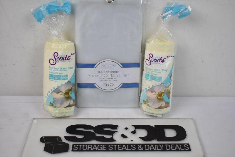 Color Scents Small Trash Bag - 4 Gallon, 70 Bags, Twist Tie - Vanilla Flower AND Bath Bliss Premium Shower Curtain Liner, Frost 70" x 72", $18 Retail - New