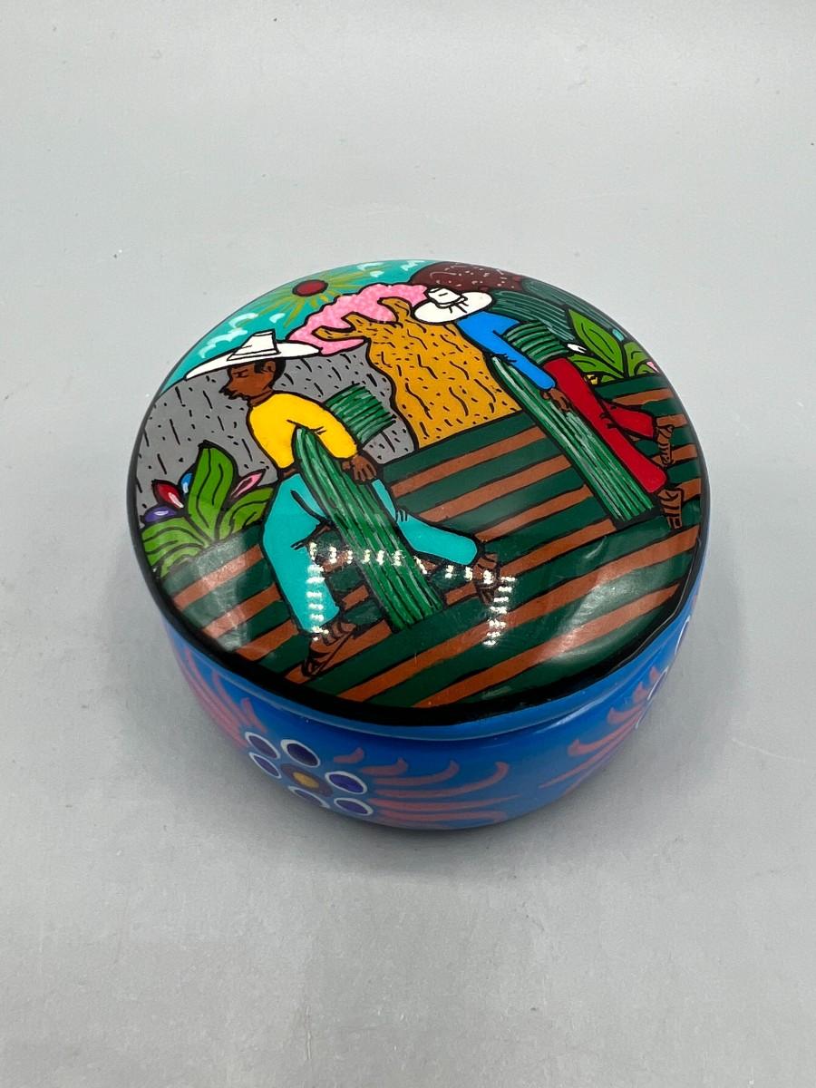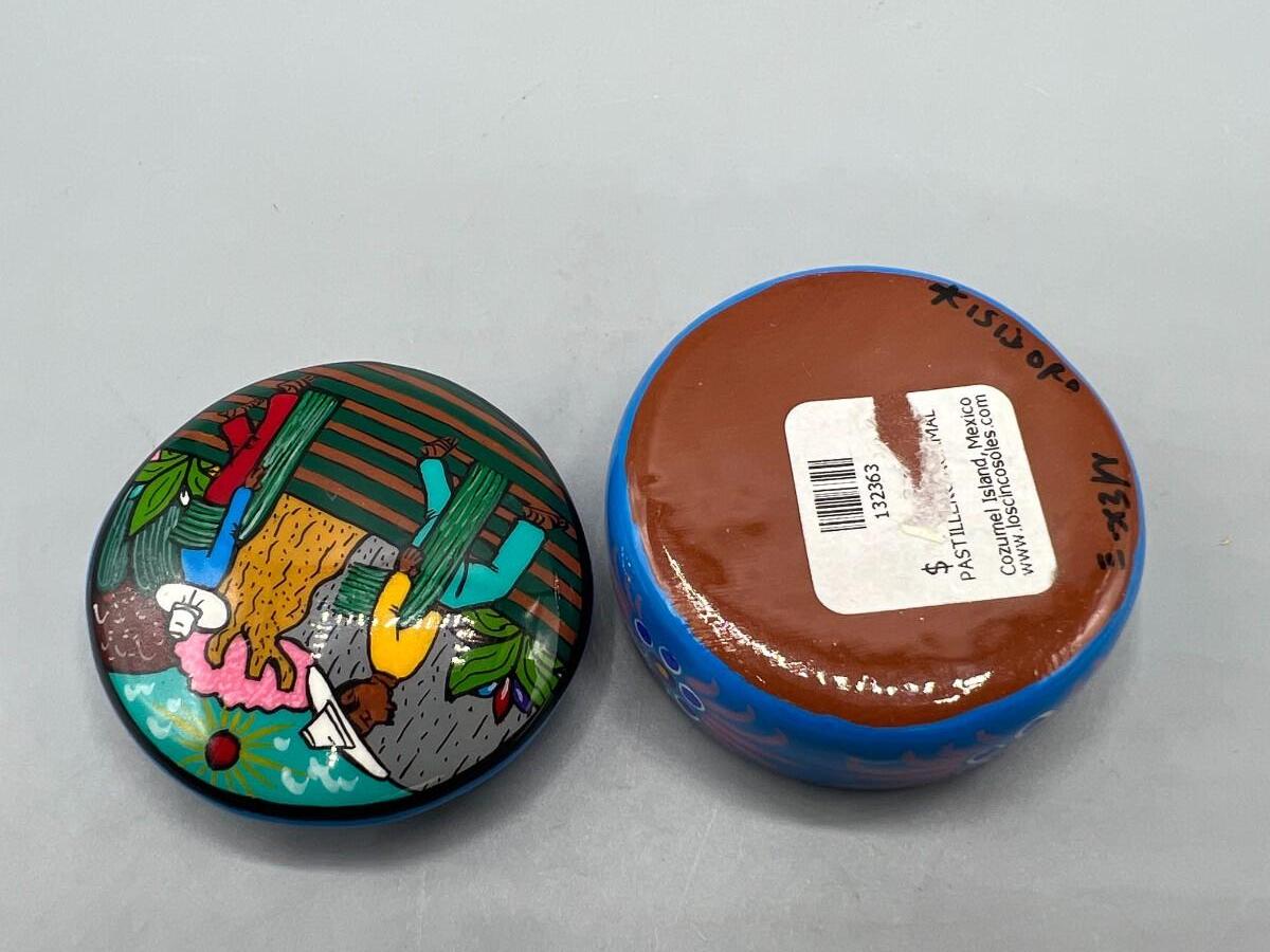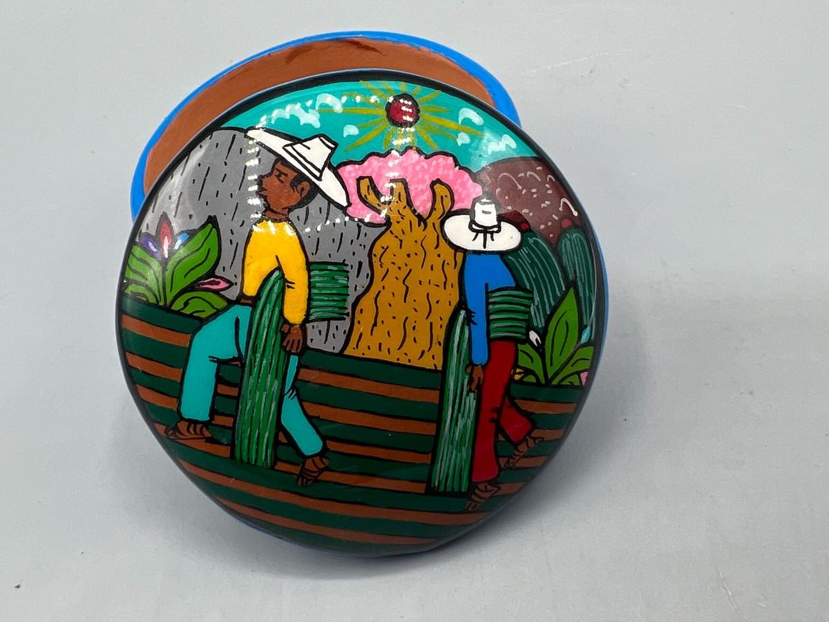 Small Travel Souvenir Colorful Clay Pottery Trinket Dish, there is no significant damage to the piece and is in good displayable condition. Check pictures for more details and for sizing,