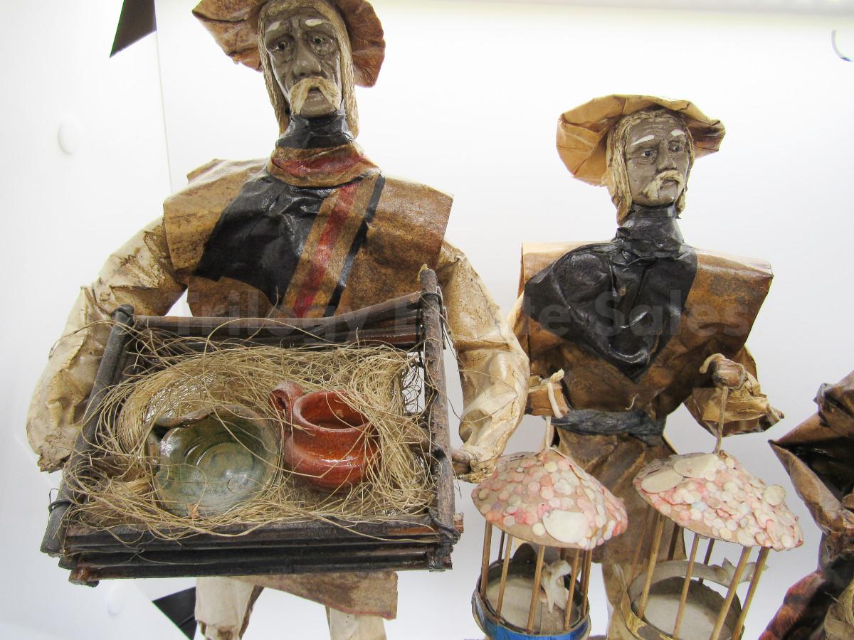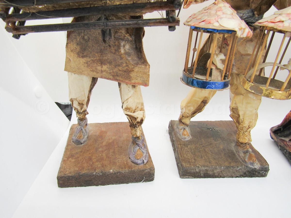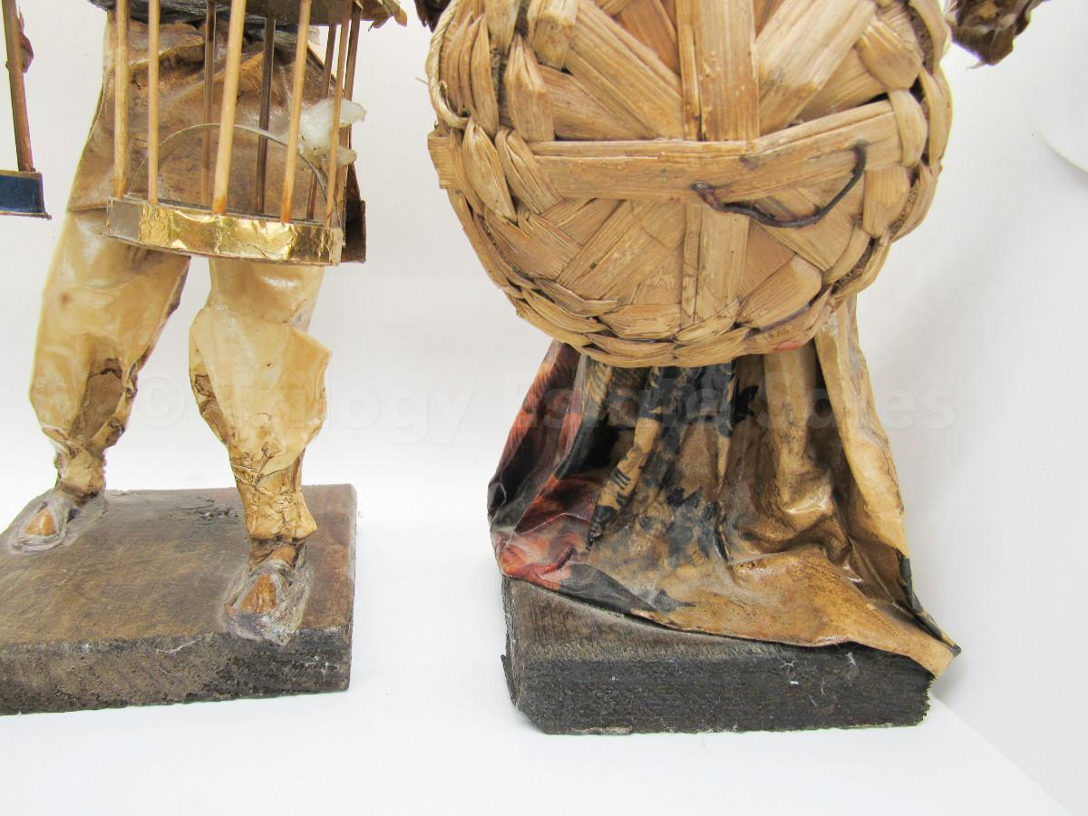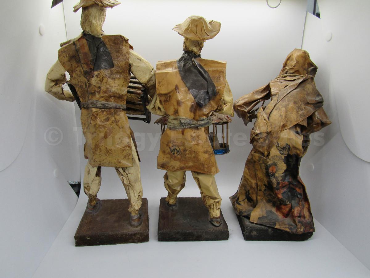 three paper maché handmade mexico figures 13.5” tall man; 10.5” tall woman; 12.5” man with birdcage