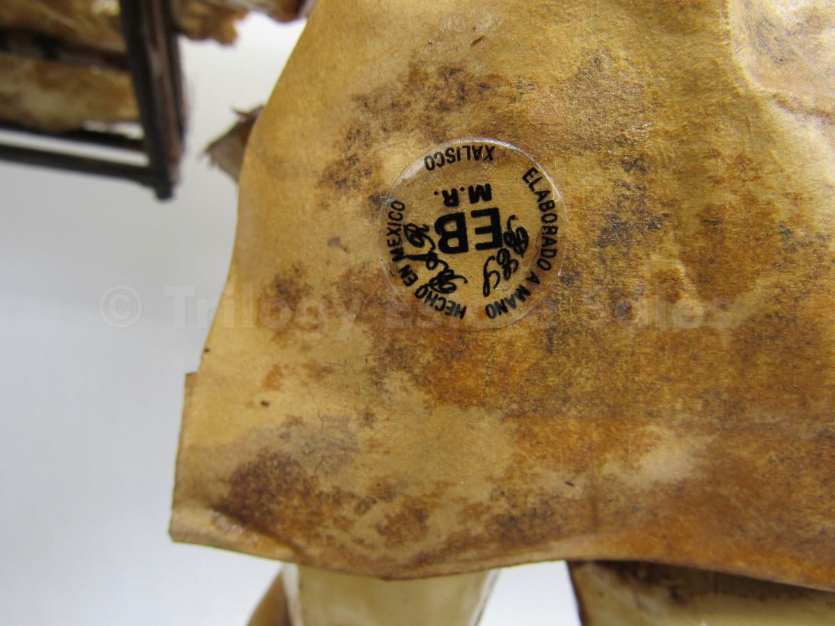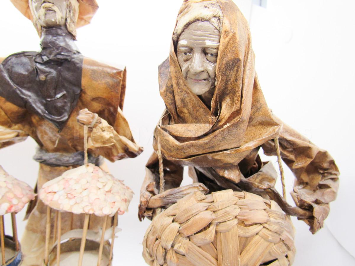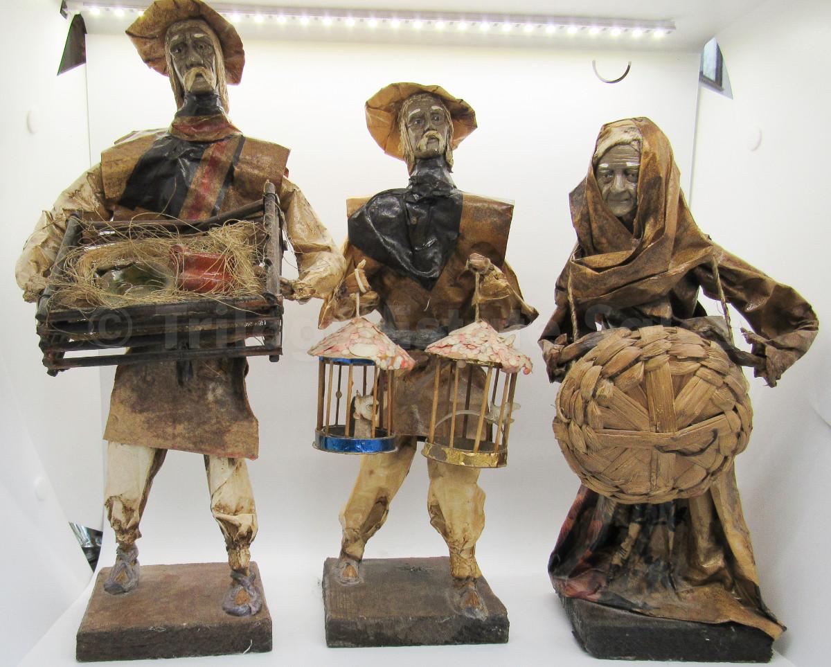 three paper maché handmade mexico figures 13.5” tall man; 10.5” tall woman; 12.5” man with birdcage