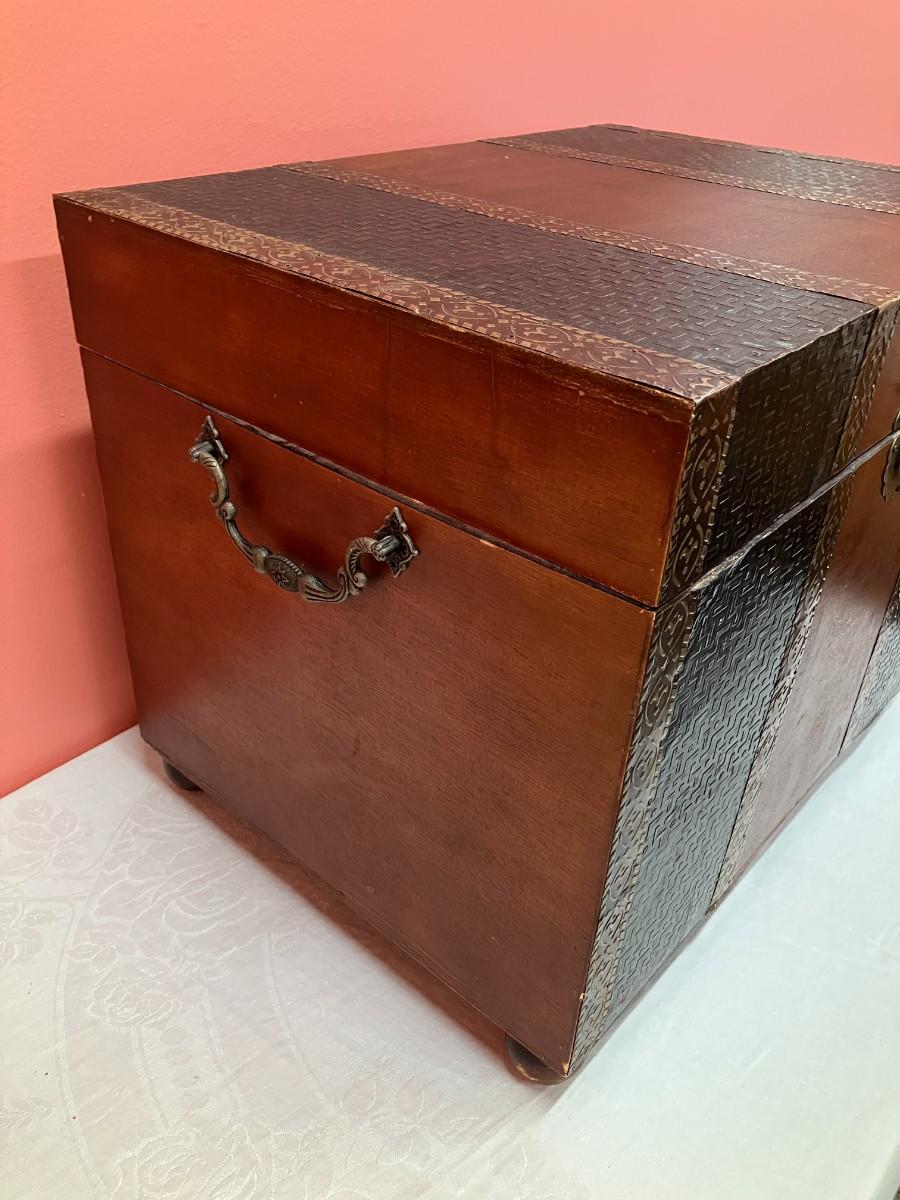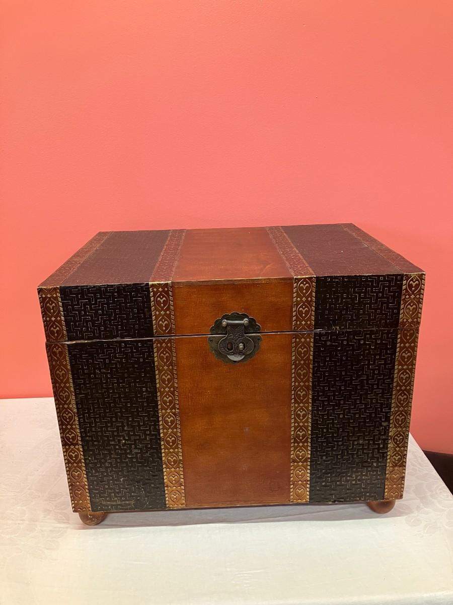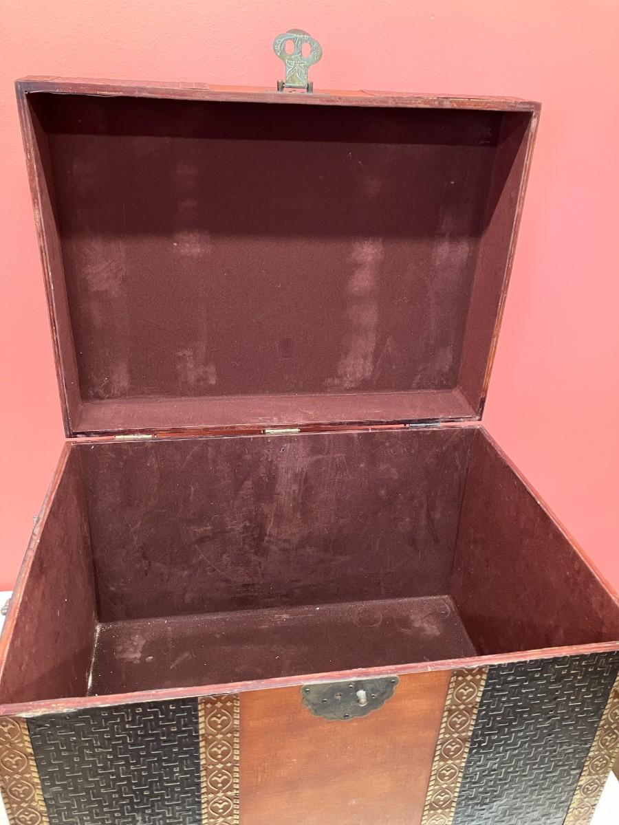 Small wooden/metal velvet lined trunk. 17"H x 21"W x 15"D