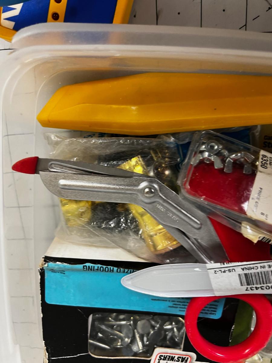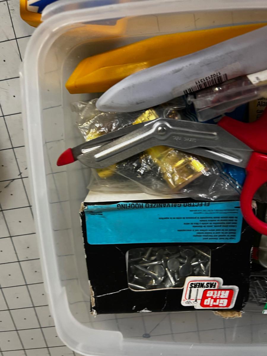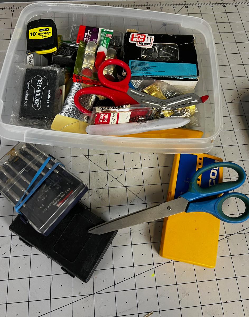 Small Tub of Hardware; Nails, SCISSORS, Knife, Screwdriveivers