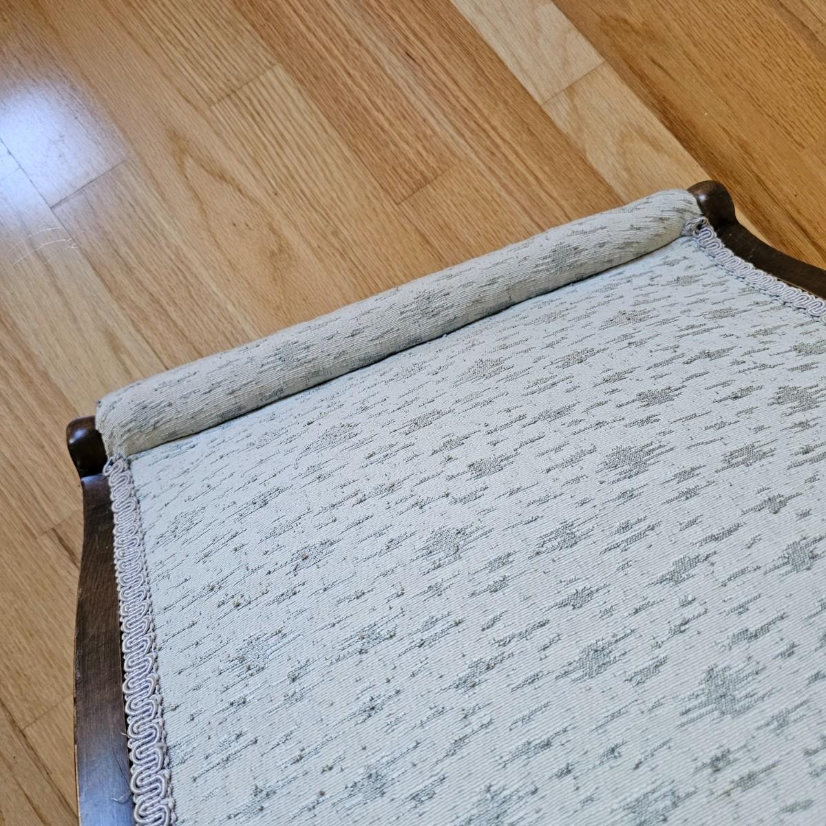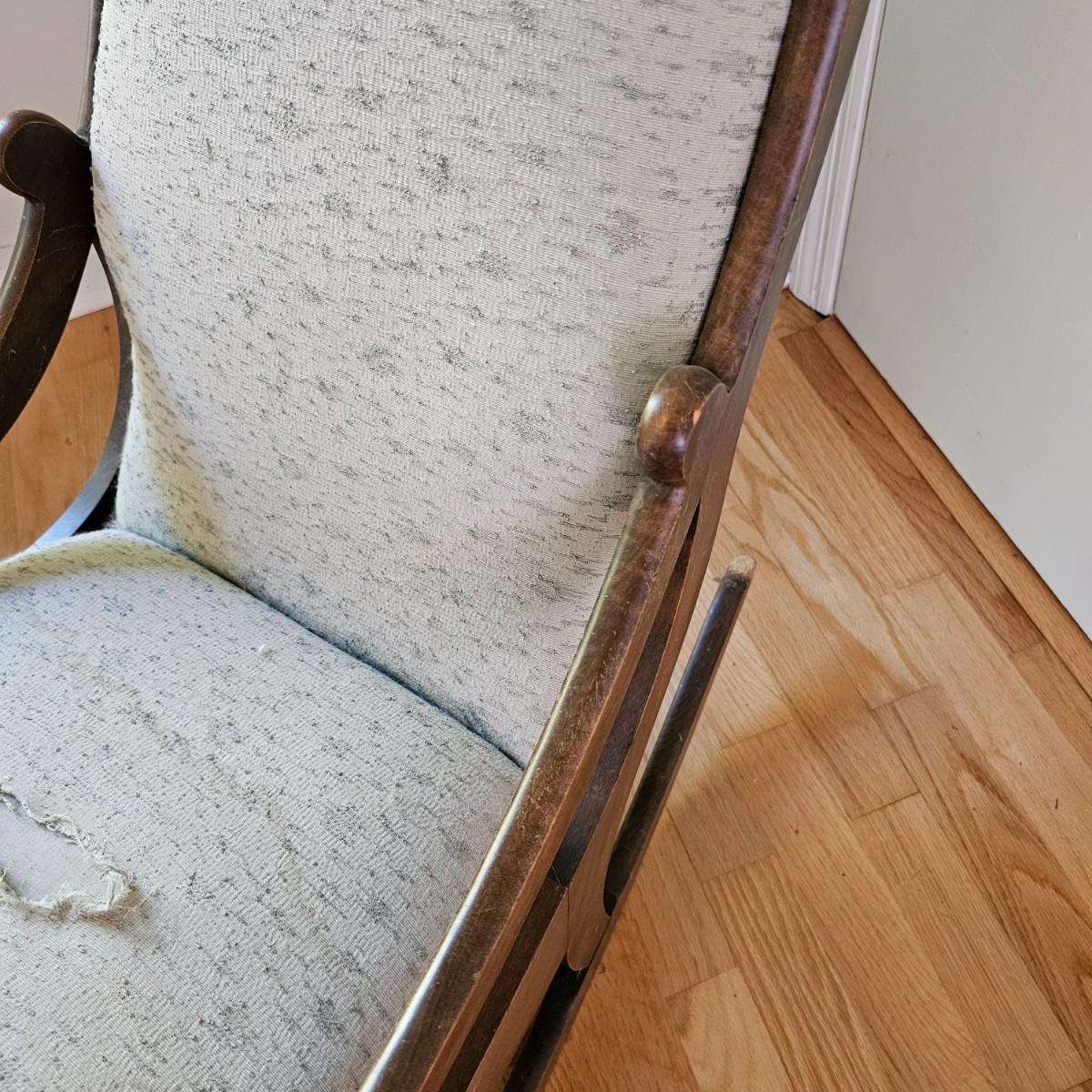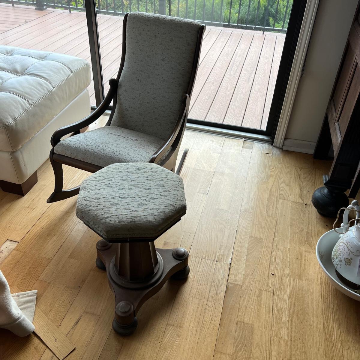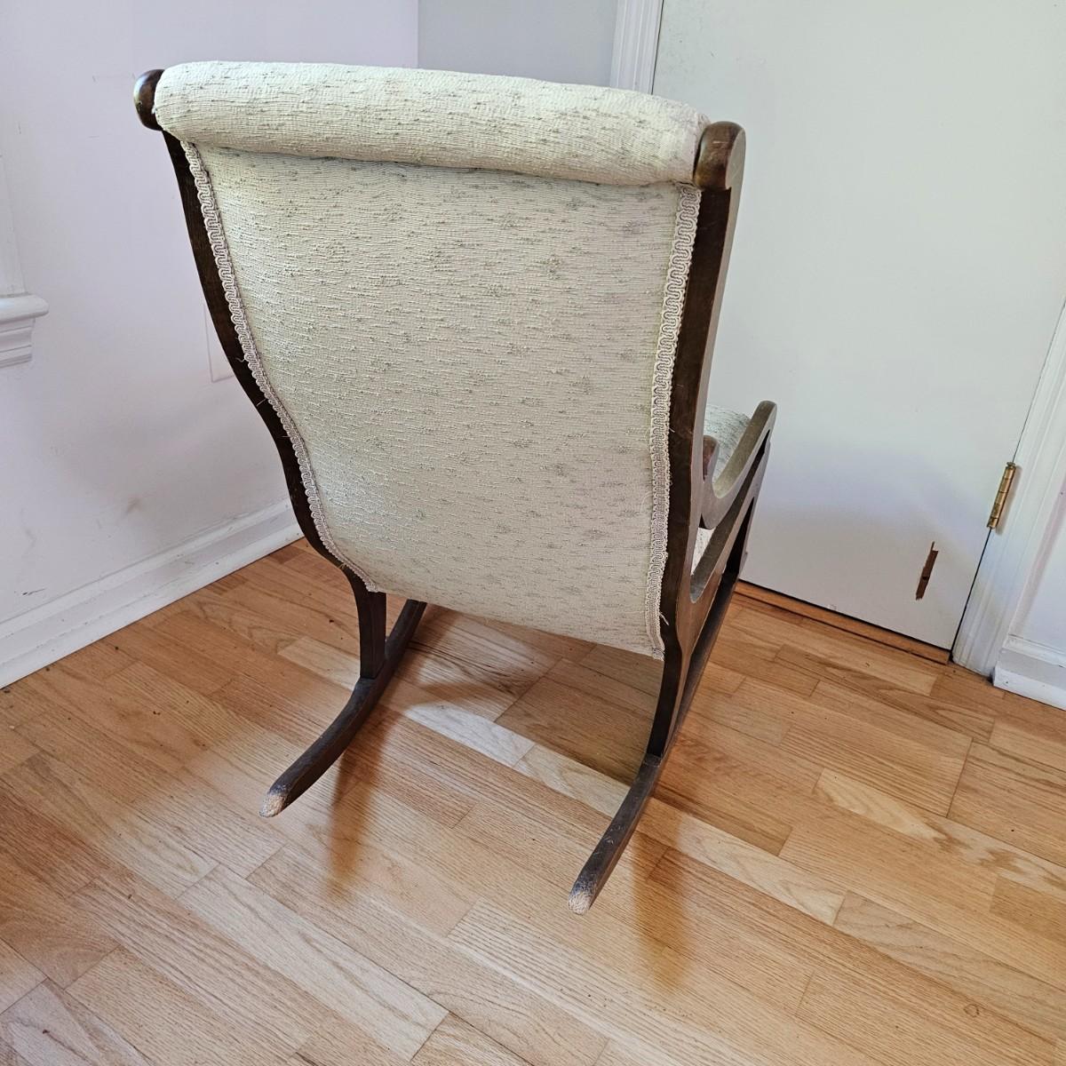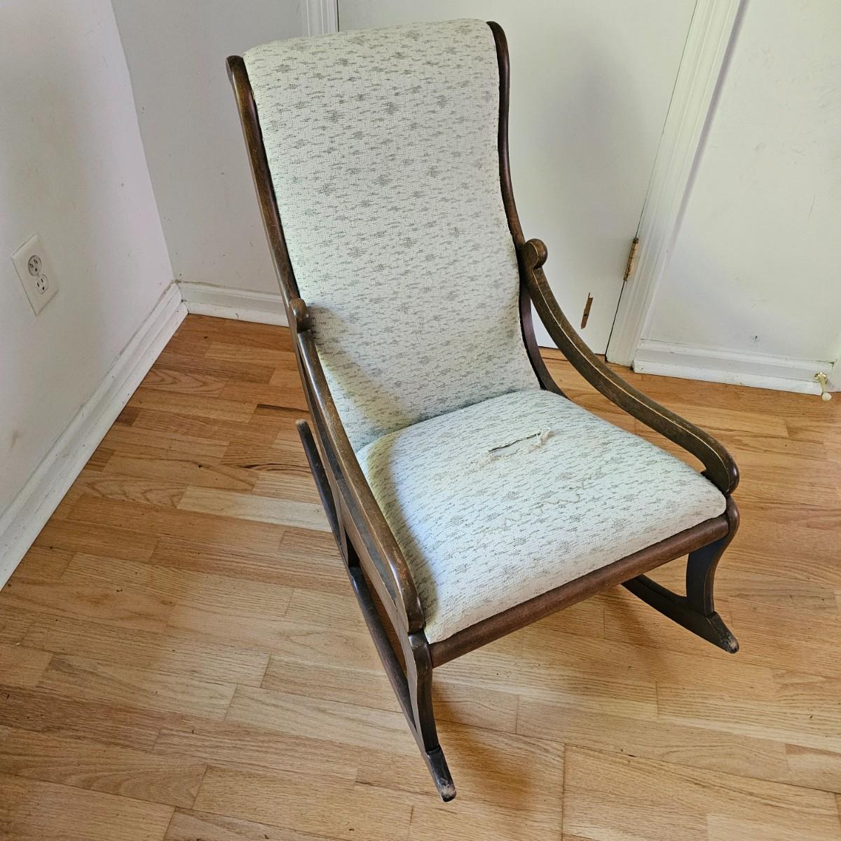 Wood frame cloth upholstered rocking chair and a stool that has the same upholstery; note stool has a stain.Smaller size, brocade type seat and back. Chair measures 19.5" x 28" x 30"H with seat height of 15". Bottom of rockers are worn, and seat has a tear and a stain. See photos for details.
