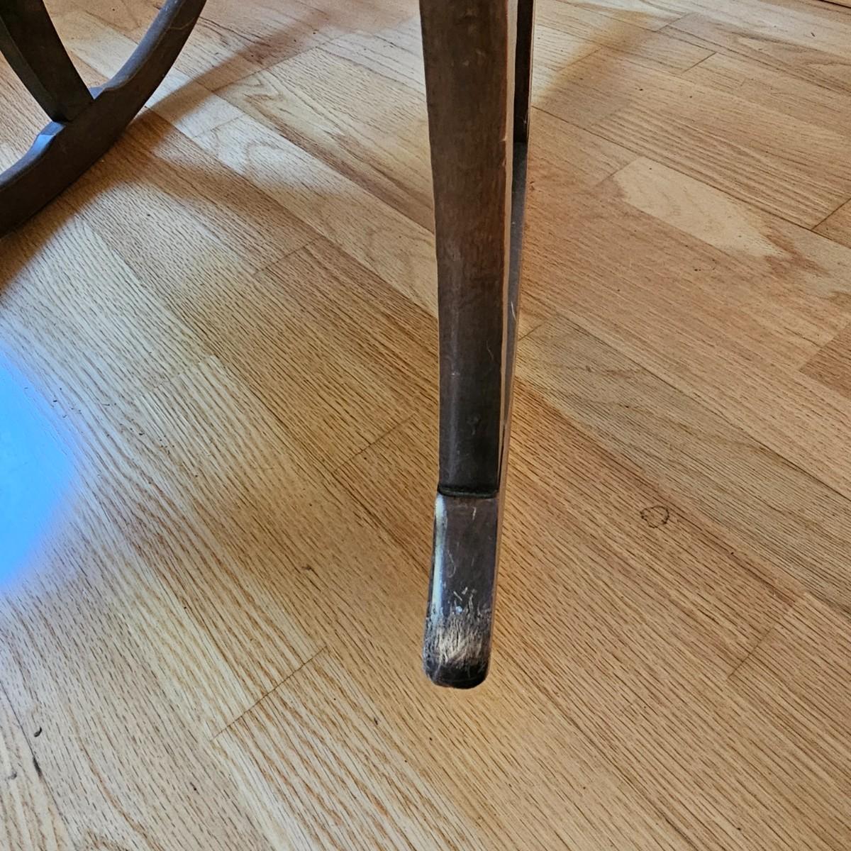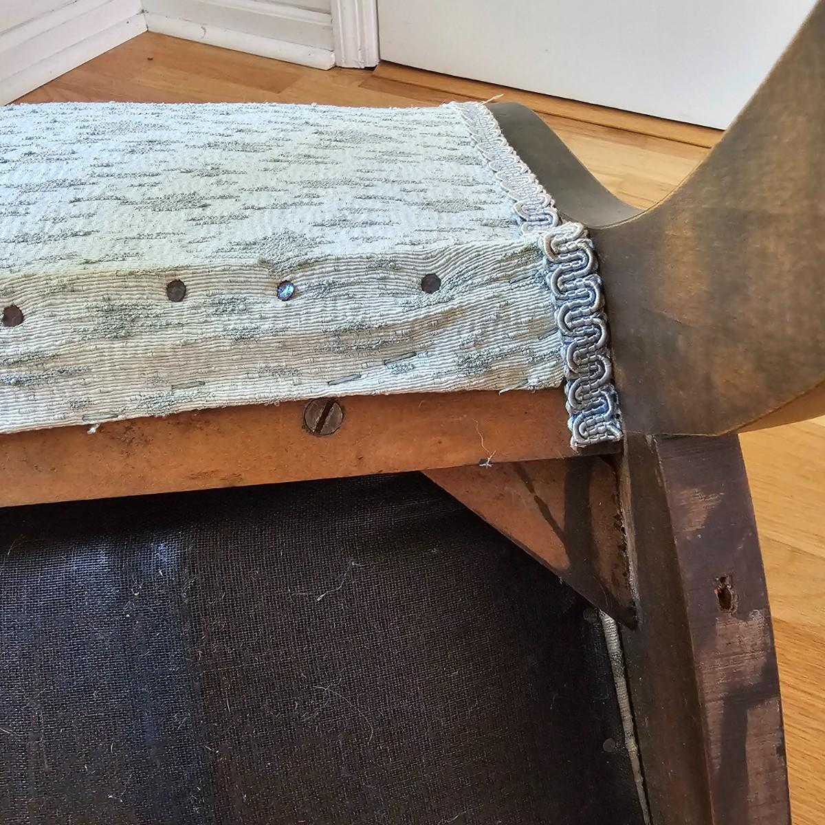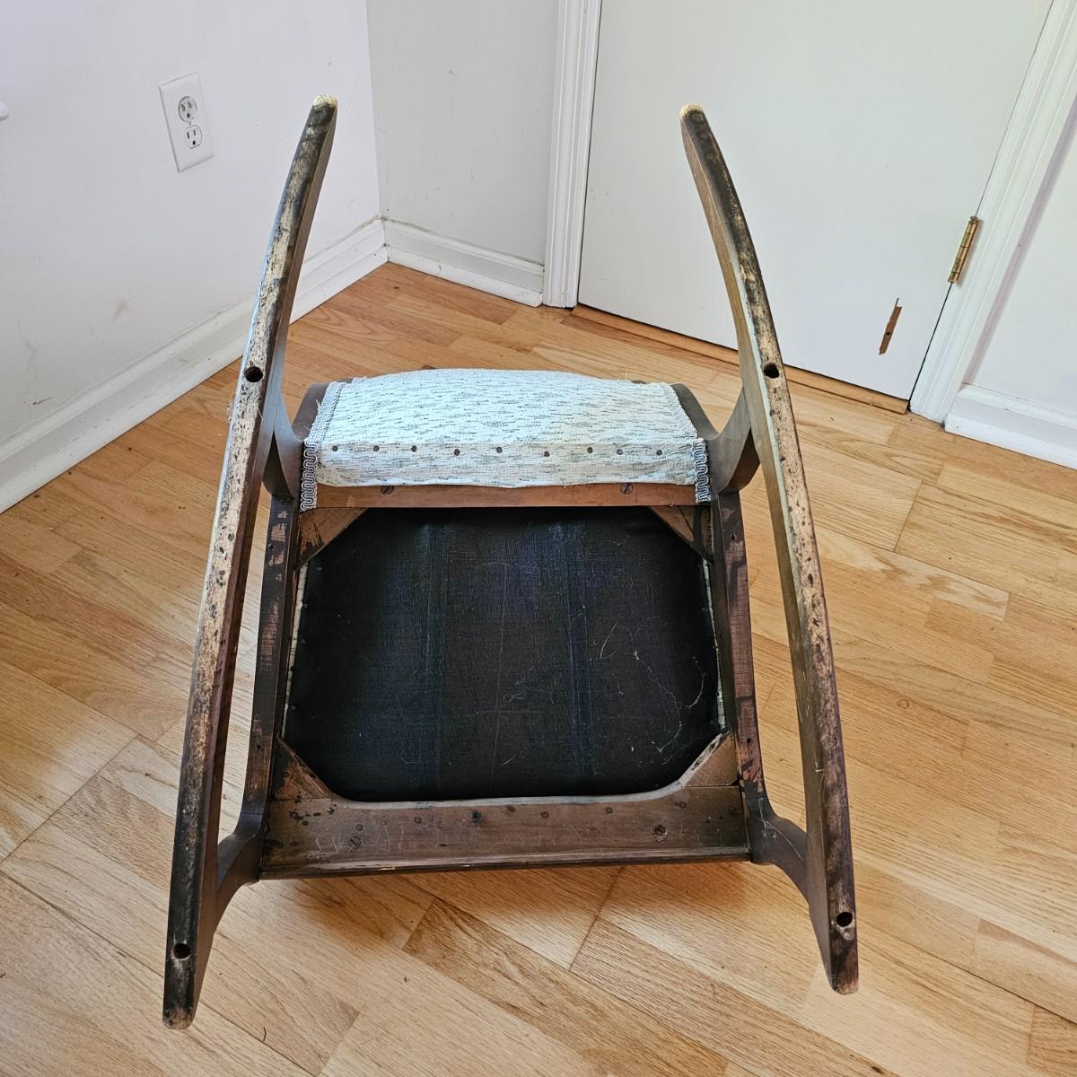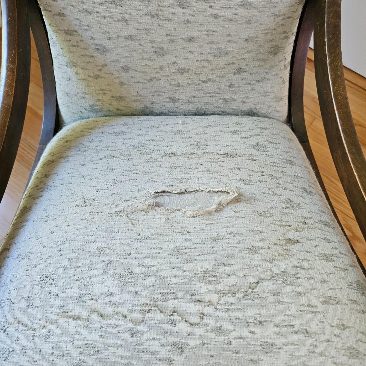 Wood frame cloth upholstered rocking chair and a stool that has the same upholstery; note stool has a stain.Smaller size, brocade type seat and back. Chair measures 19.5" x 28" x 30"H with seat height of 15". Bottom of rockers are worn, and seat has a tear and a stain. See photos for details.