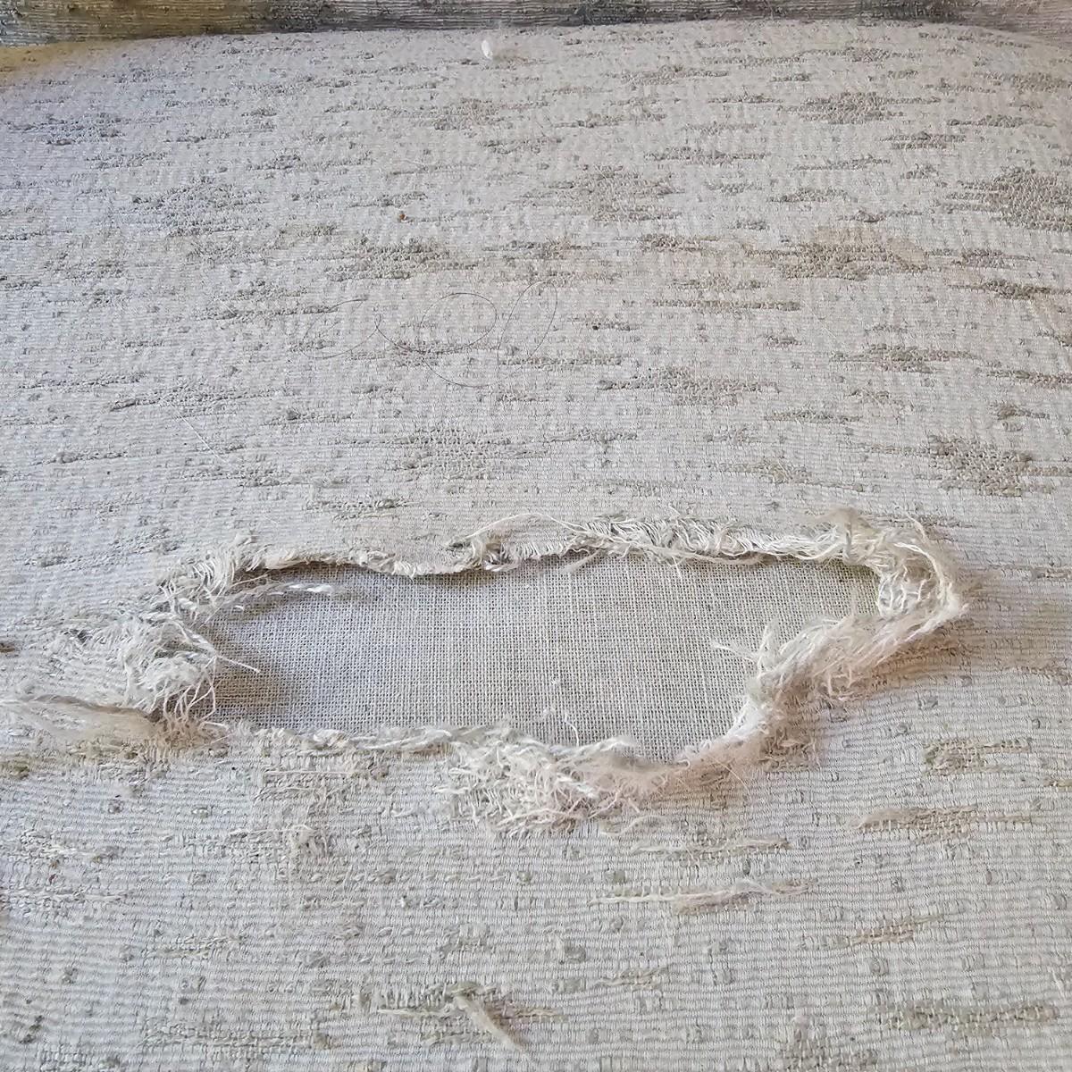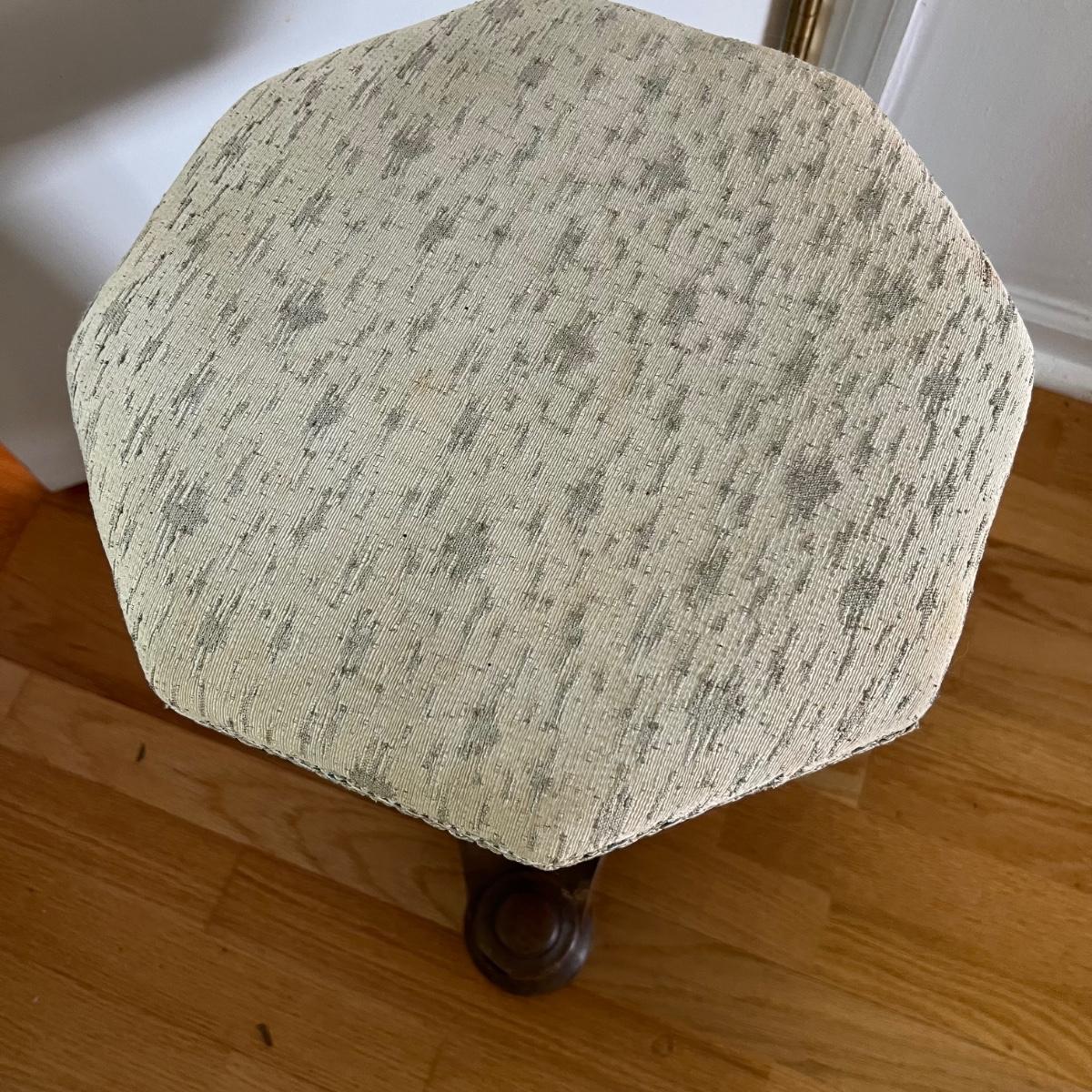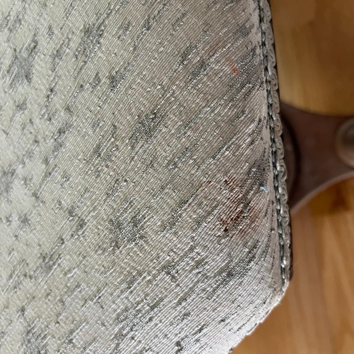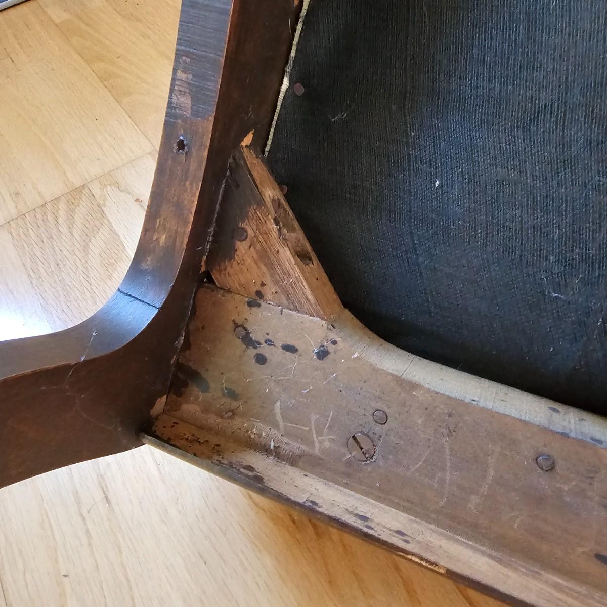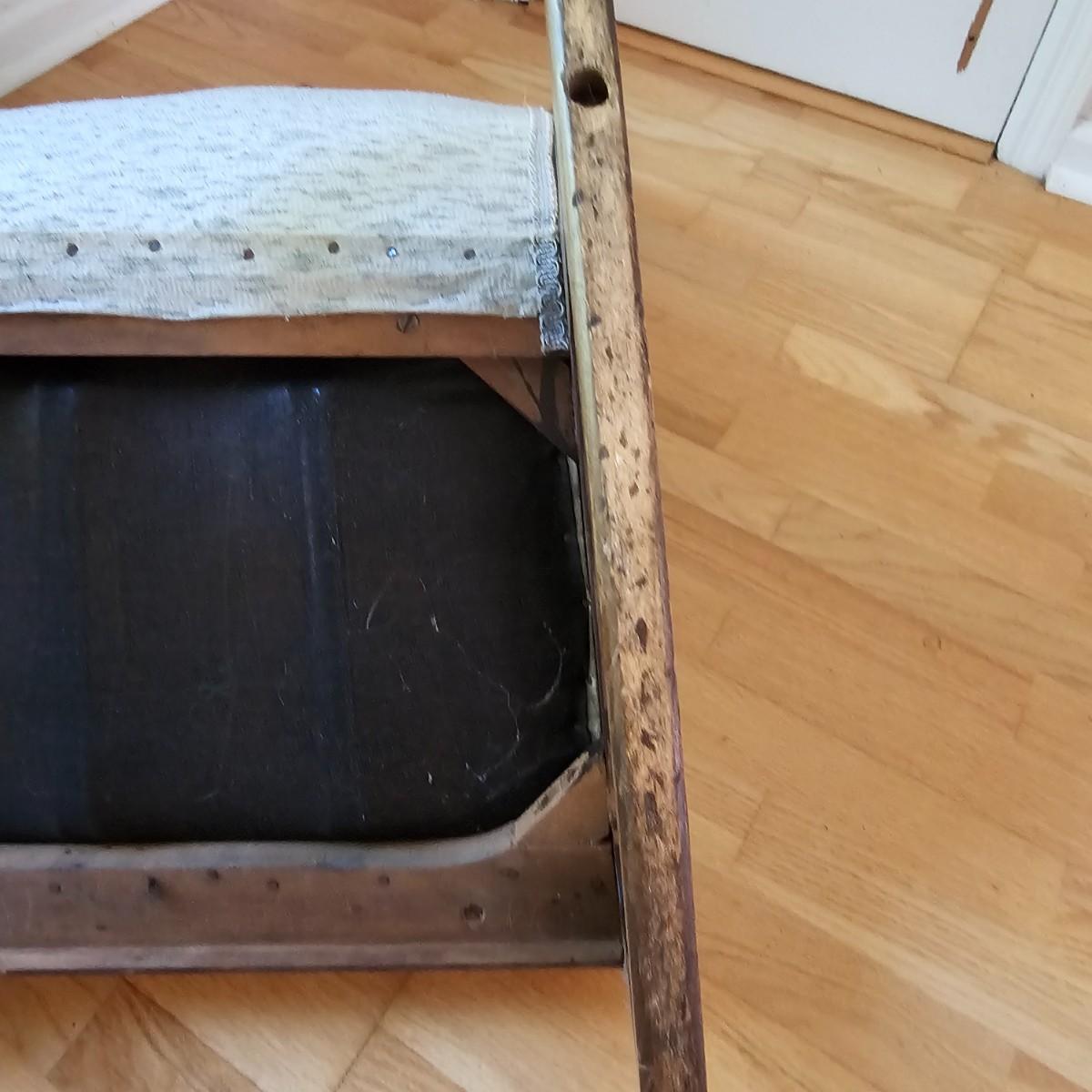 Wood frame cloth upholstered rocking chair and a stool that has the same upholstery; note stool has a stain.Smaller size, brocade type seat and back. Chair measures 19.5" x 28" x 30"H with seat height of 15". Bottom of rockers are worn, and seat has a tear and a stain. See photos for details.