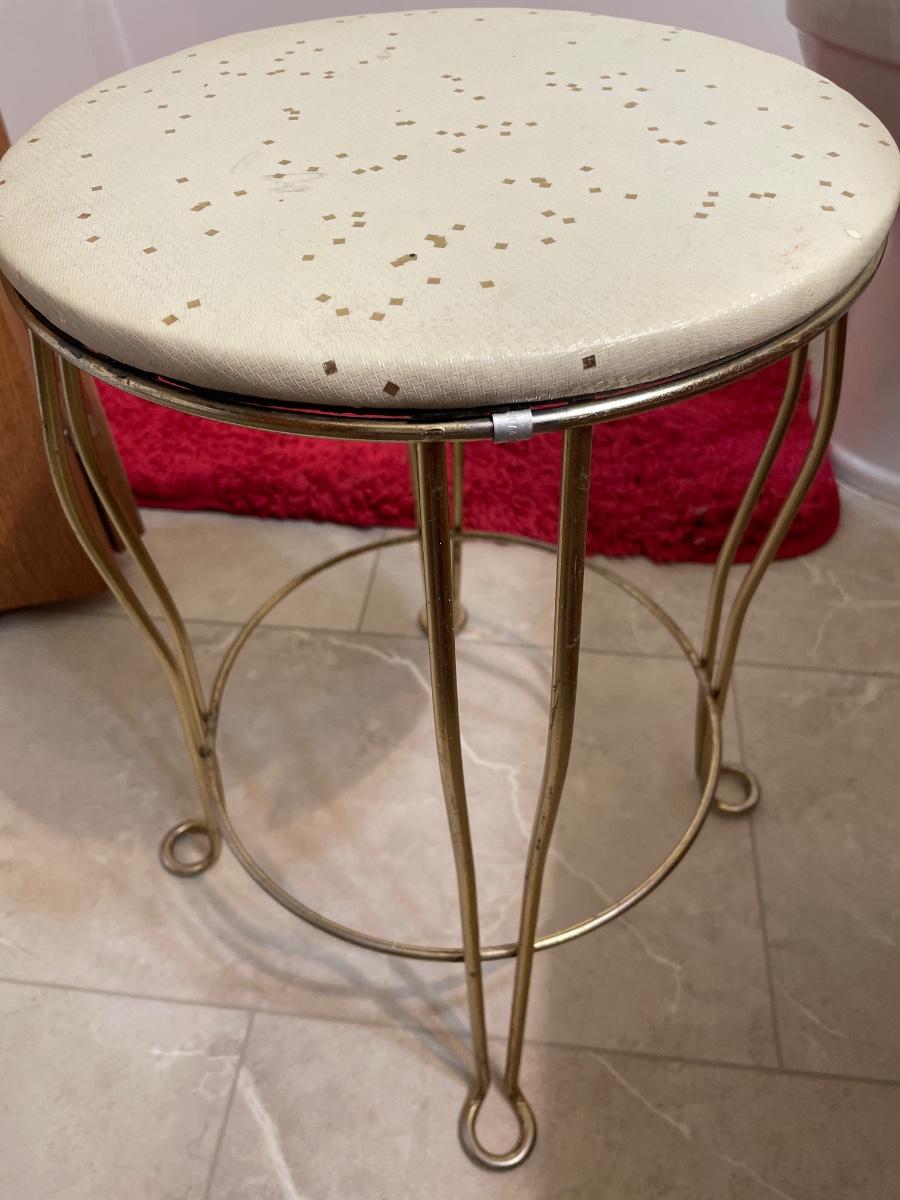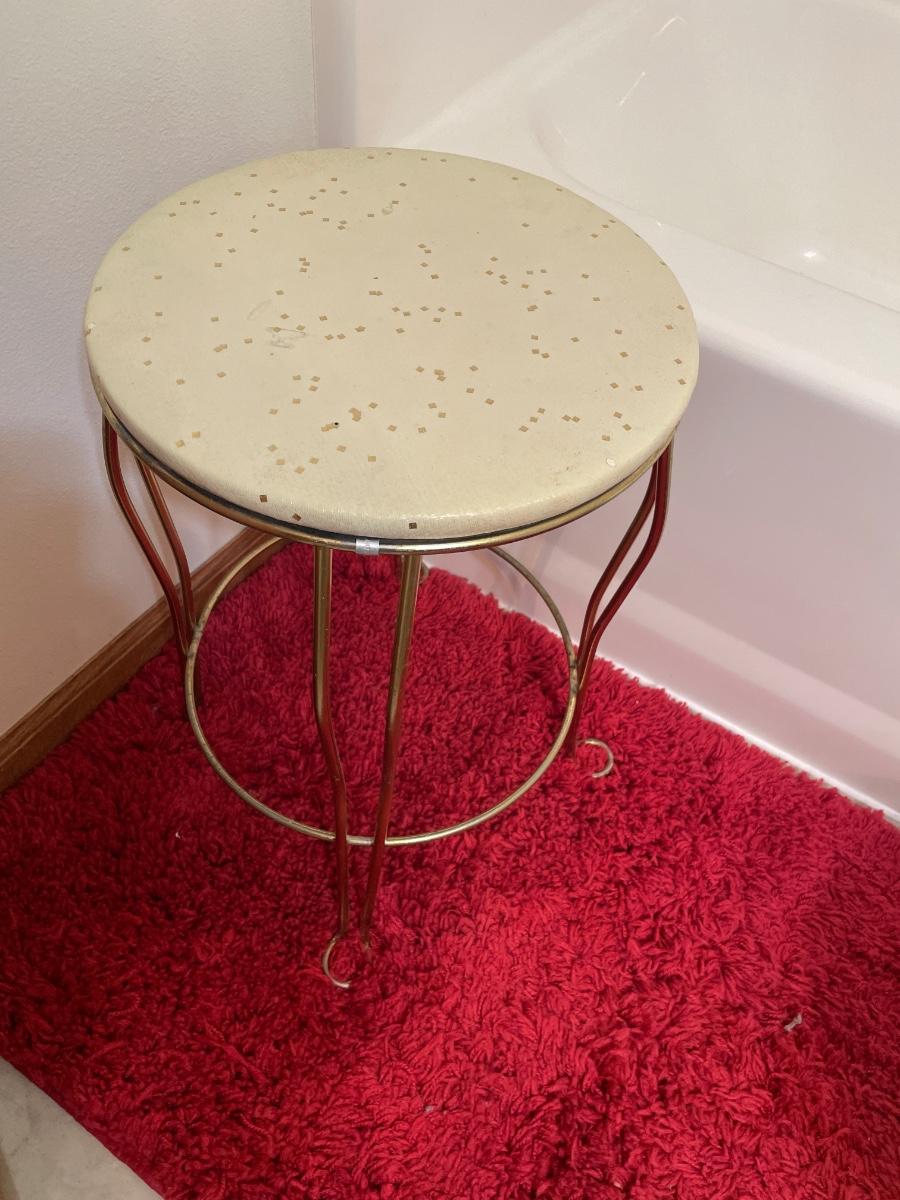 Red bathroom rug with small brass vanity stool