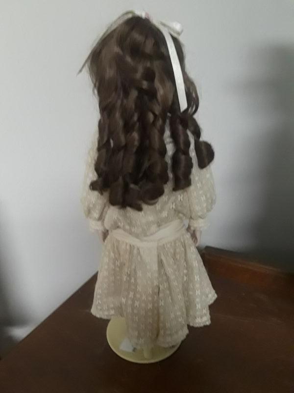 Small Porcelain/ Cloth Doll. Victorian Style Clothes. May be a little dusty. 21" tall.
