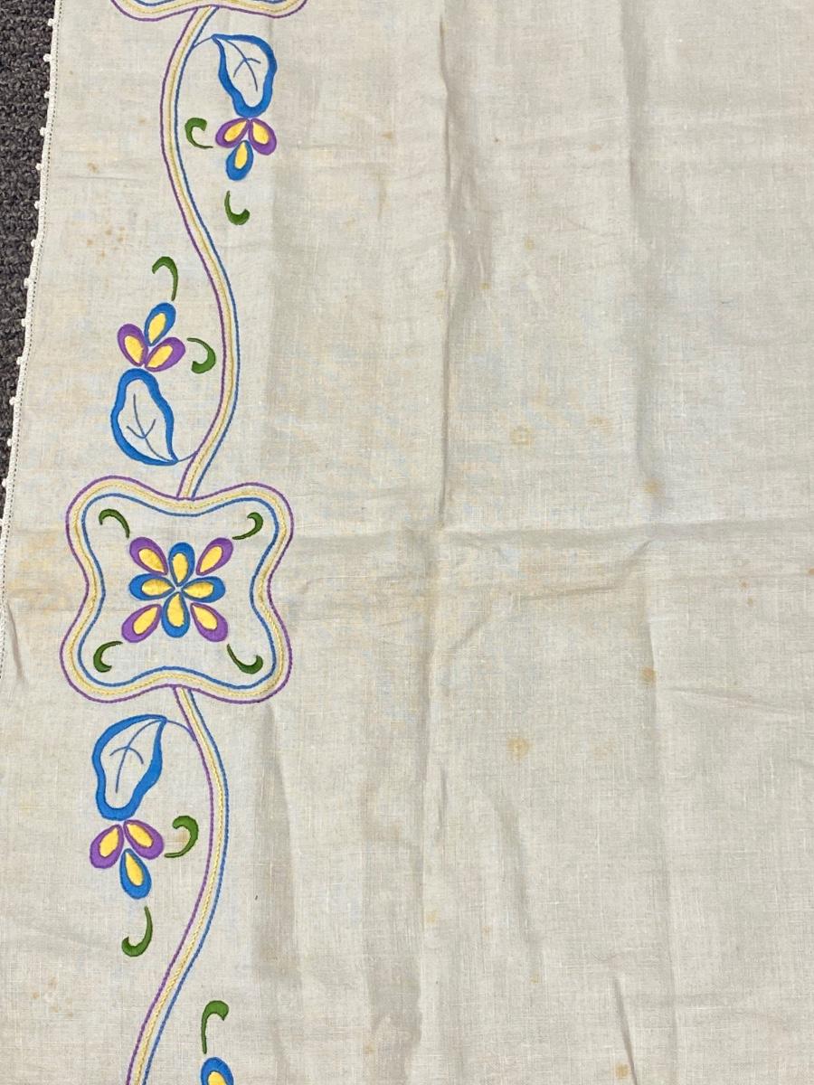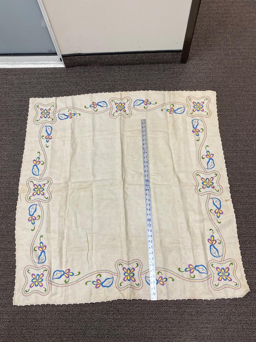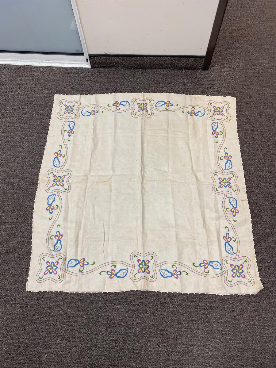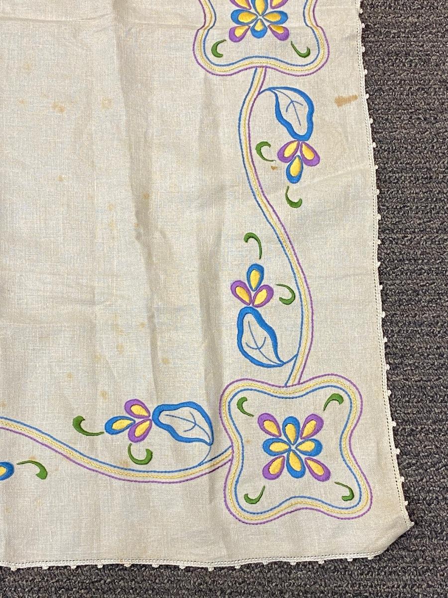 Small vintage embroidered tablecloth. Has some spots and discolor, about card table size.