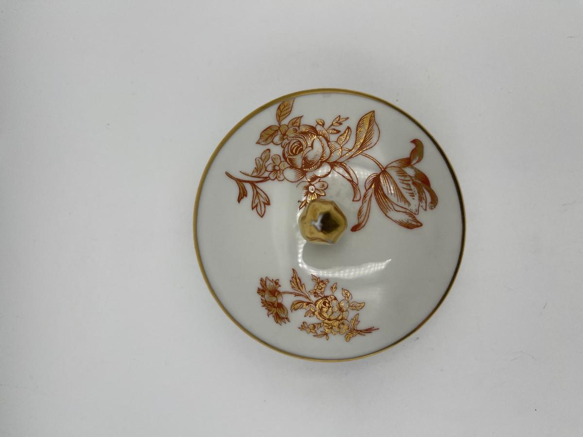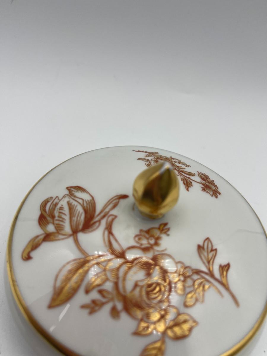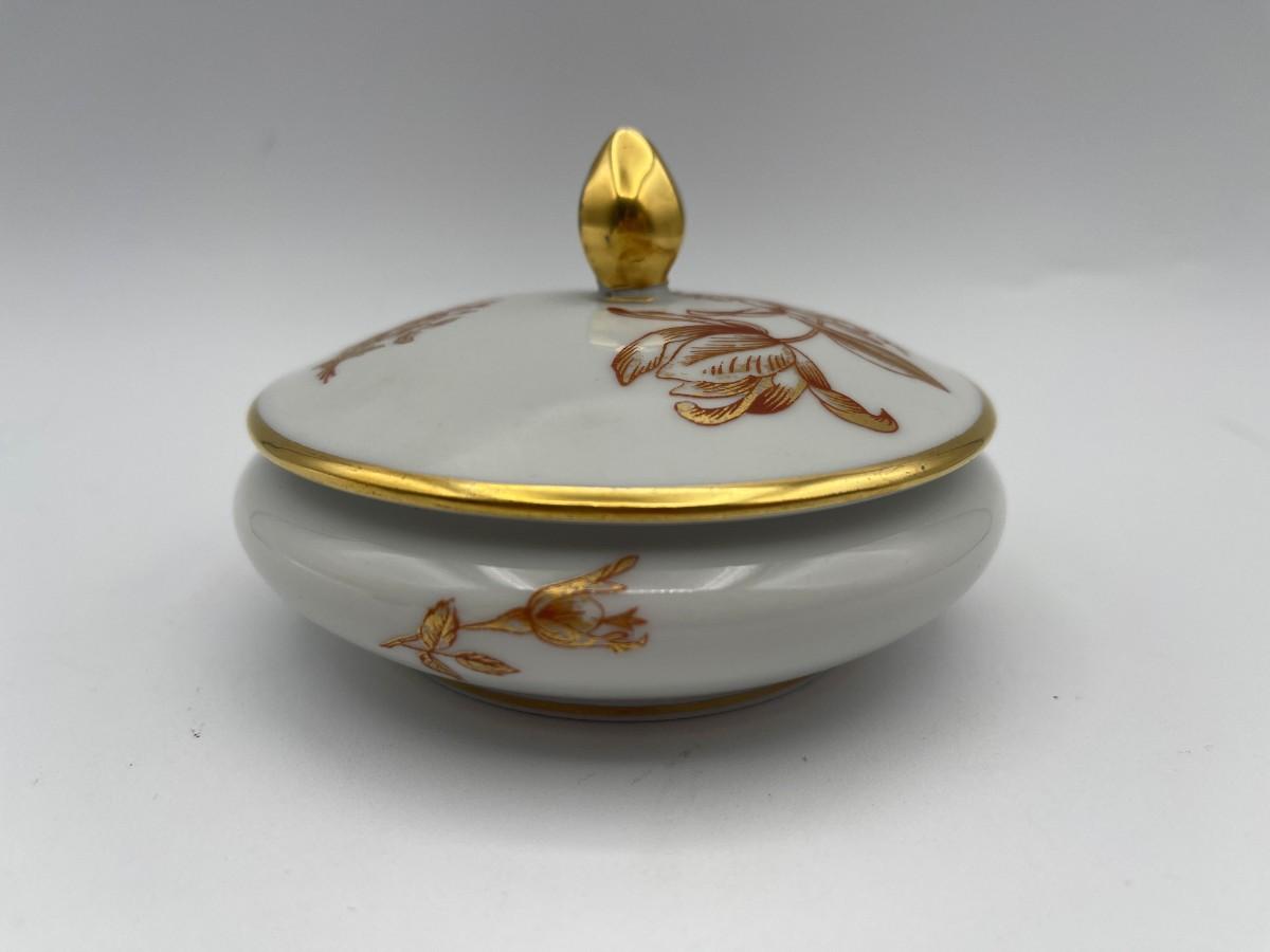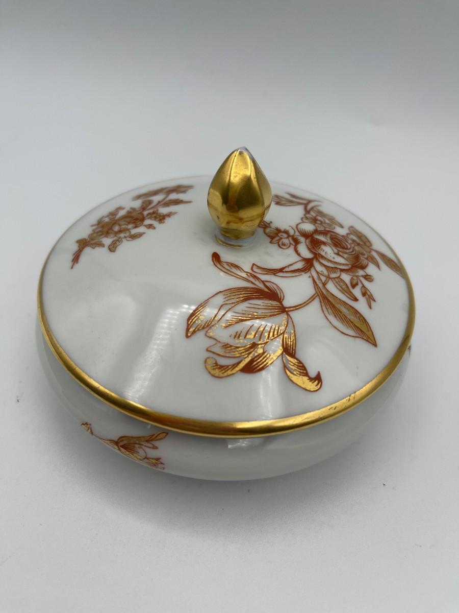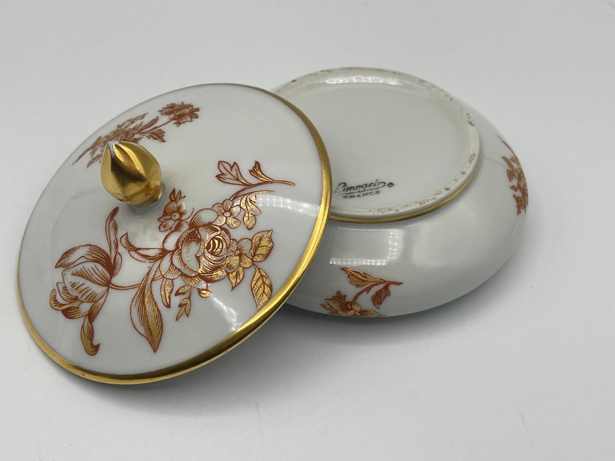 Limoges trinket dish with lid. Very good condition with some minor wear to the gold on the lid finial. 3 1/4" Diameter. # 667