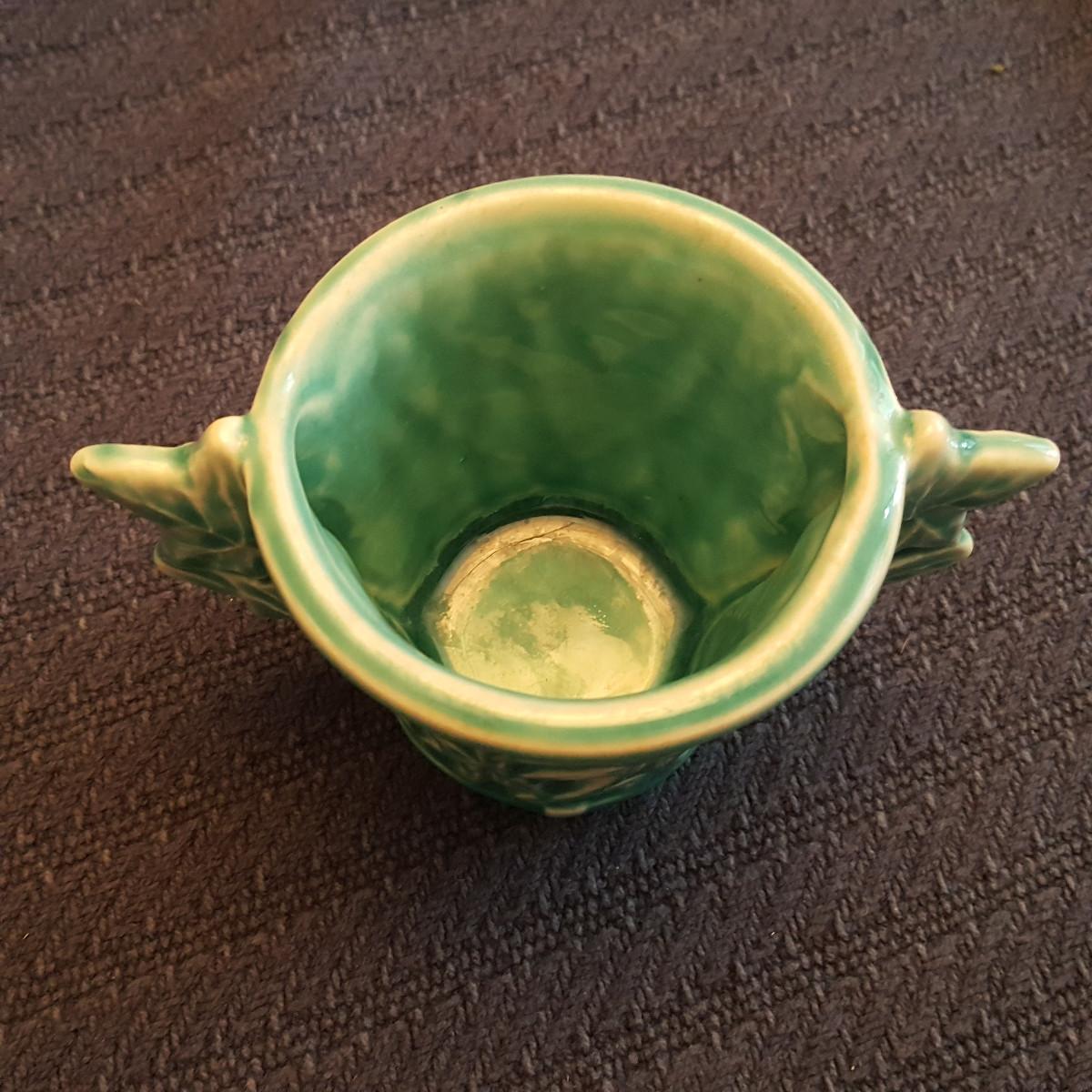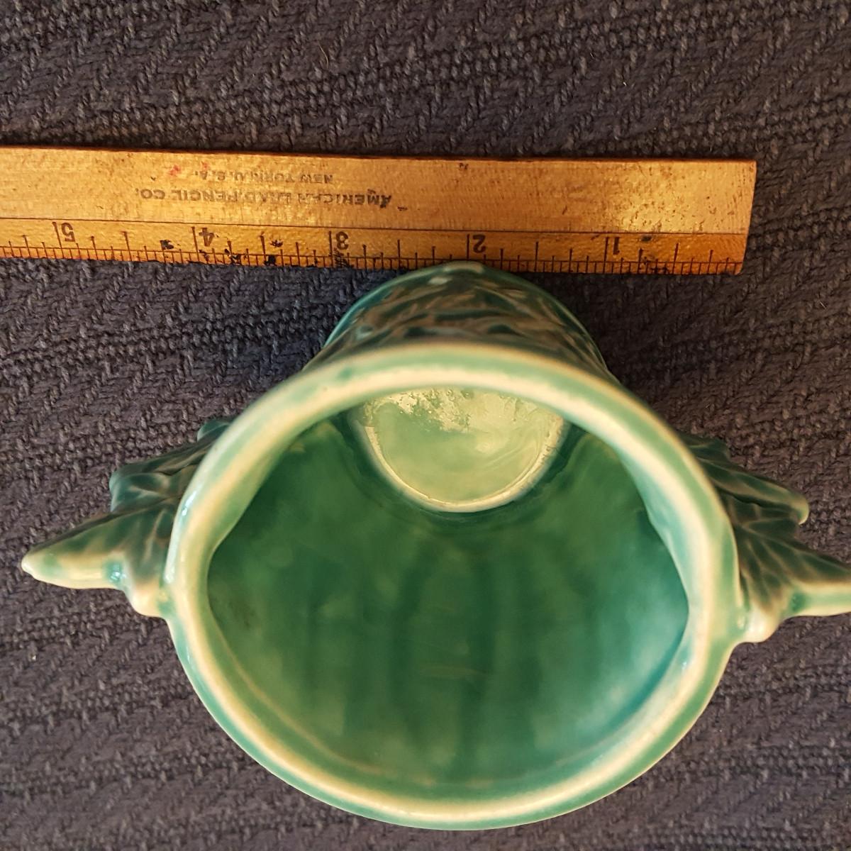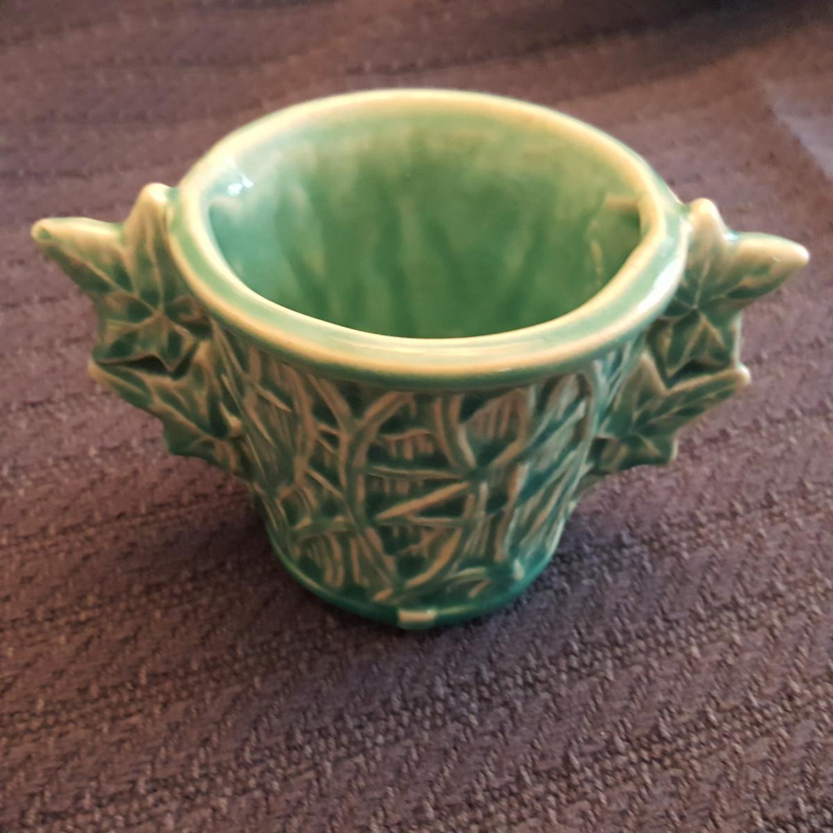 This auction lot is for a small Vintage McCoy Pot. This fun pot/vase is just perfect for a miniature succulent or two. The pot is a great turquoise-y color and has deep, defined molding with leaf handles. So cute. See photo for sizing.