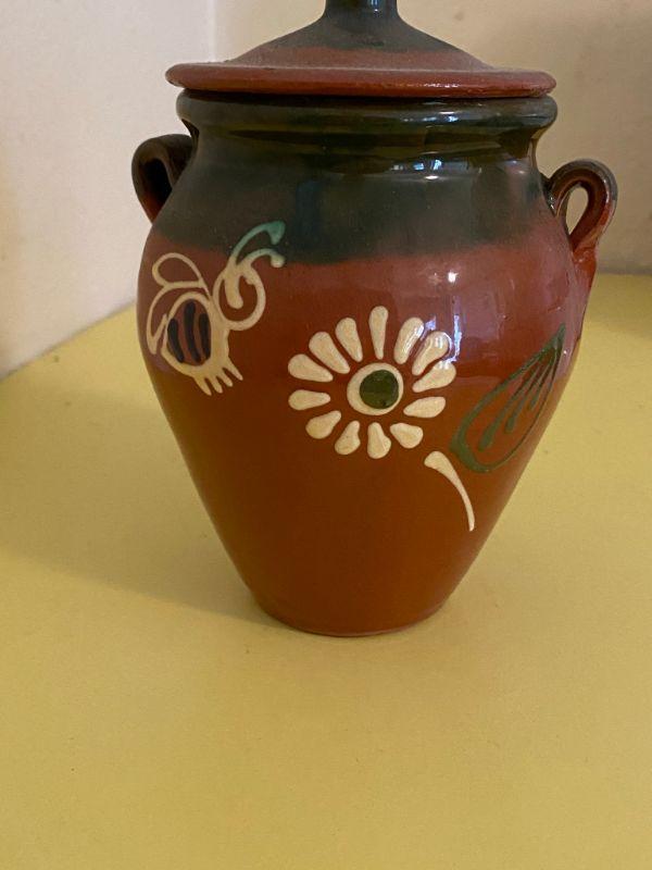 Small vintage honey pot. Has the brand on one side and a bee with flower painted on the other. Good condition. About 6" size.
