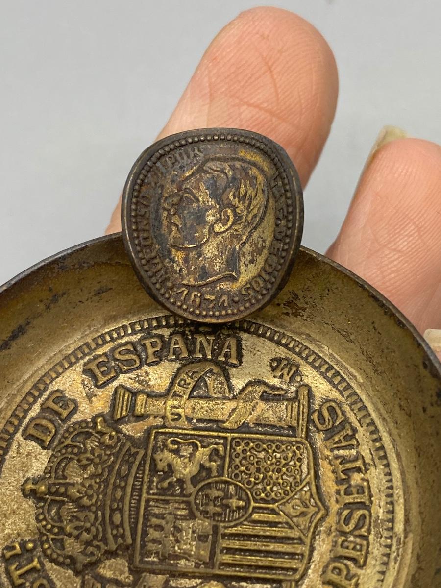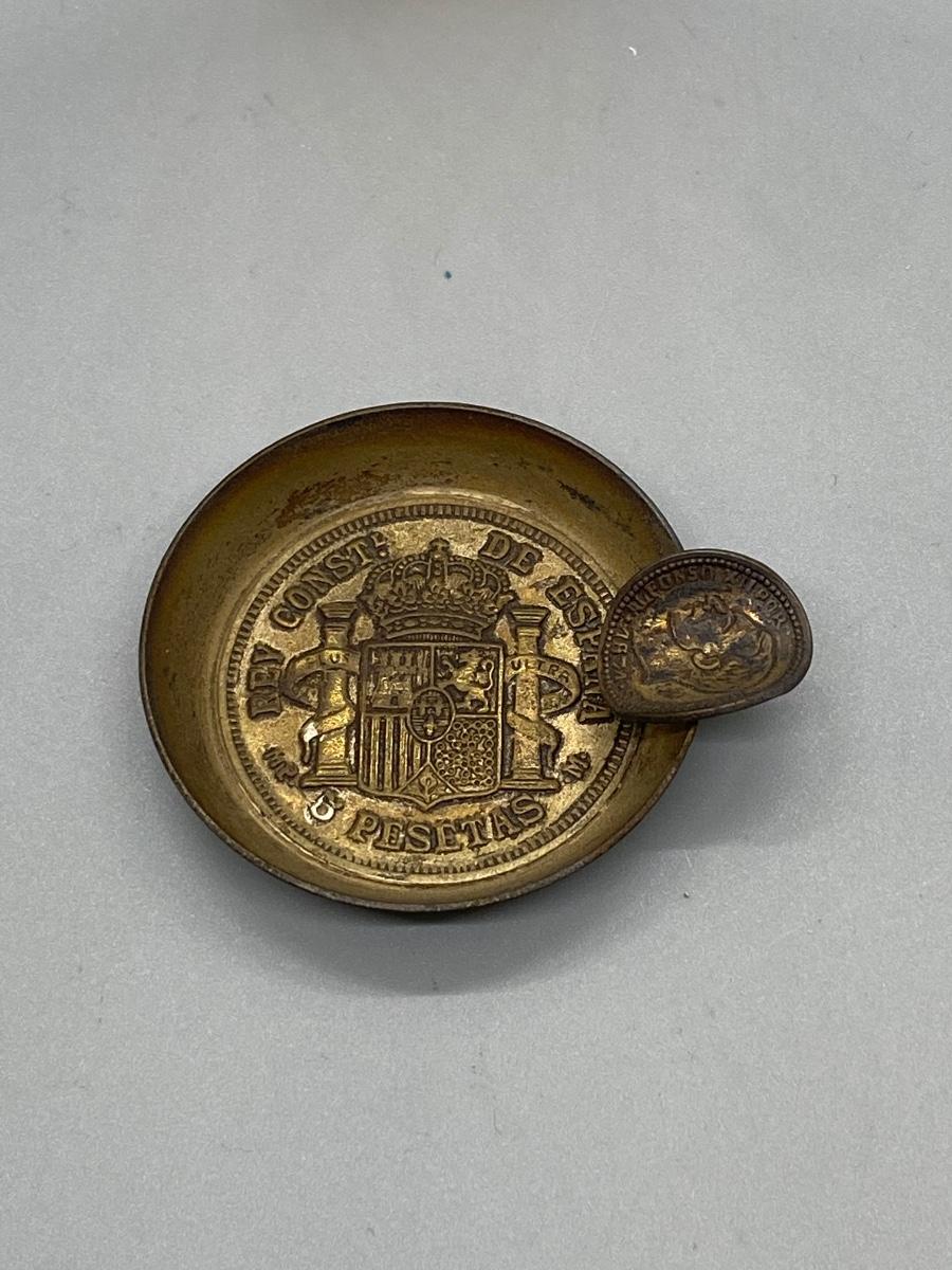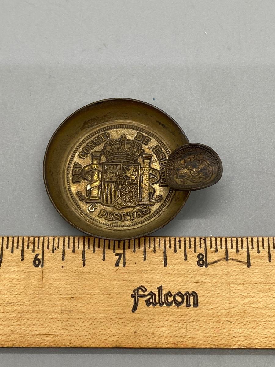 Small mini foreign souvenir ashtray. Possibly from Spain. Looks like a coin is used for the cigarette holder. Only about 2" size.