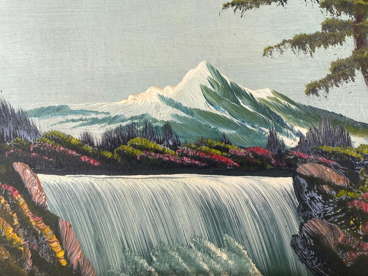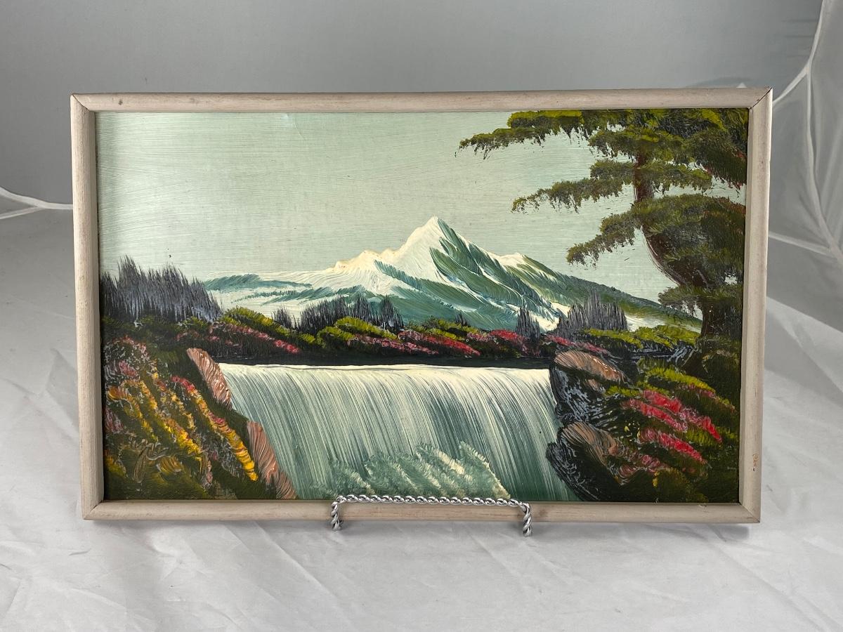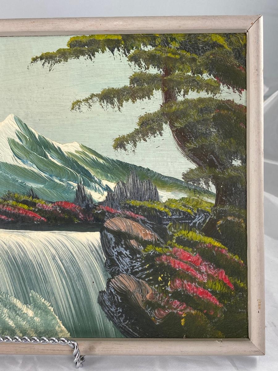Small vintage oil painting of a mountain overlooking a waterfall with colorful blooms around it. Dome on thick cardboard. In good condition. Only about 8"x12" size.