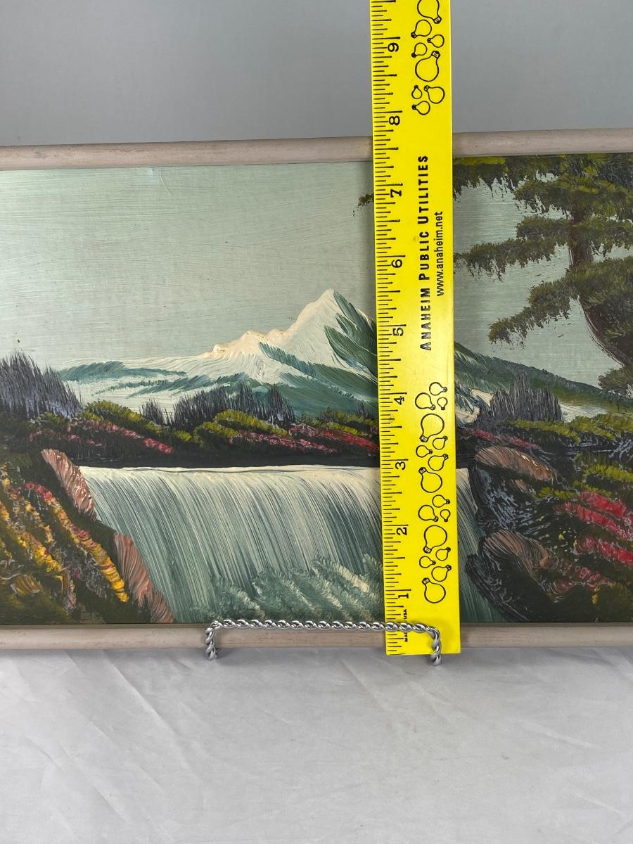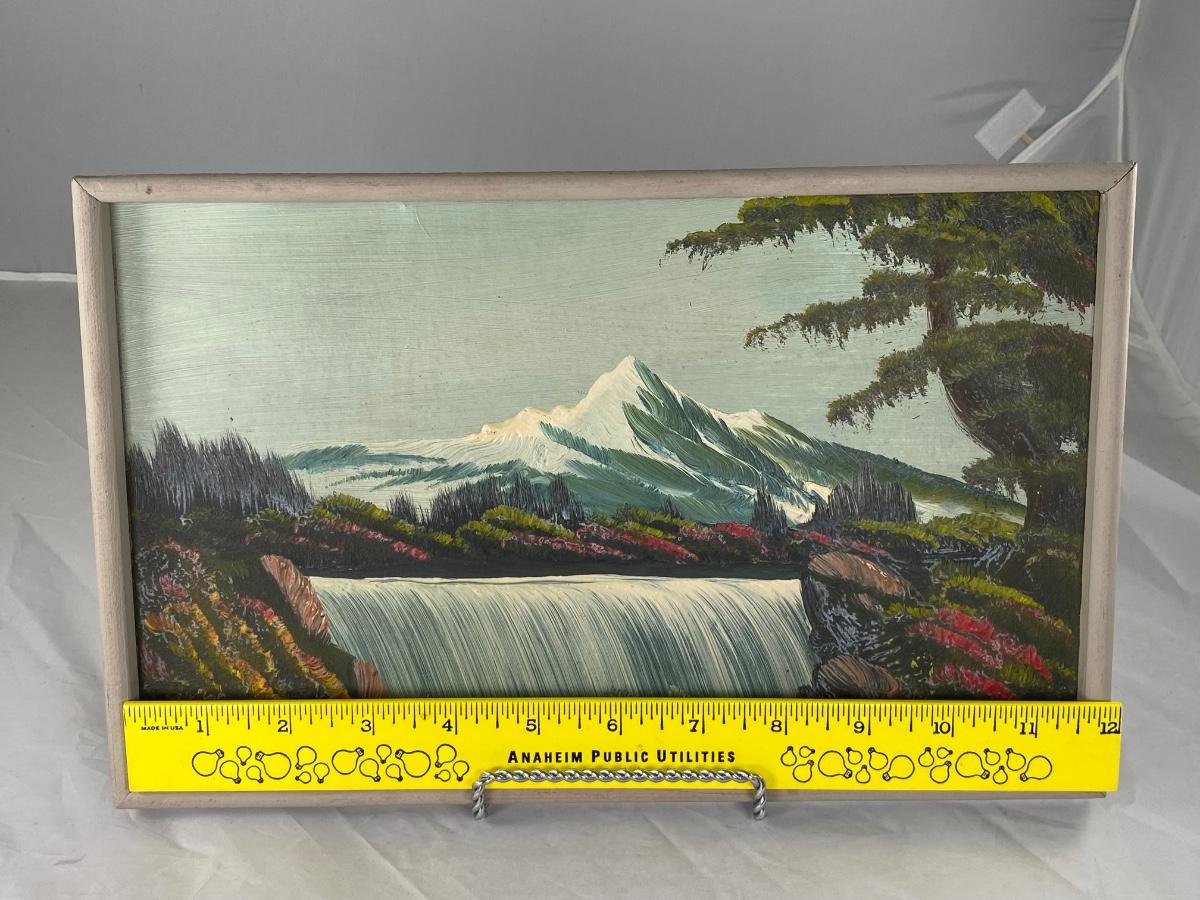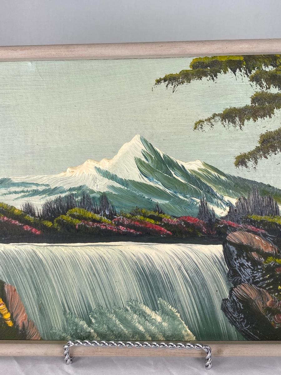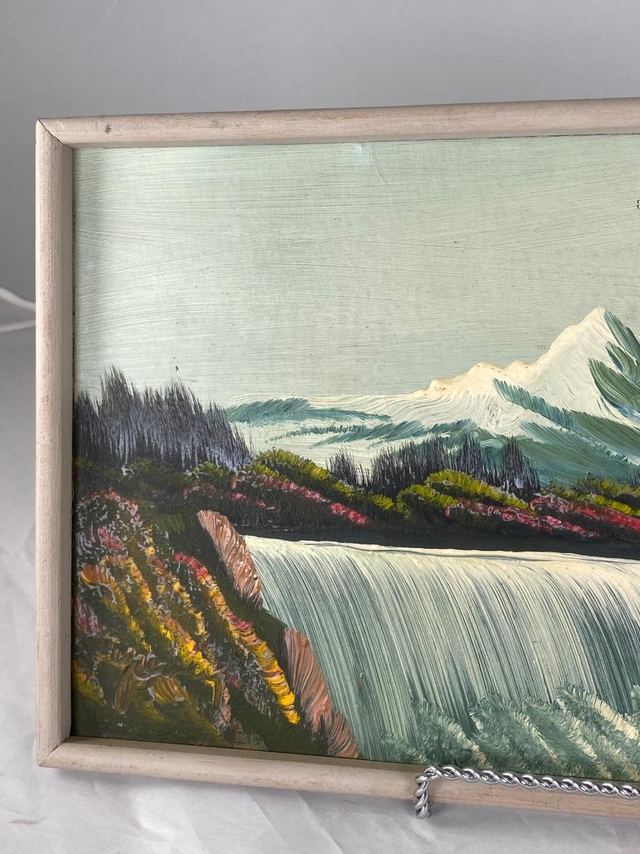 Small vintage oil painting of a mountain overlooking a waterfall with colorful blooms around it. Dome on thick cardboard. In good condition. Only about 8"x12" size.