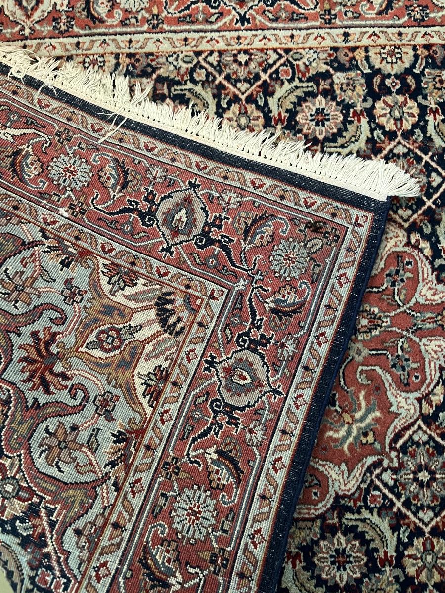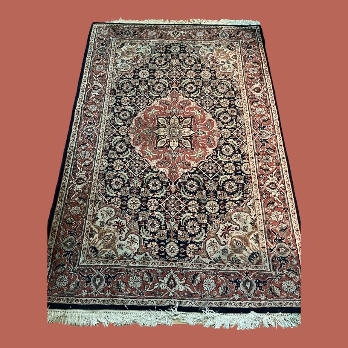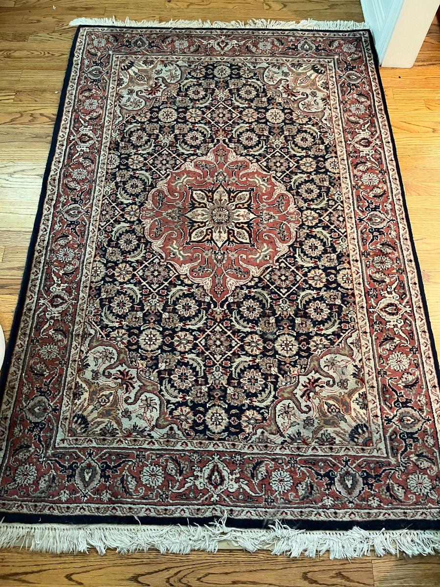 73"l x 48"w (6' x 4')--hand woven Persian area rug in black rose, beige and ivory. Excellent condition.