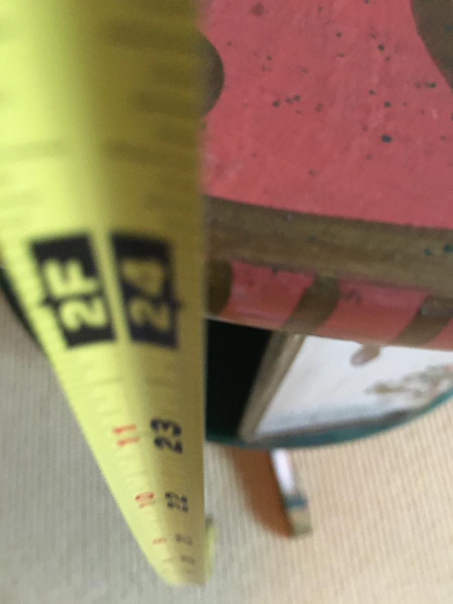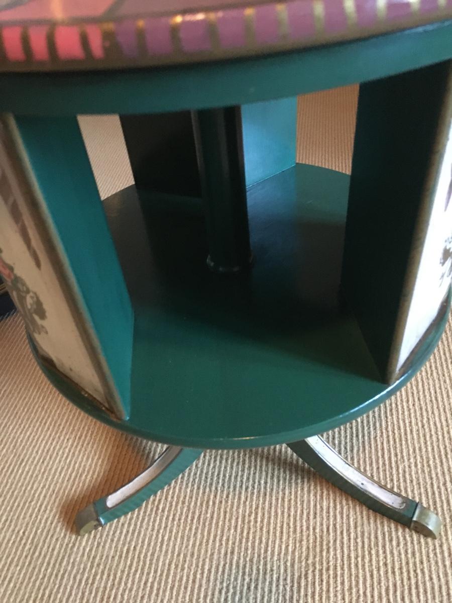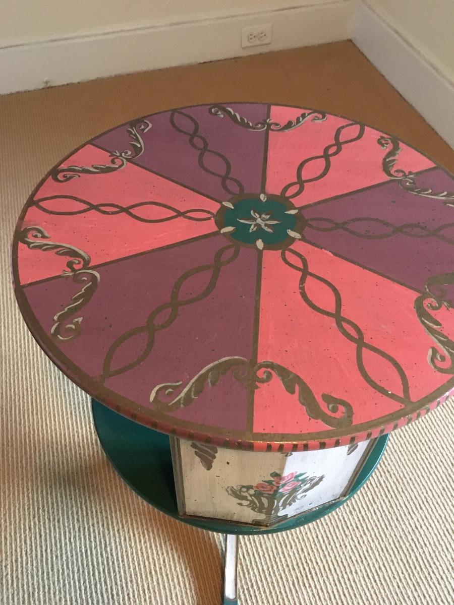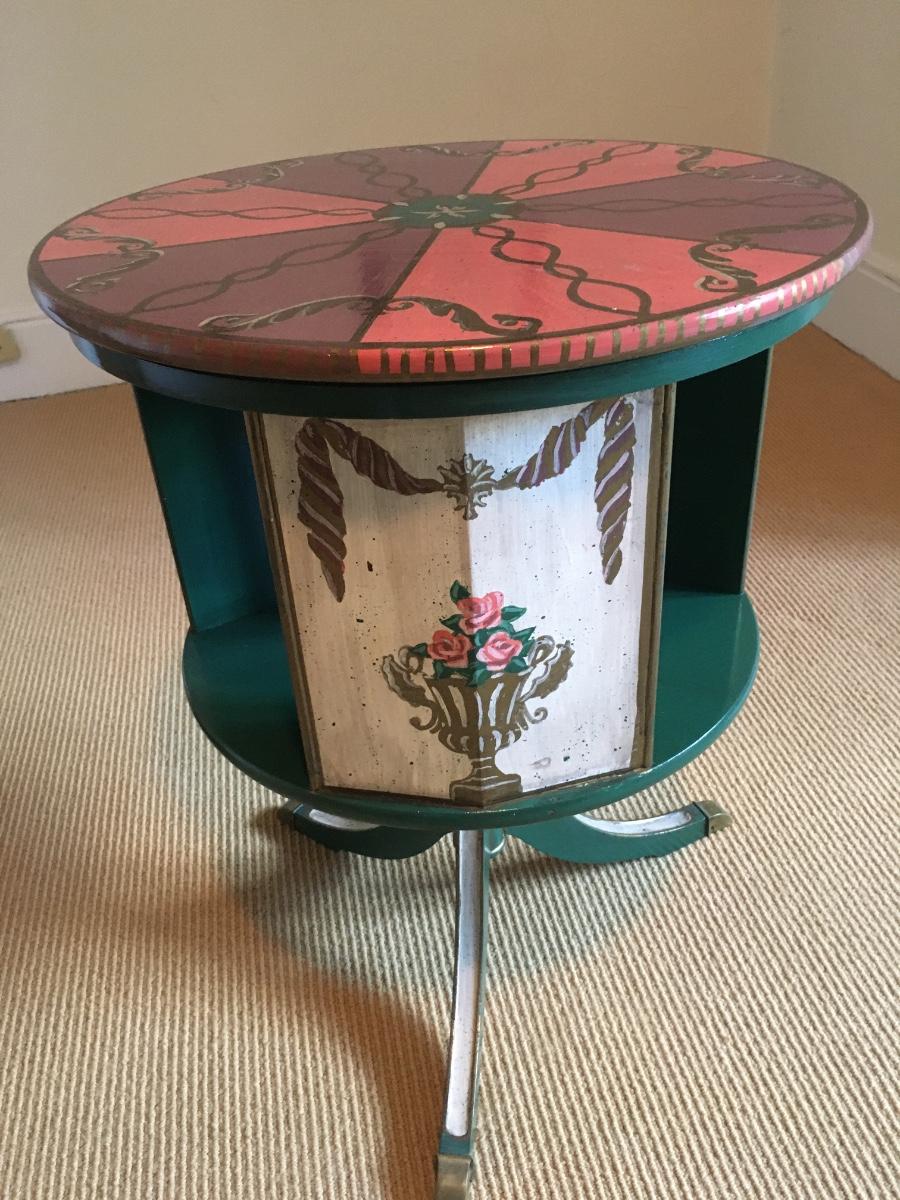 Add a touch of whimsy to any room with this small painted table. Open spaces for storage.