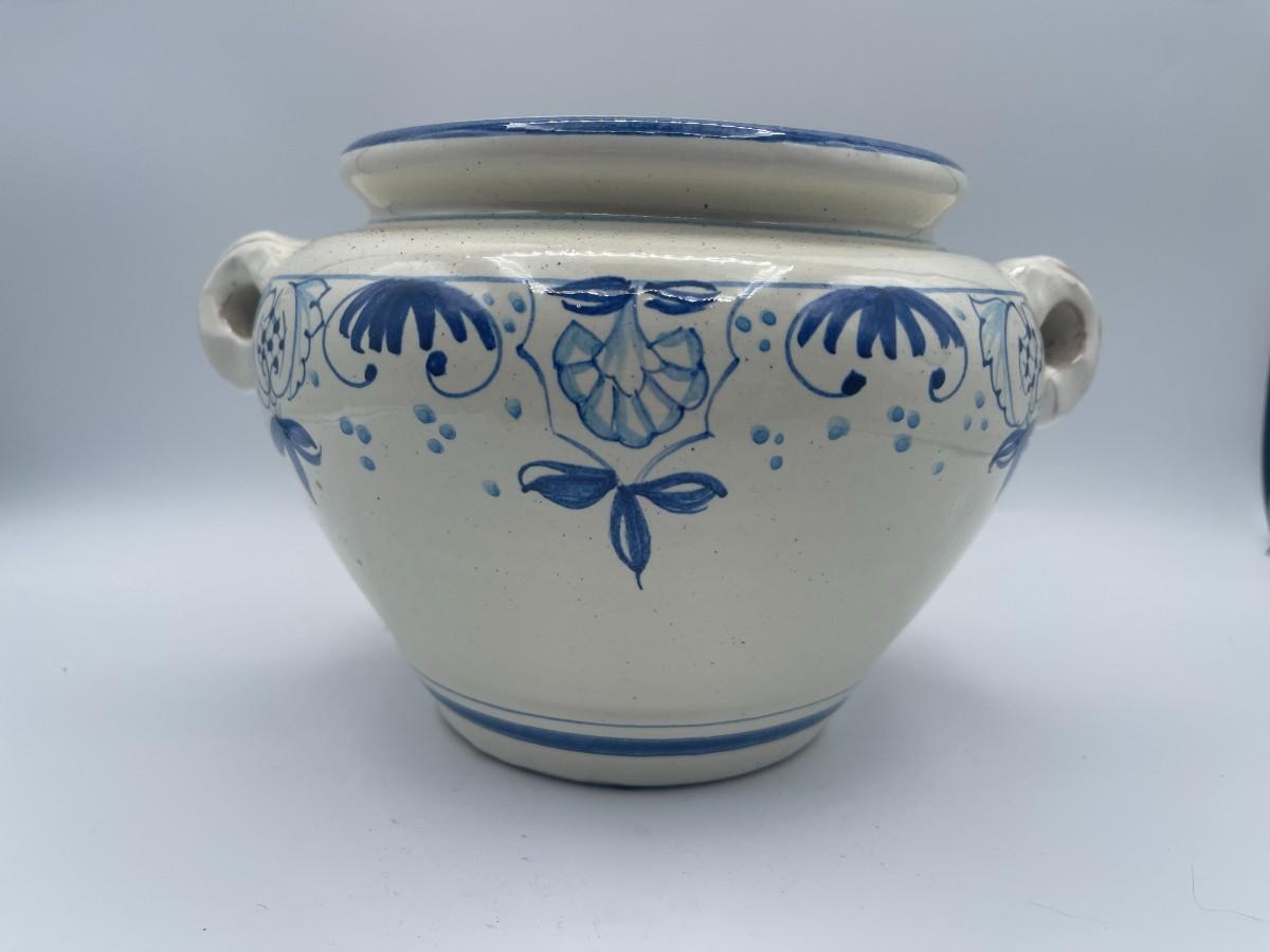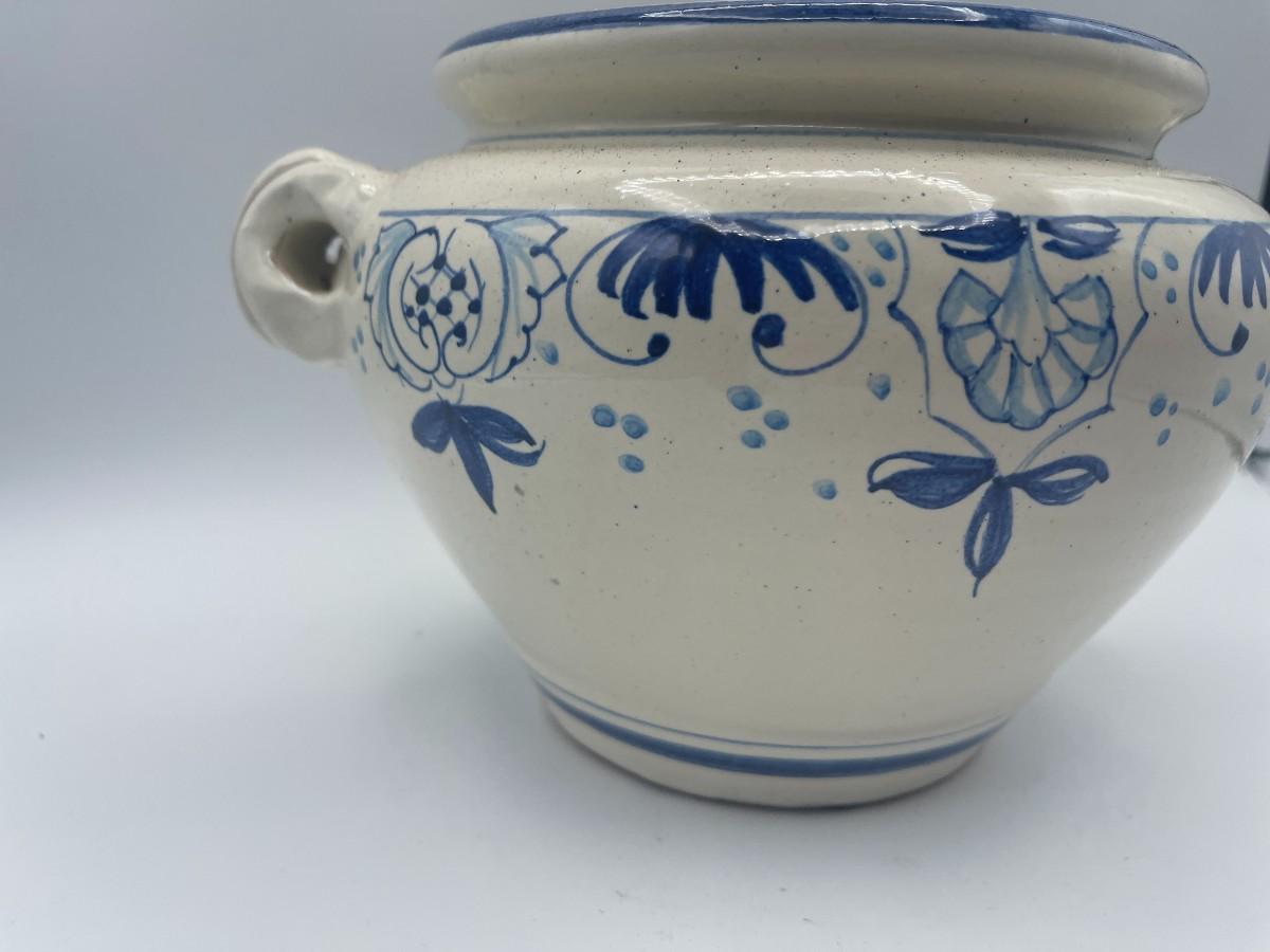 Ciao! Lovely terra cotta pot, made in Italy, possibly for the tourist trade. Lovely white background with pale blue accents recalls warm days in the Mediterranean sun. Great to hold salt in the kitchen. Approx 6" W at mouth x 6.25" H x 9" W # 817