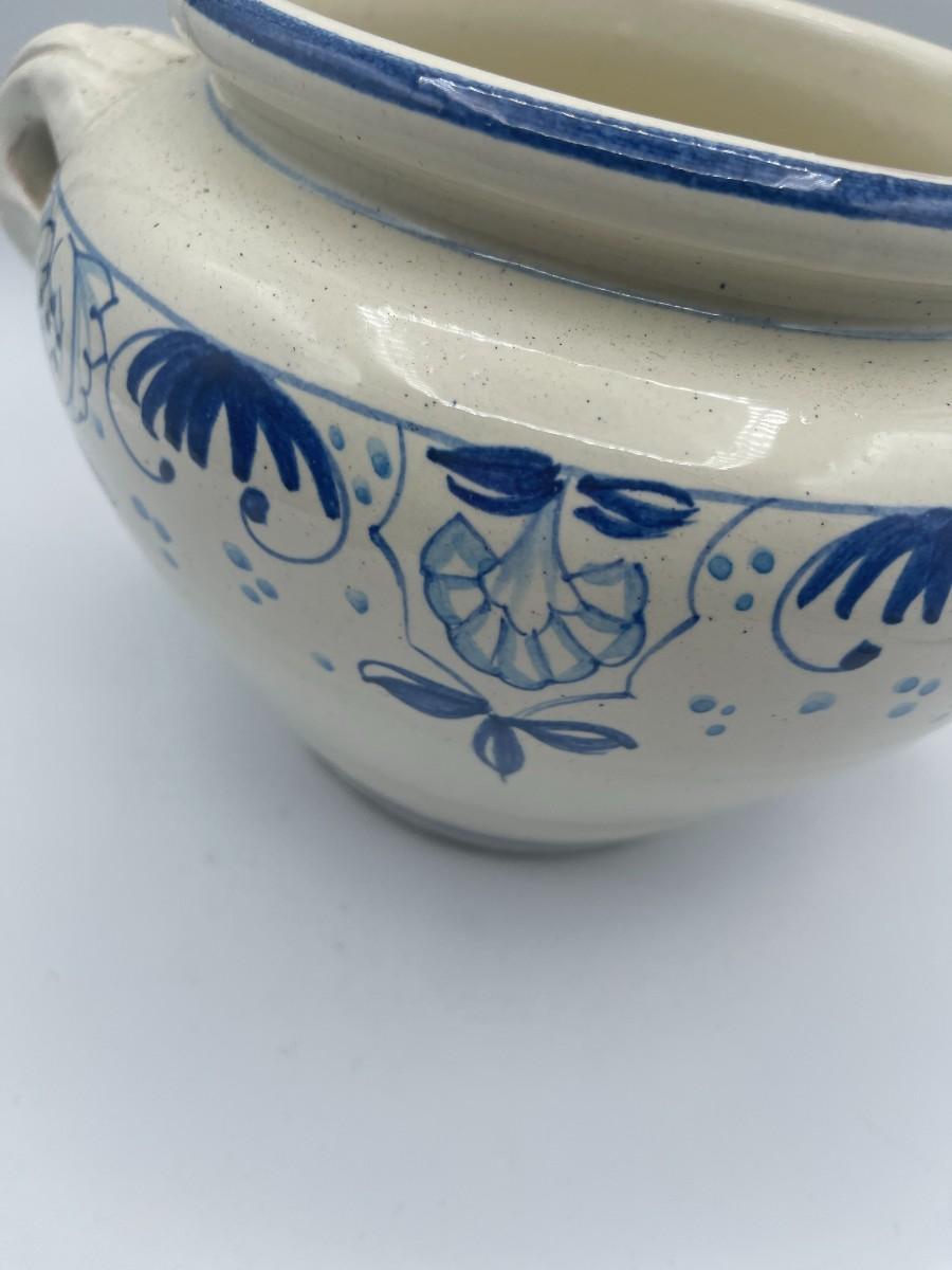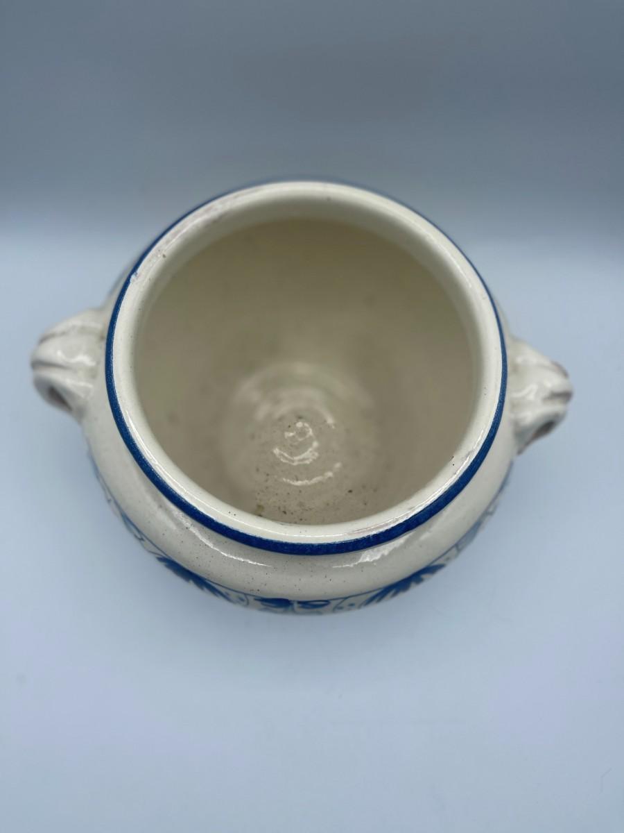 Small, Vintage White & Blue Terra Cotta Handled Jar