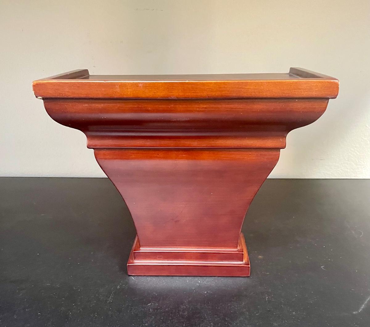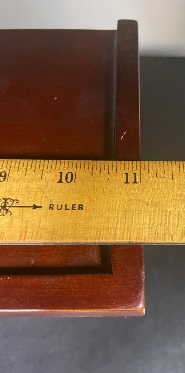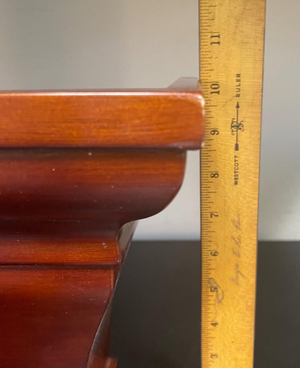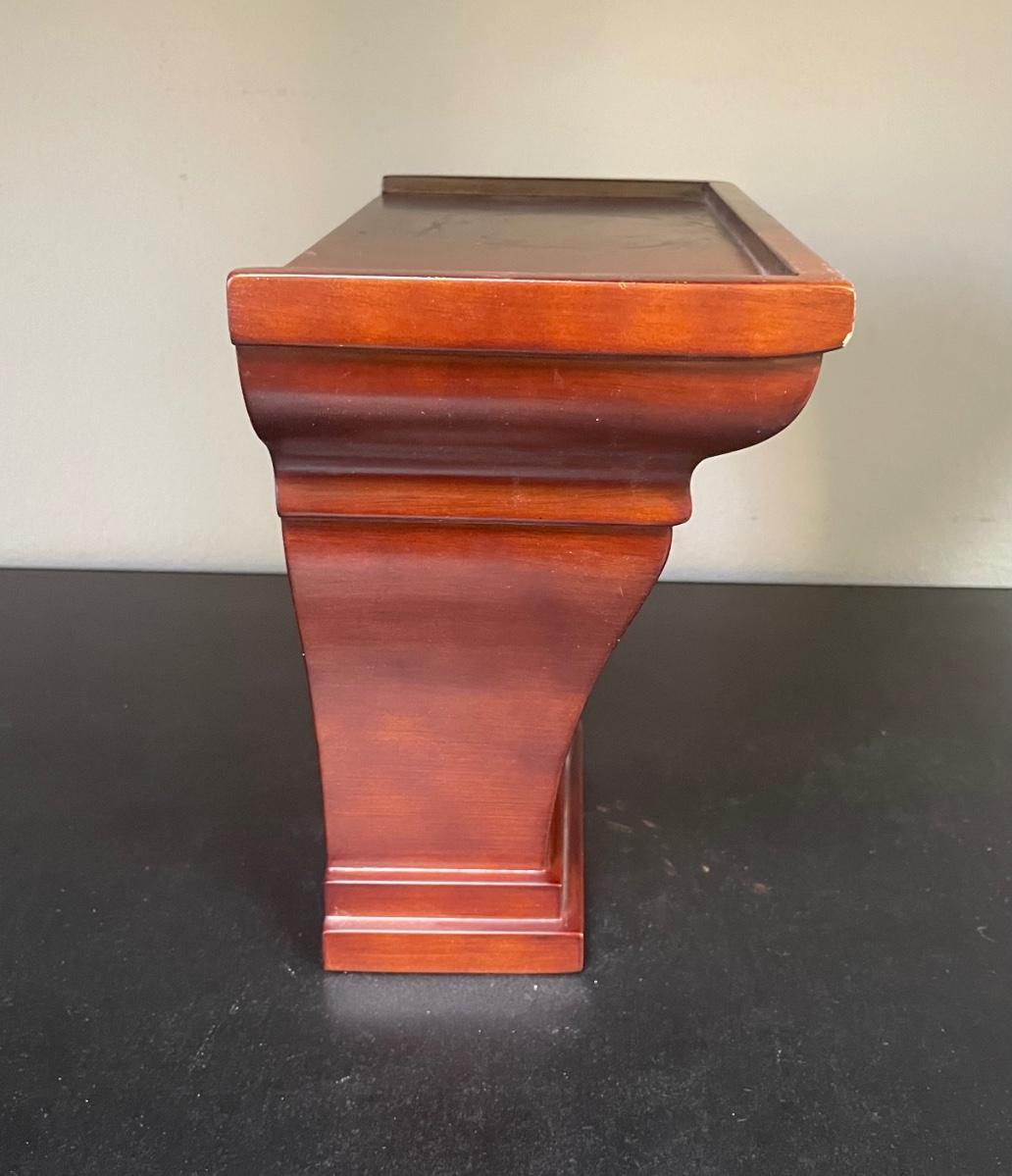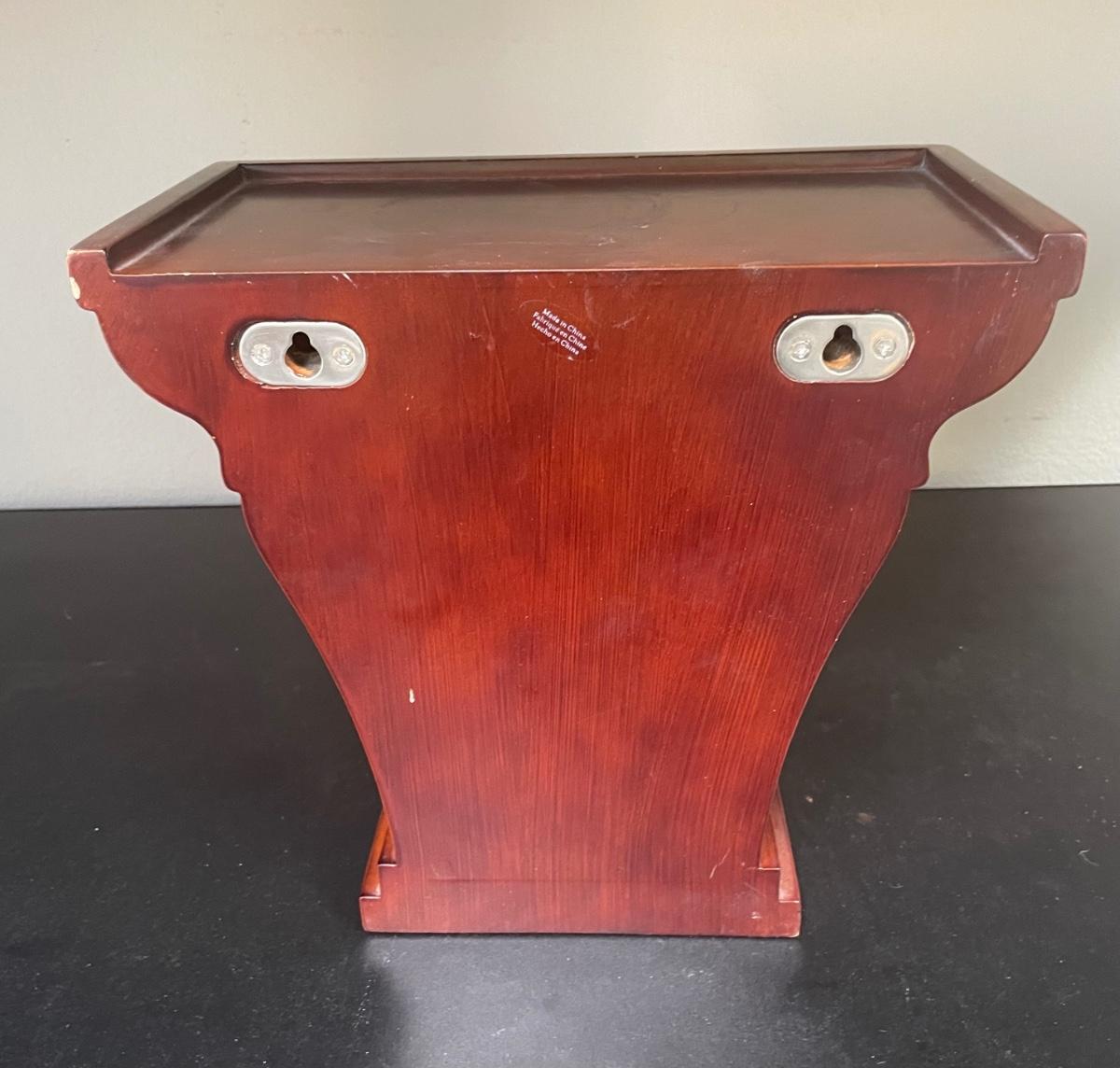 Mantel-Style, medium brown stain. Secures to wall using 2 fasteners (not included). Good condition, measures approx. 10" high and 11" wide across the shelf surface.