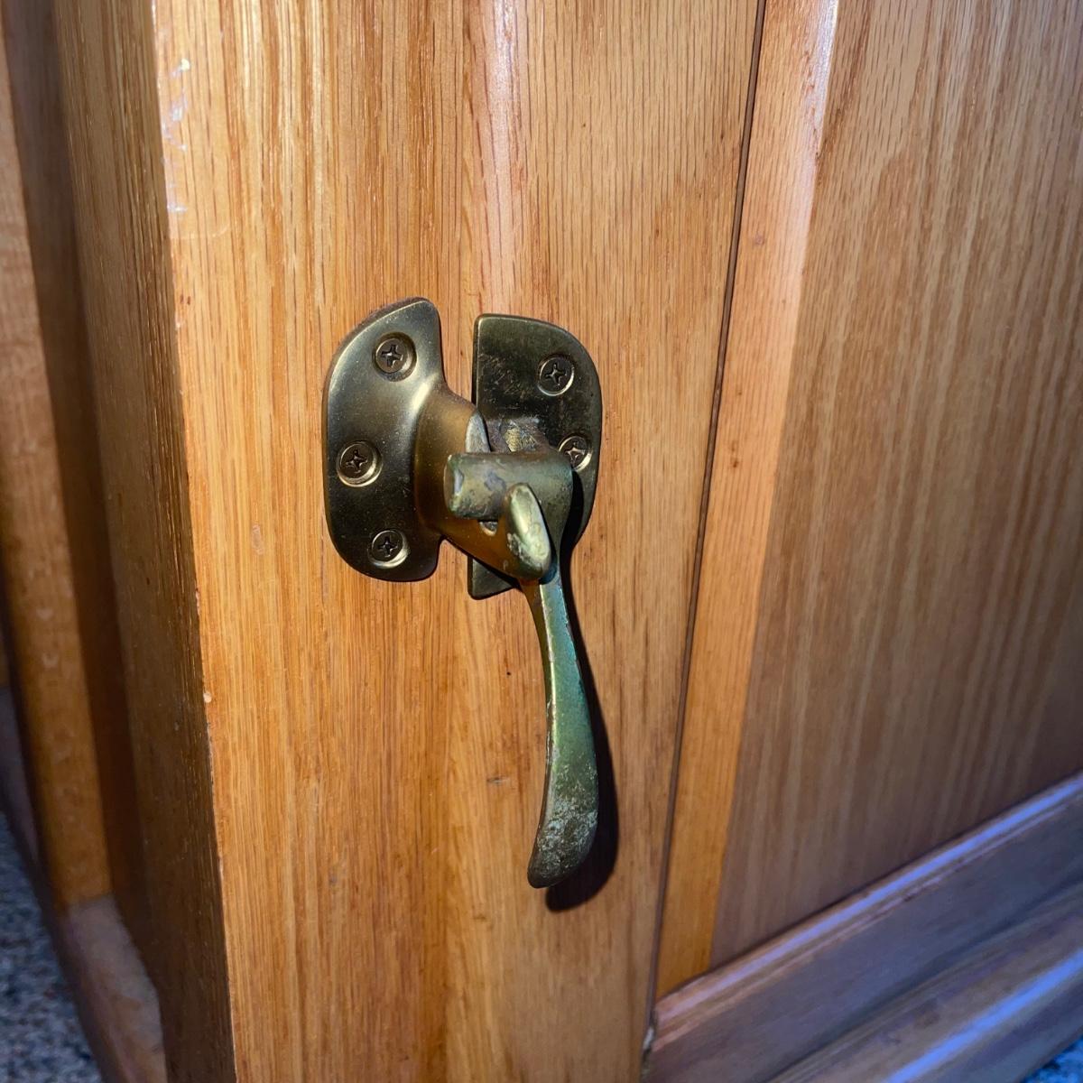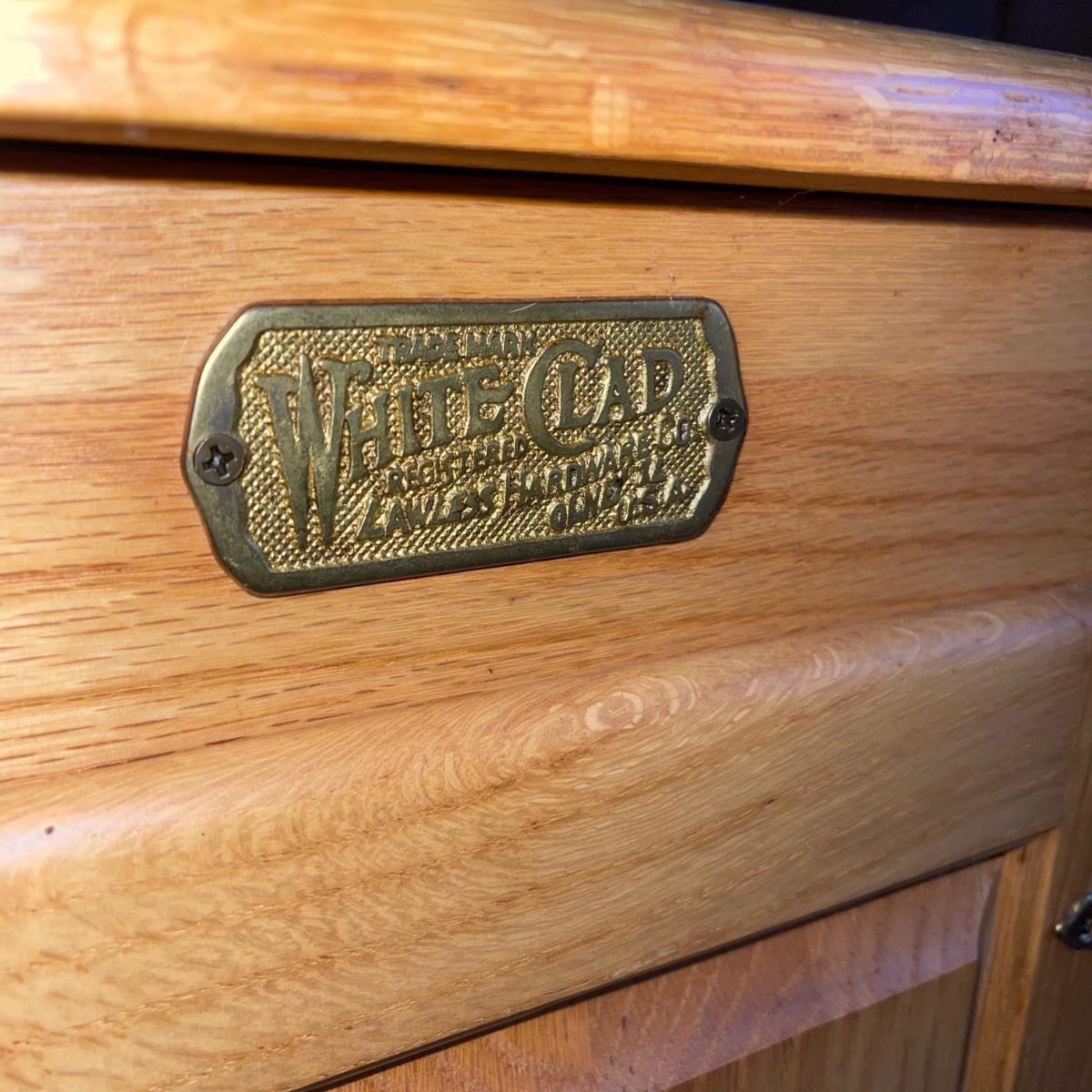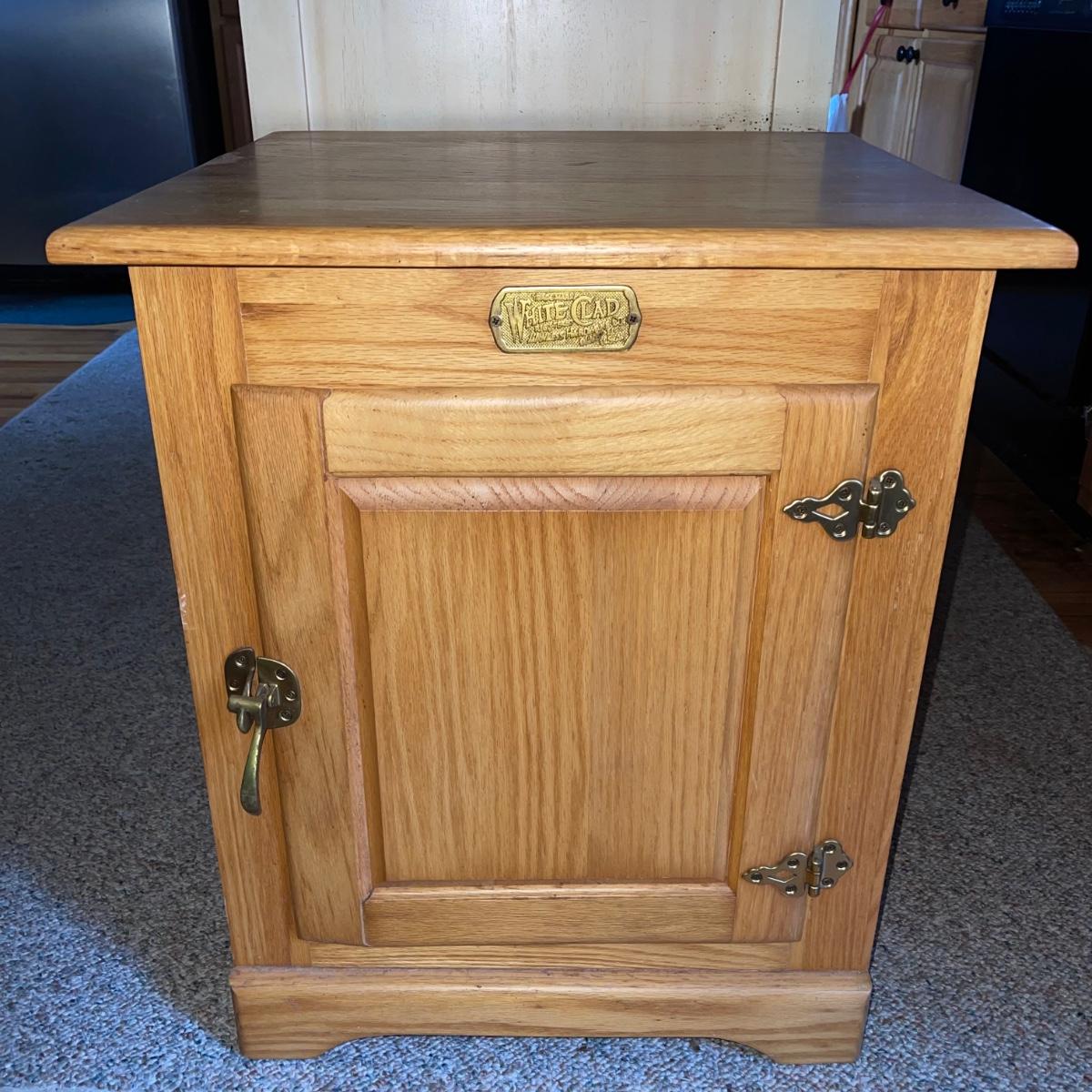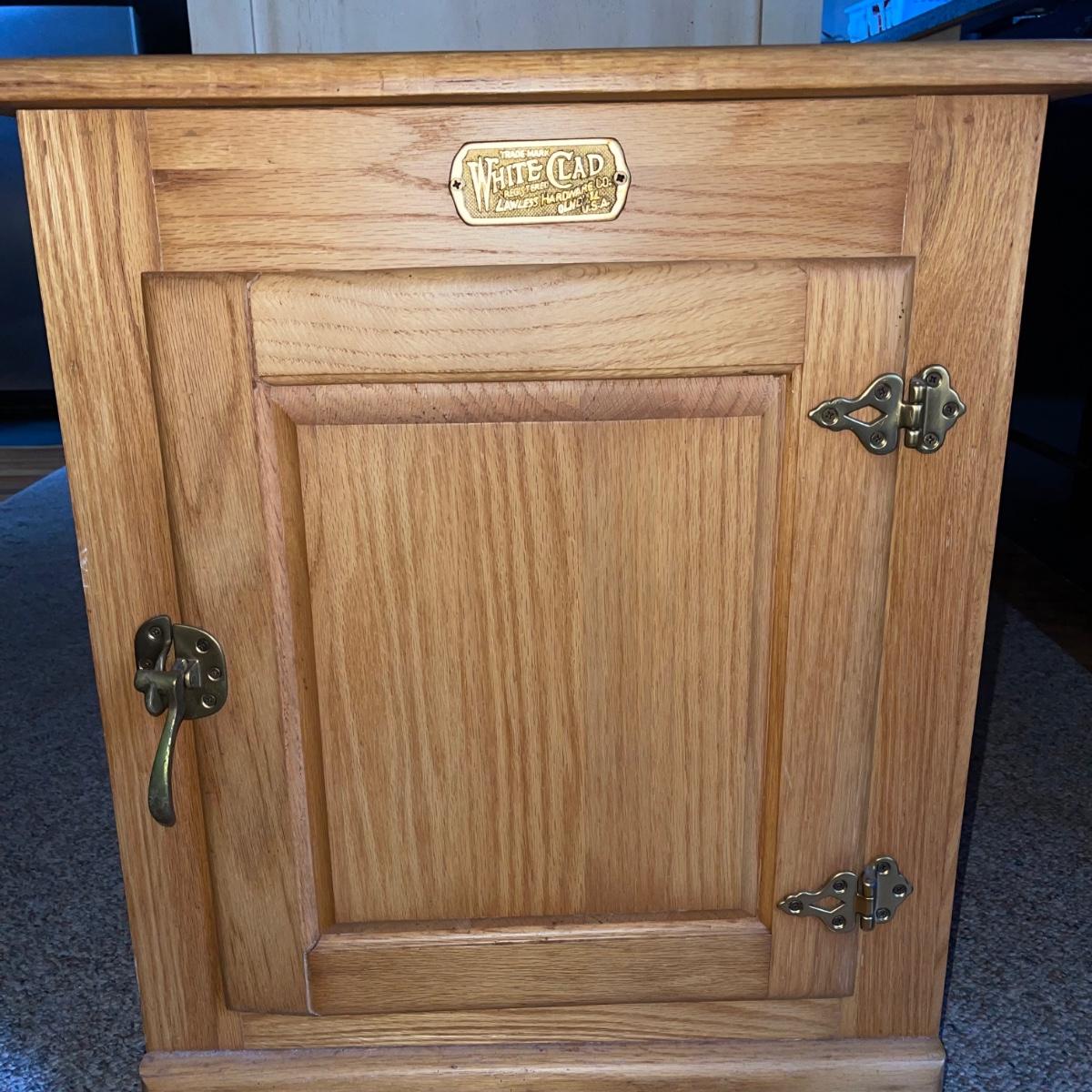 Measuring 22” x 20” x 26”, this White Clad cupboard is wooden and not very heavy. The door is cracked in one place and can be easily glued back into place; door starts closes and clasps. The back says “Furn Village Natural”. Local pickup only.