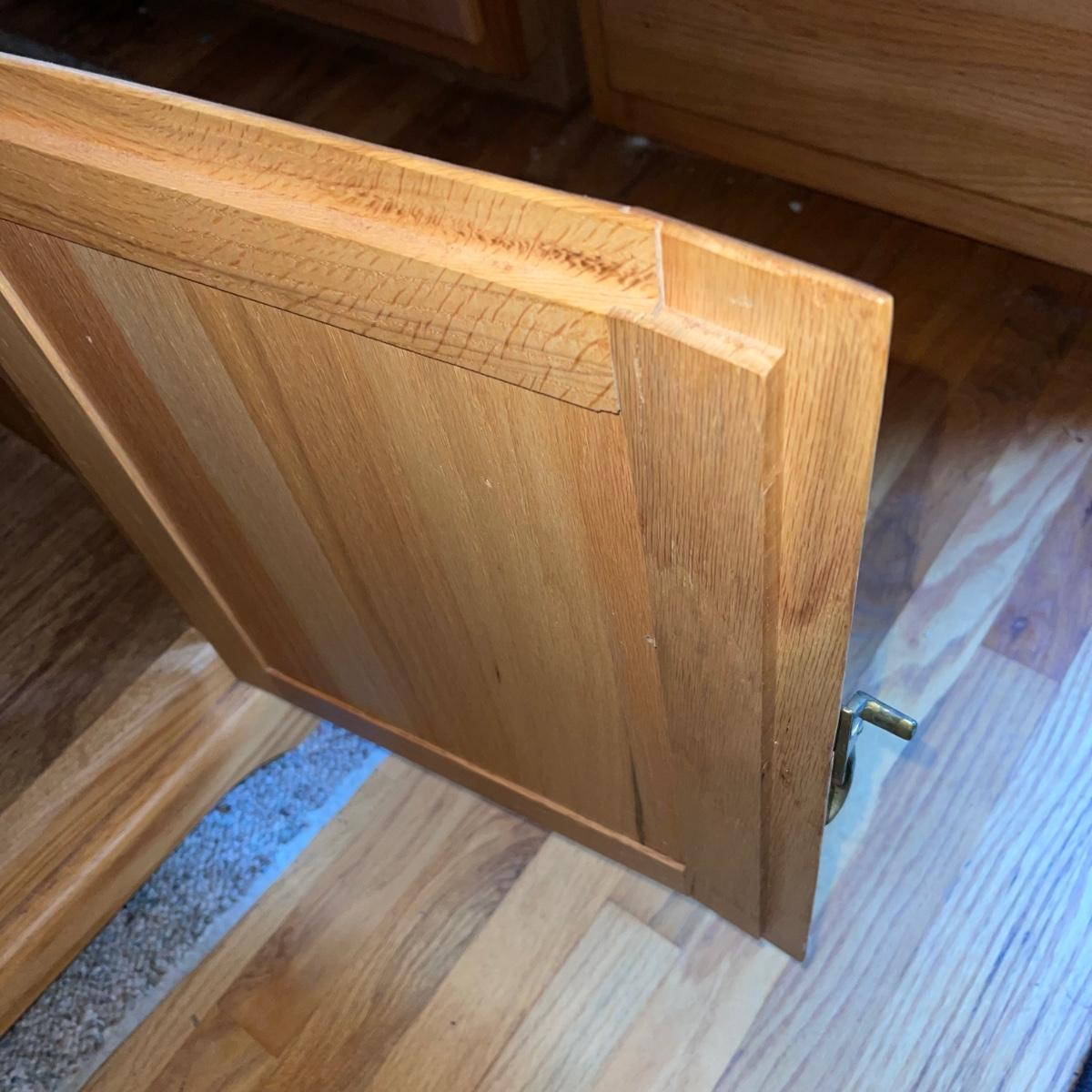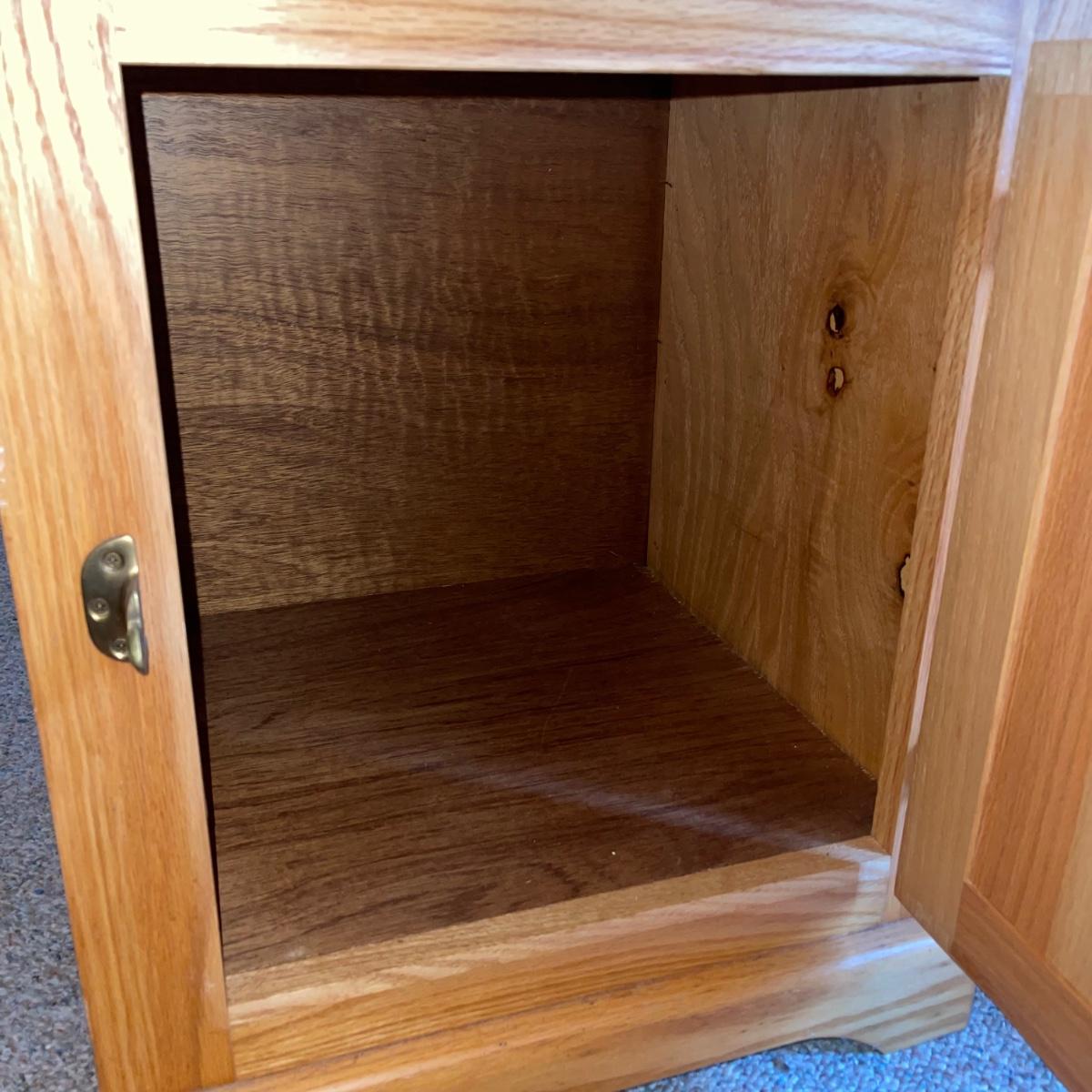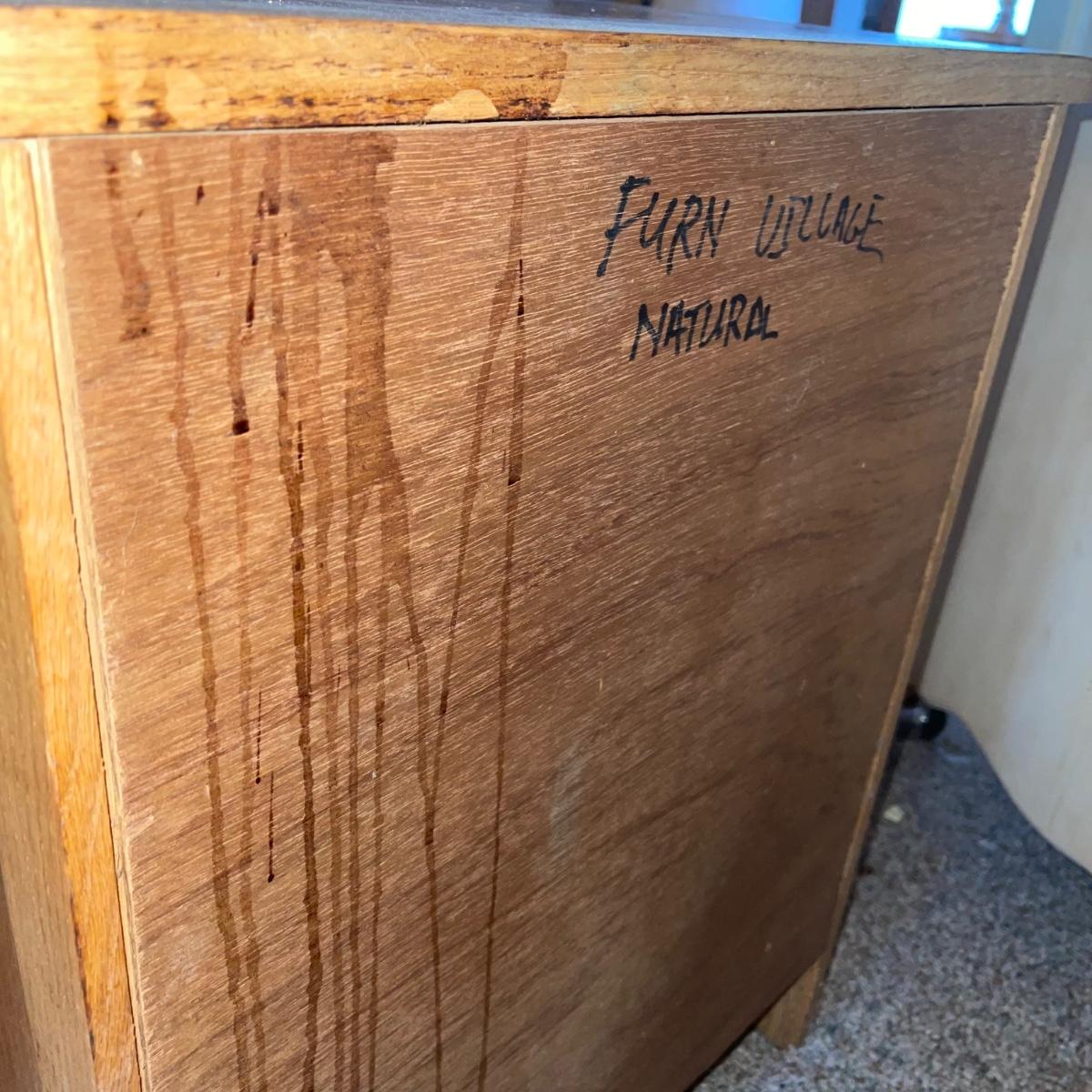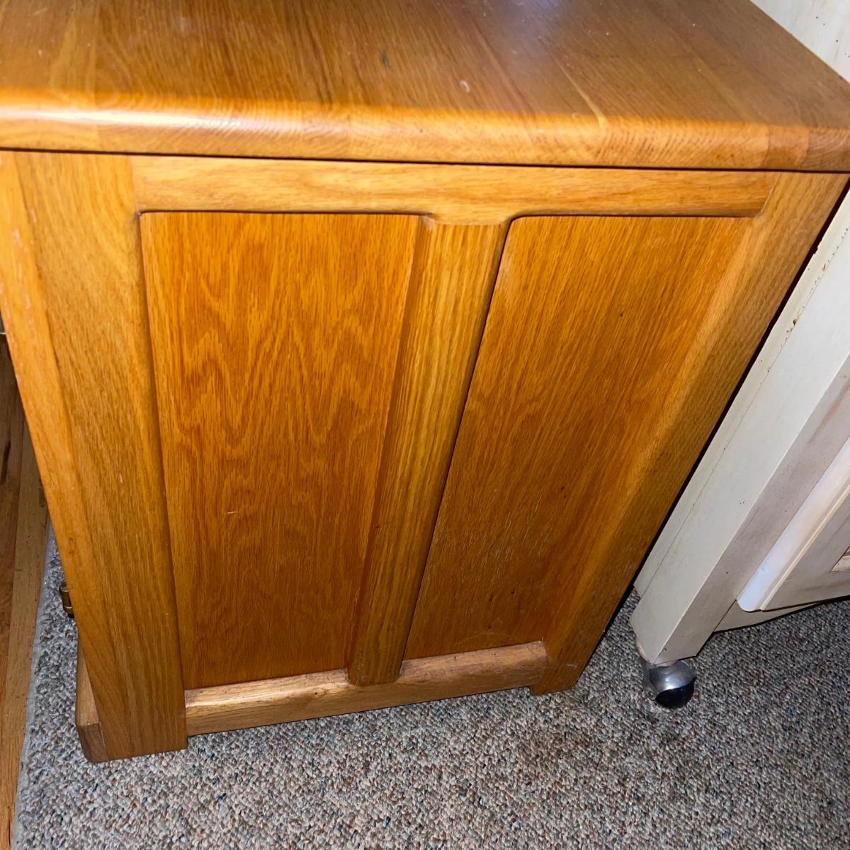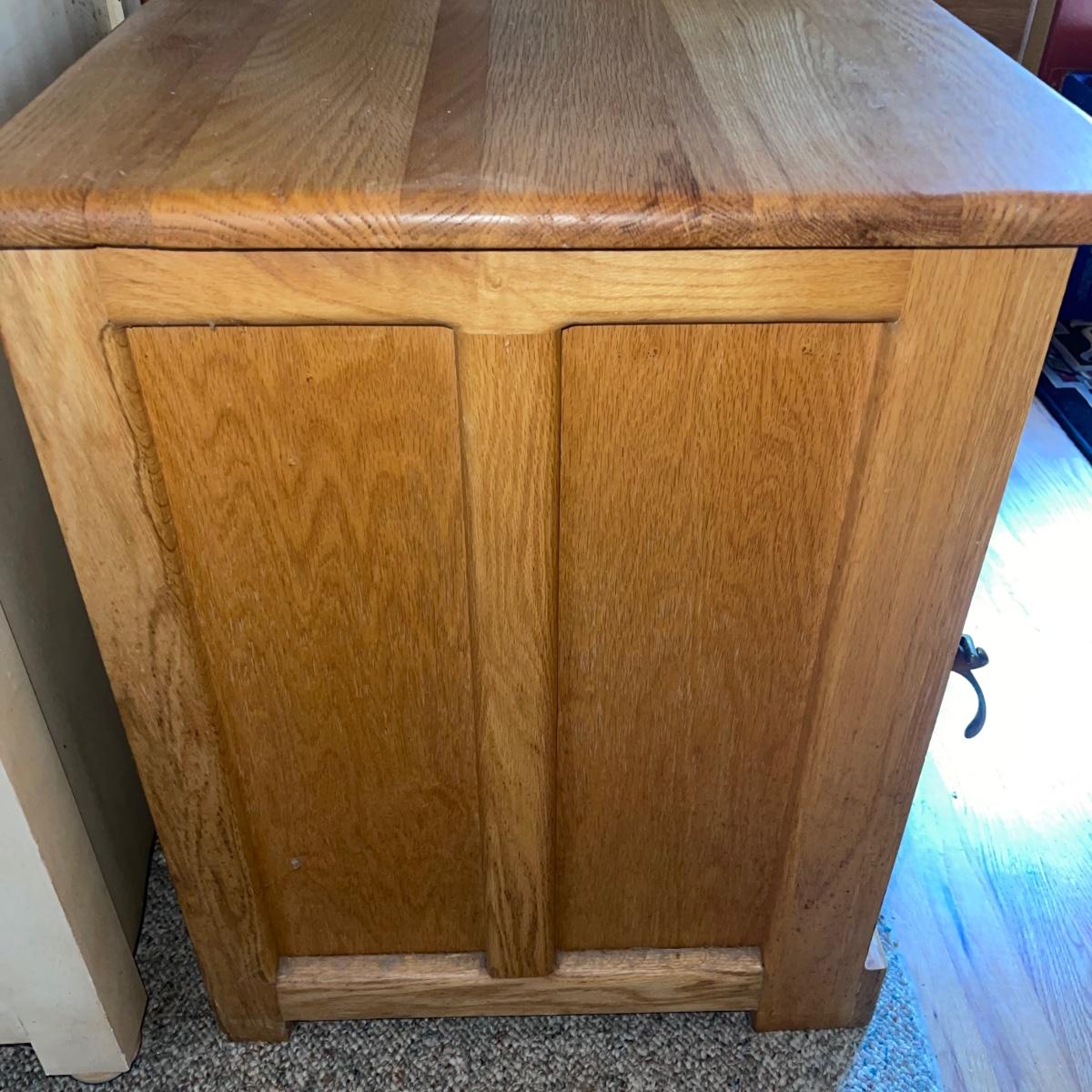 Measuring 22” x 20” x 26”, this White Clad cupboard is wooden and not very heavy. The door is cracked in one place and can be easily glued back into place; door starts closes and clasps. The back says “Furn Village Natural”. Local pickup only.