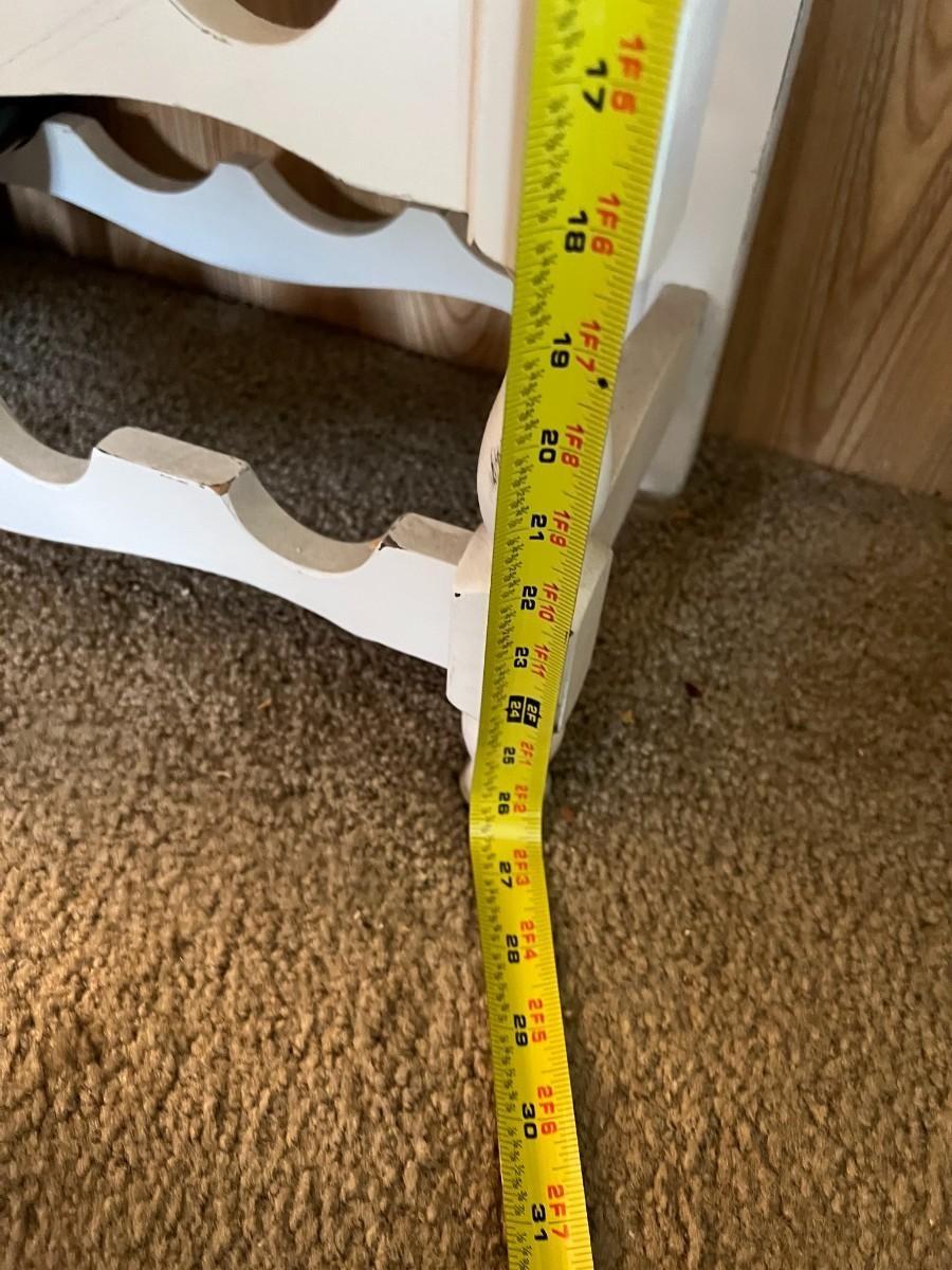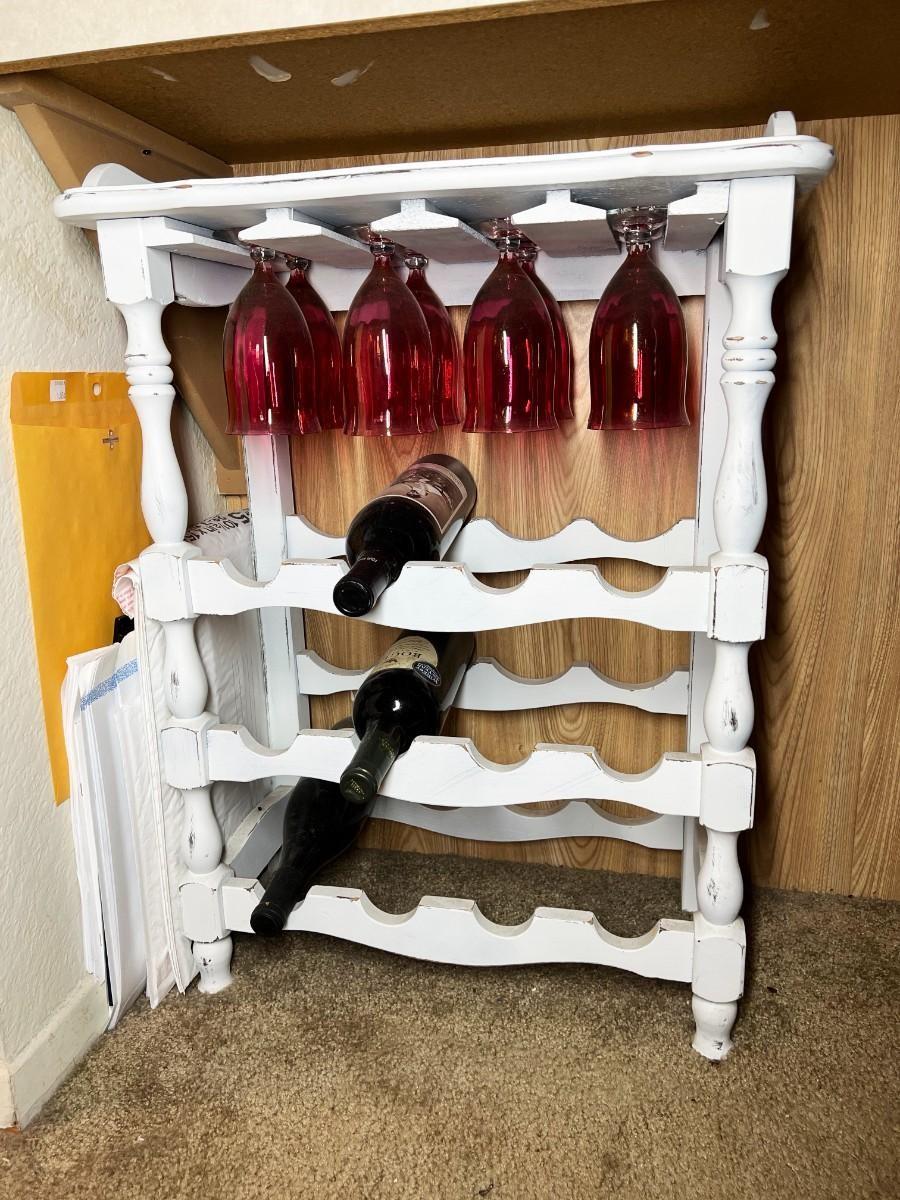 Small White Painted Wood Wine Rack with Glass Storage. In good used condition, can easily repaint if desired. Contents not included. A little over 2' tall. **Off site in Brea, owner downsizing. Pick up will be as early as July 22nd at 2pm, must be scheduled before the 29th.**