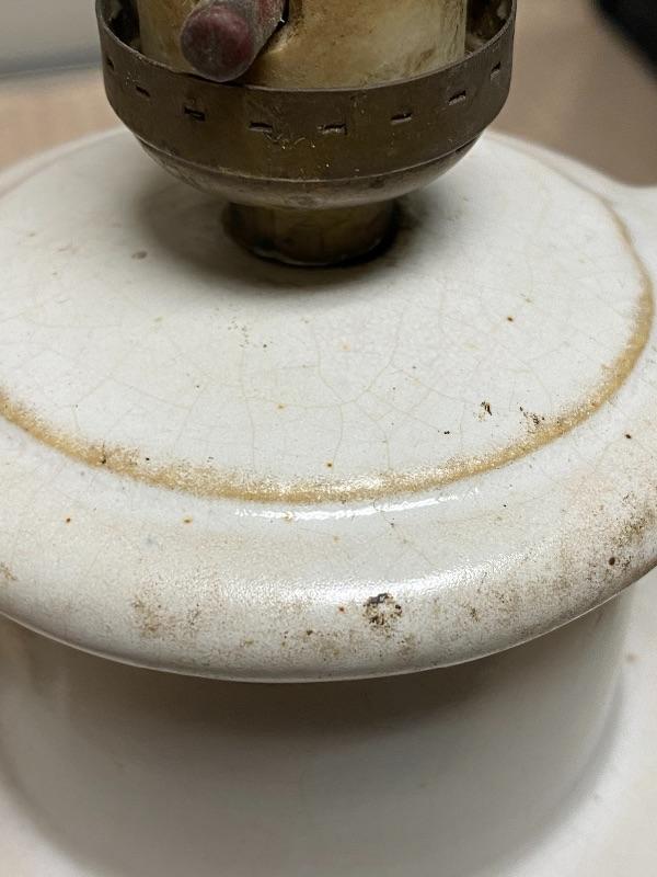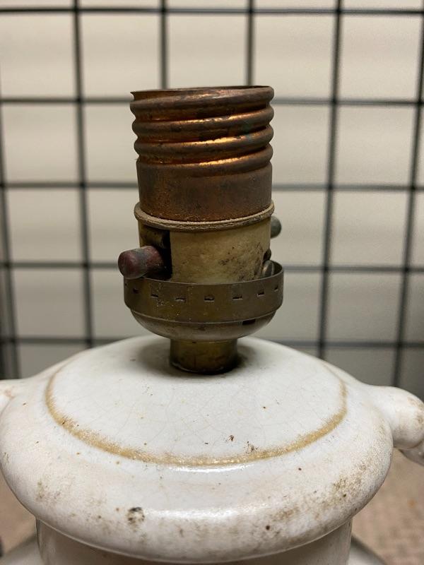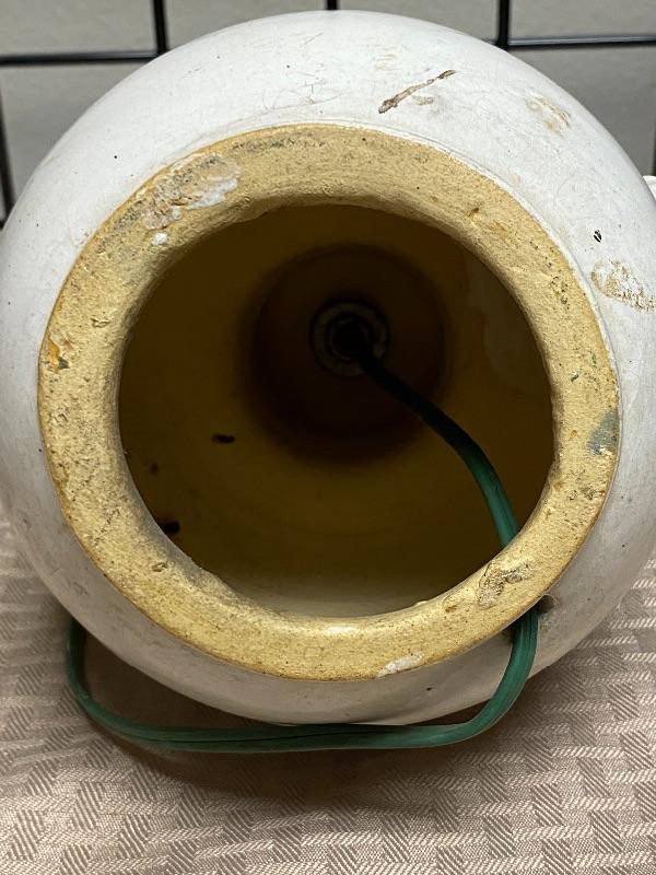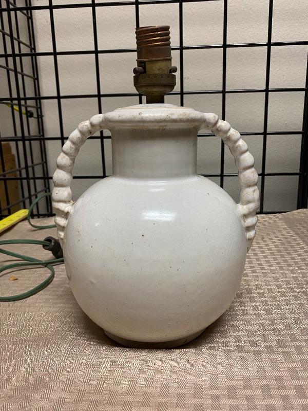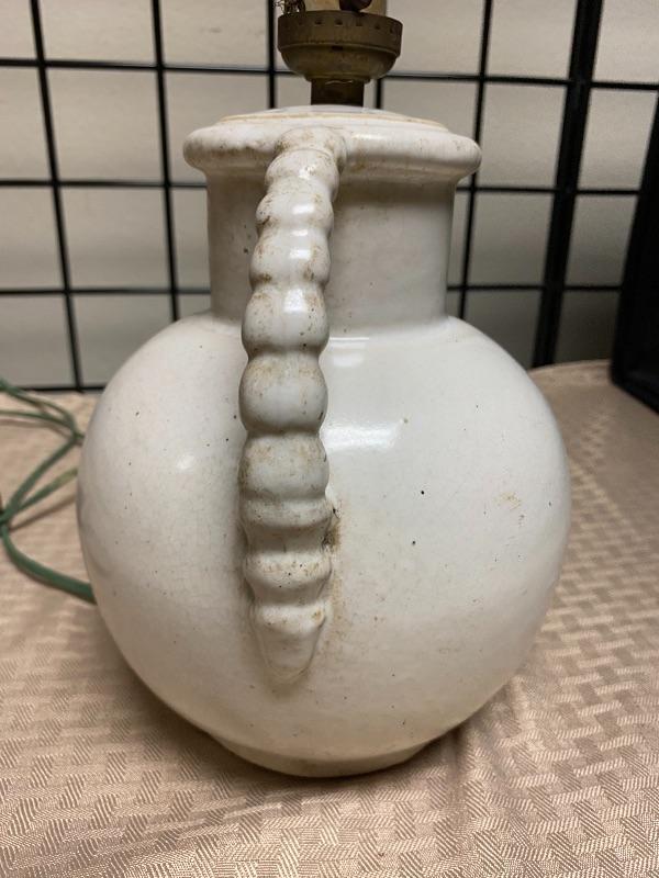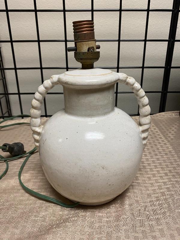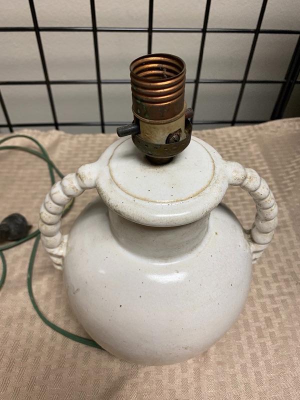 Small vintage white pottery table lamp. Rustic white glaze has slight crazing. Small size about 12". Untested.
