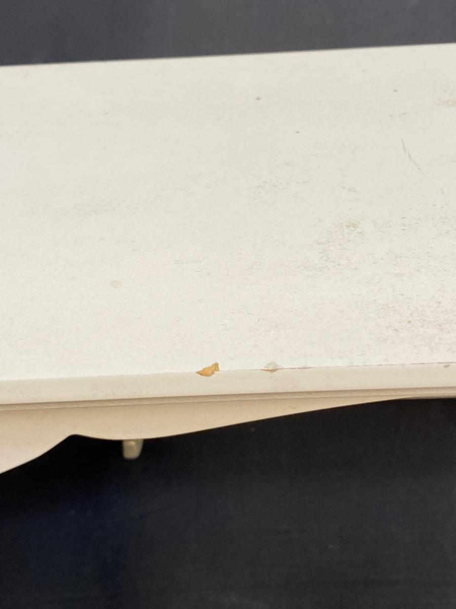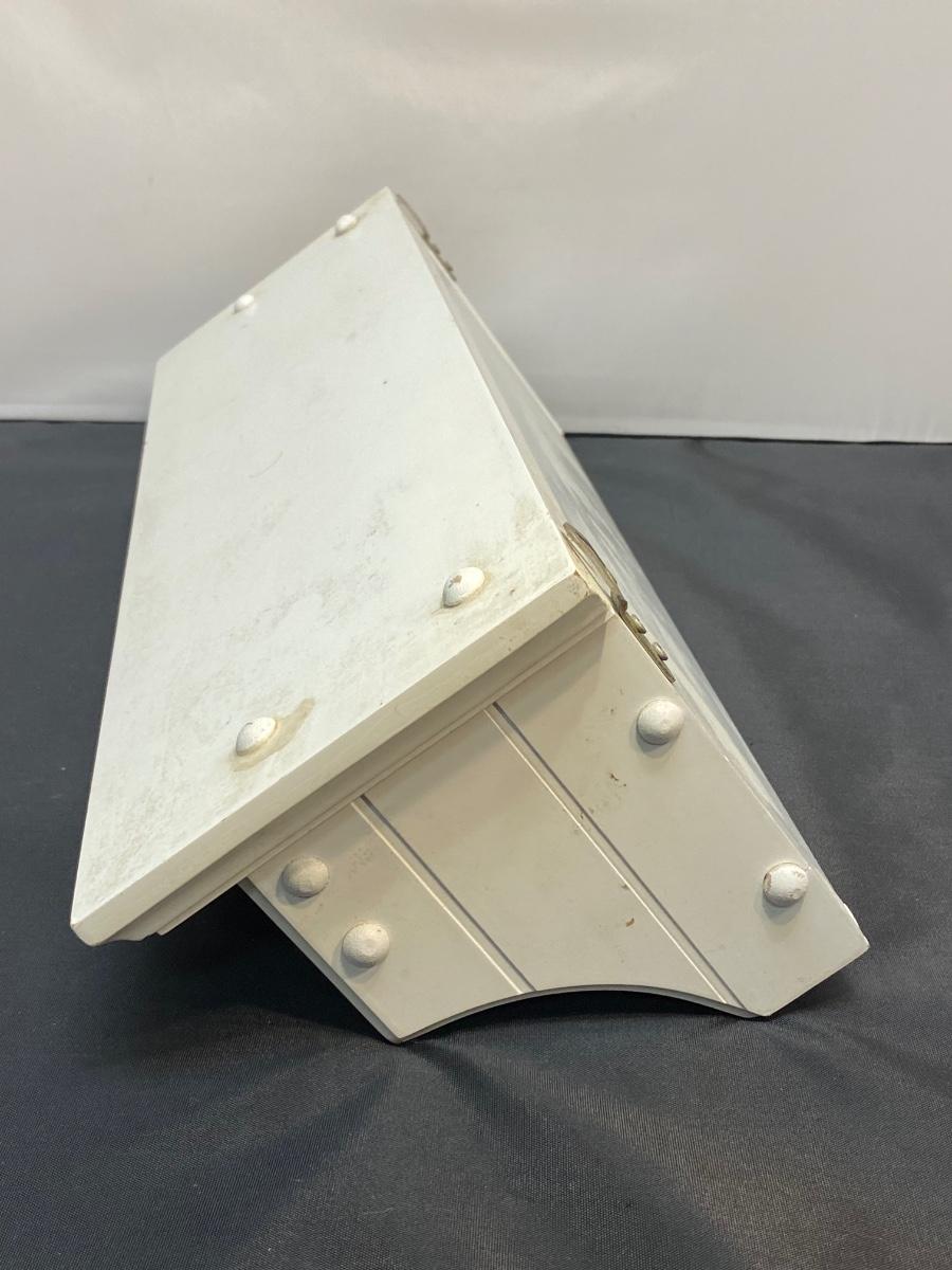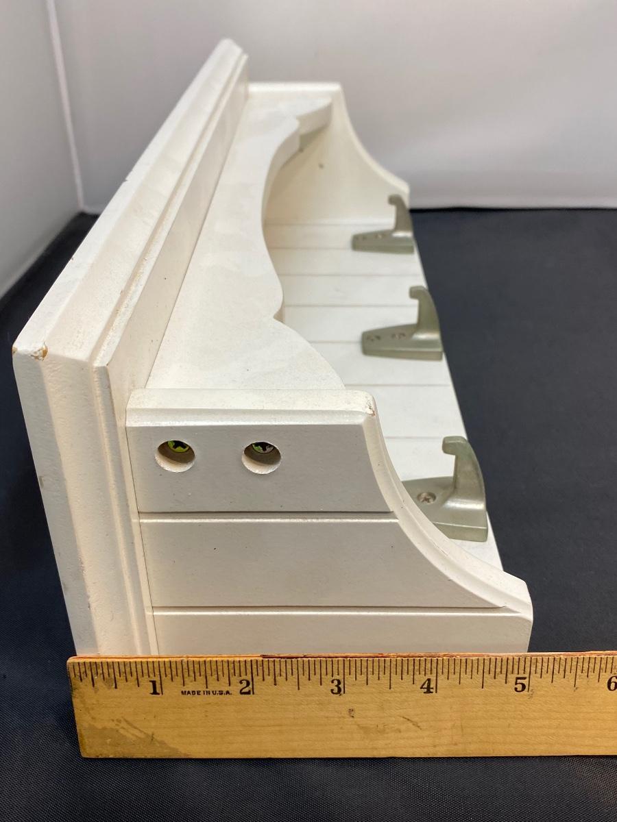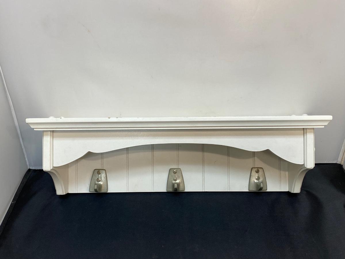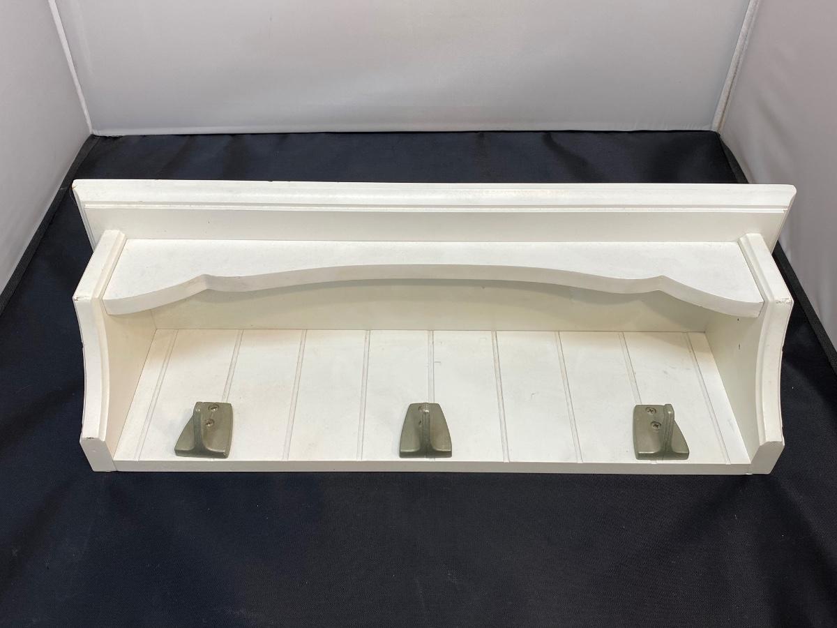 Decorative white shelf with three small hooks. About 18" length. In good condition, some light signs of age and use.