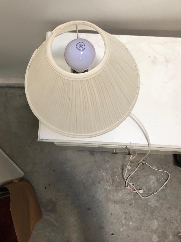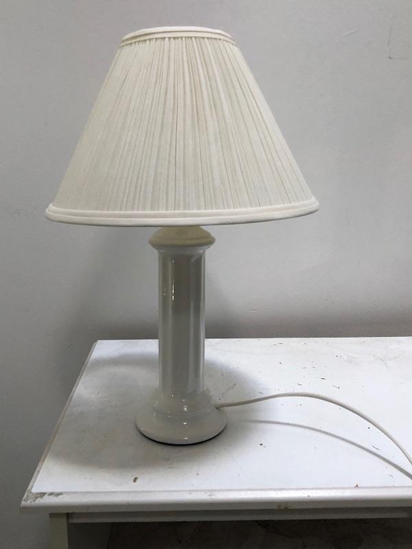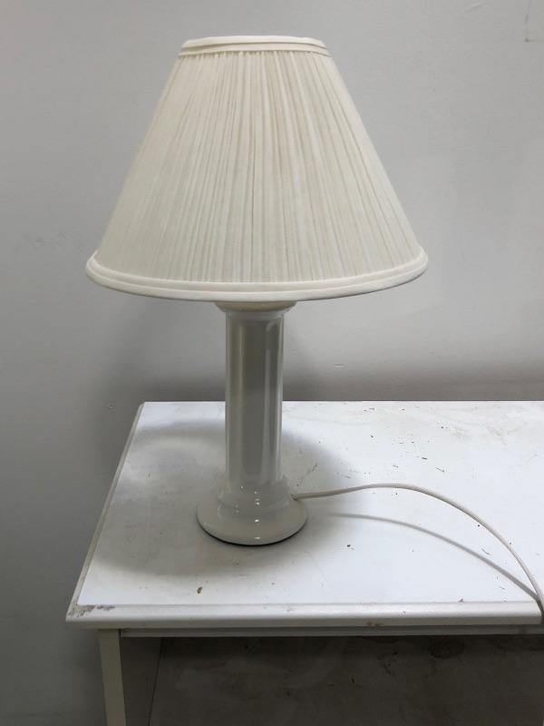 Small white ceramic table lamp. Has white lamp shade. Great for on a night stand.